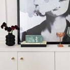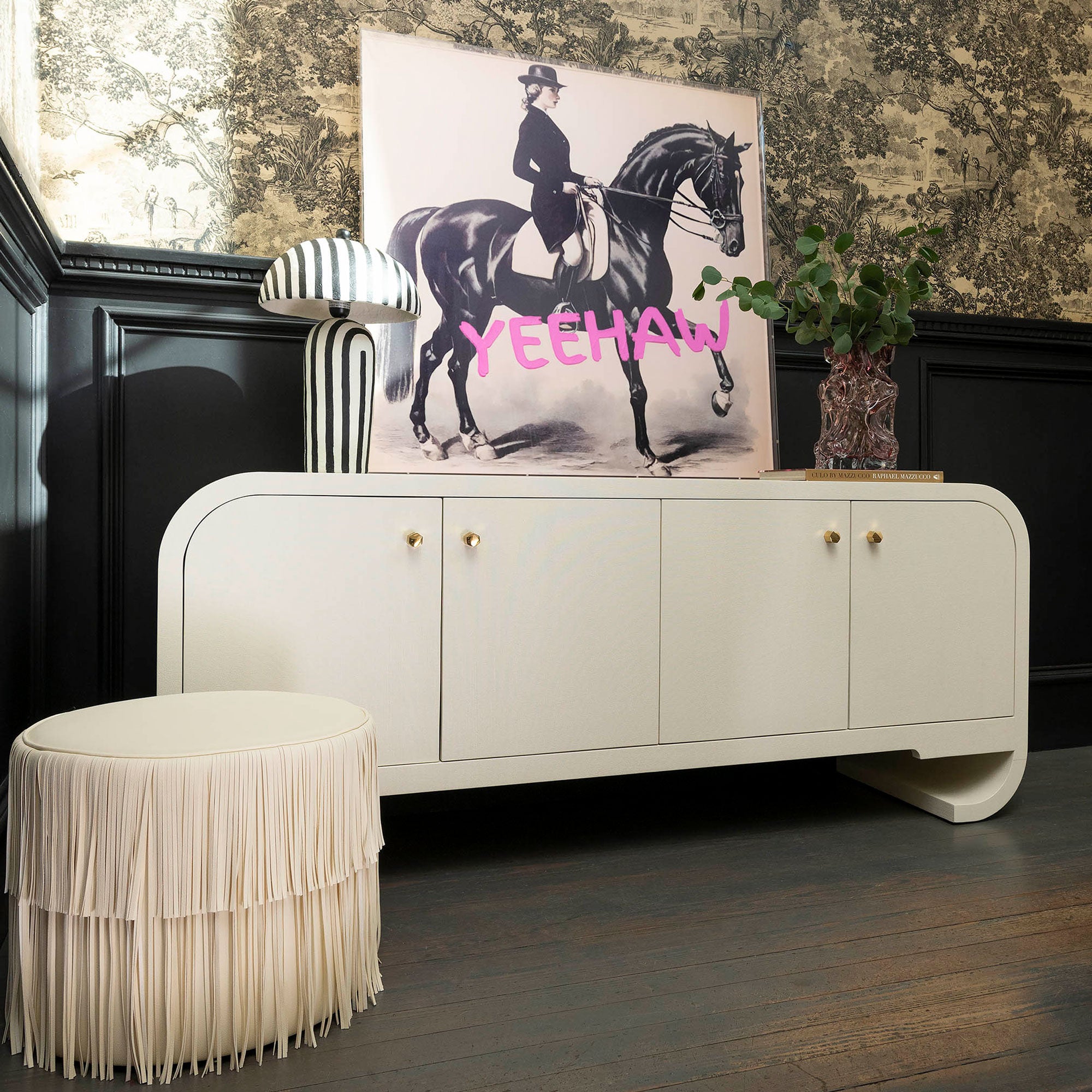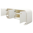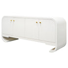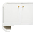 Featuring vintage-inspired drama with modern haute style, the Ruse credenza is an irresistible choice for any interior. Subtle brass knobs adorn each ivory faux linen finished door on this waterfall beauty, while interior shelving provides ample room to store in style.