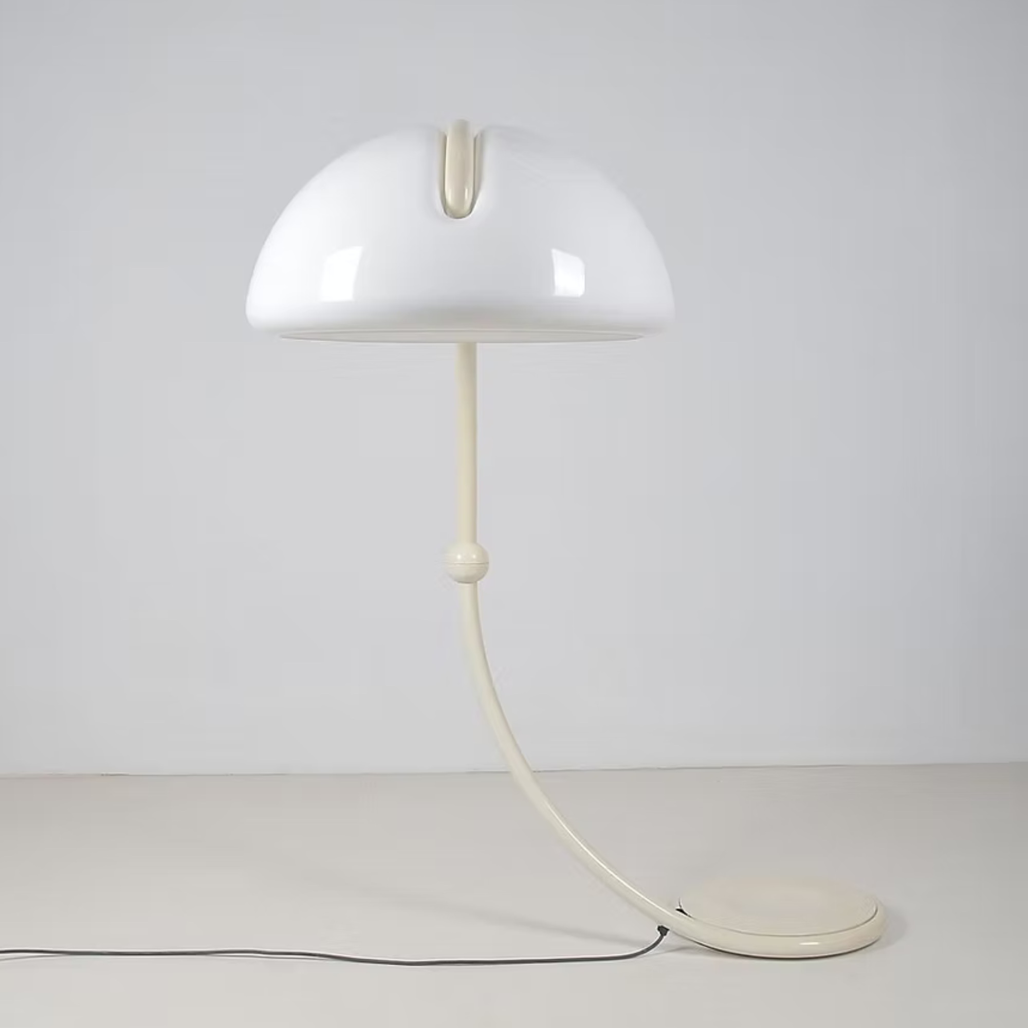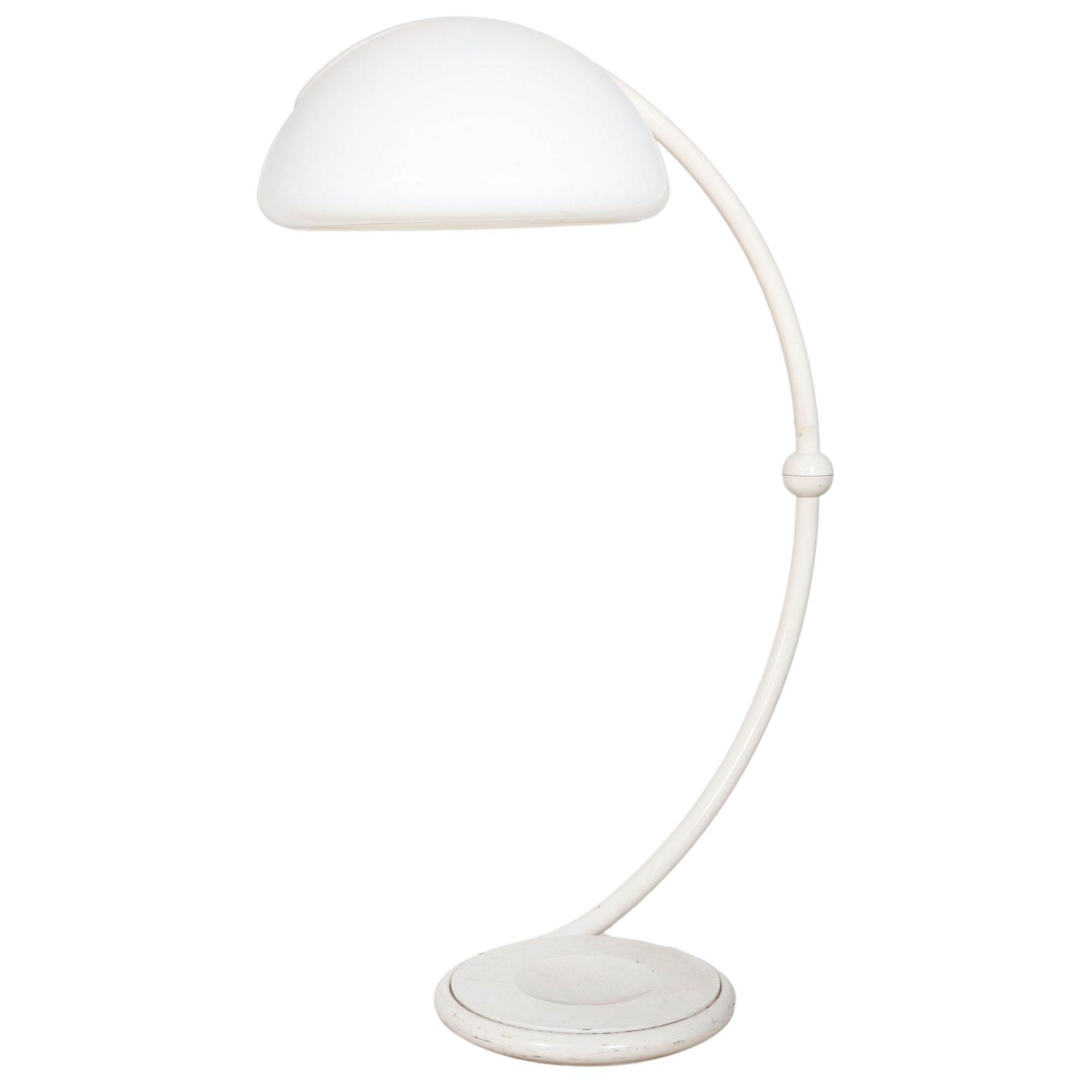 A classic of 1960s Italian design, it features a molded white acrylic dome shade and lacquered metal body—futuristic then, timeless now.