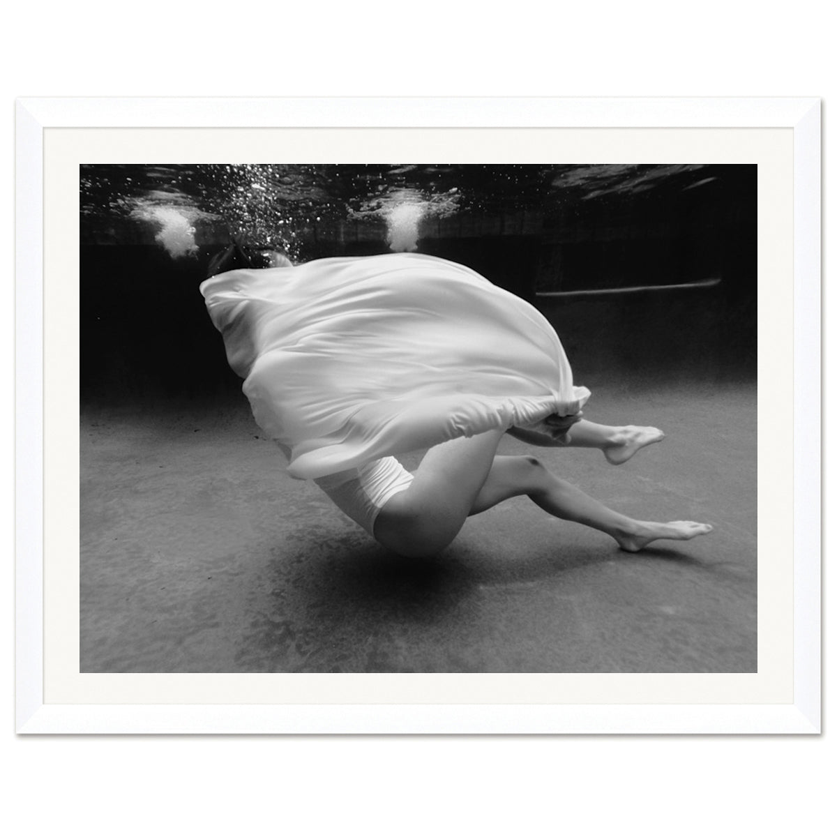 Photography print by Jessica Roark featuring a subject underwater with clothing. Printed on fine archival paper and framed in white.