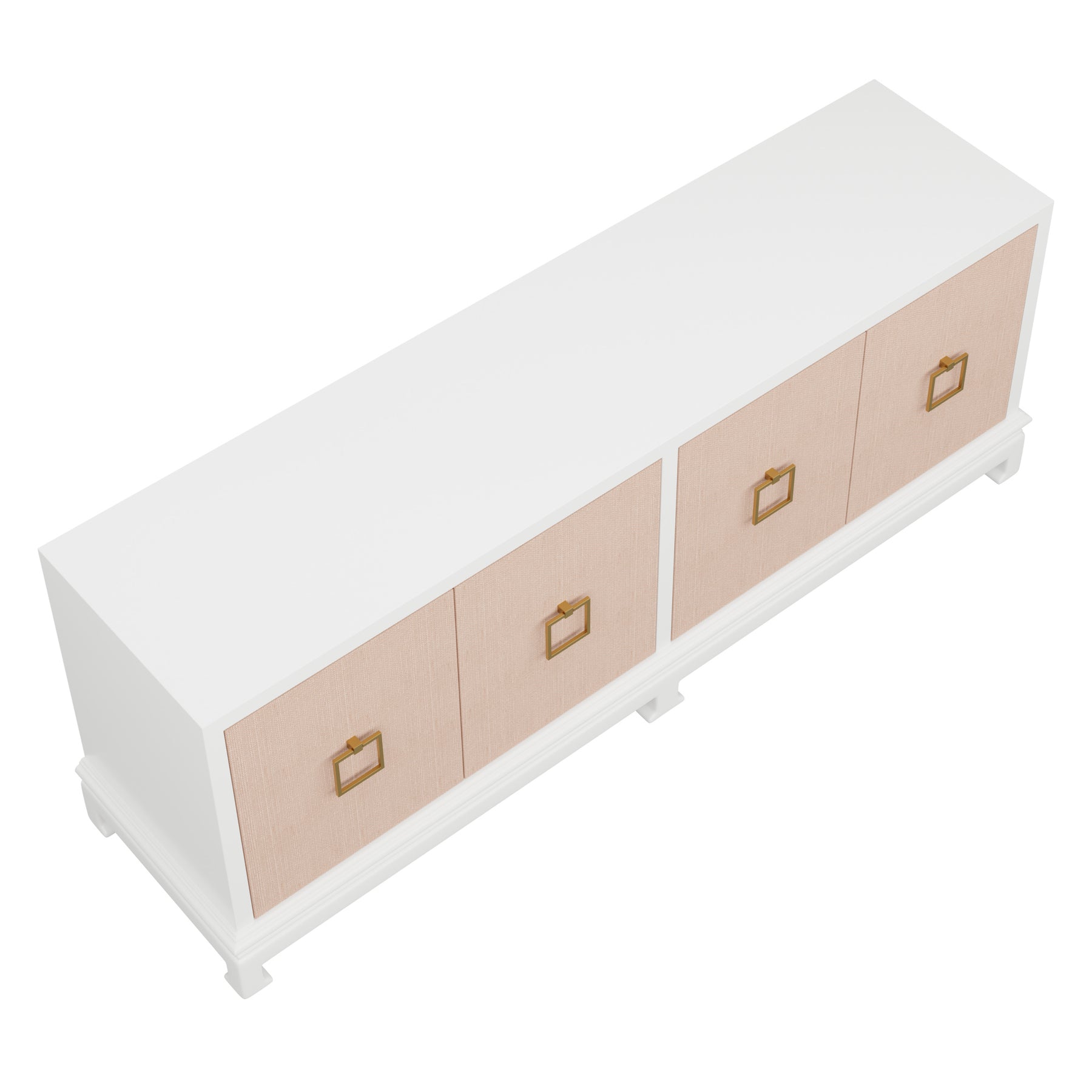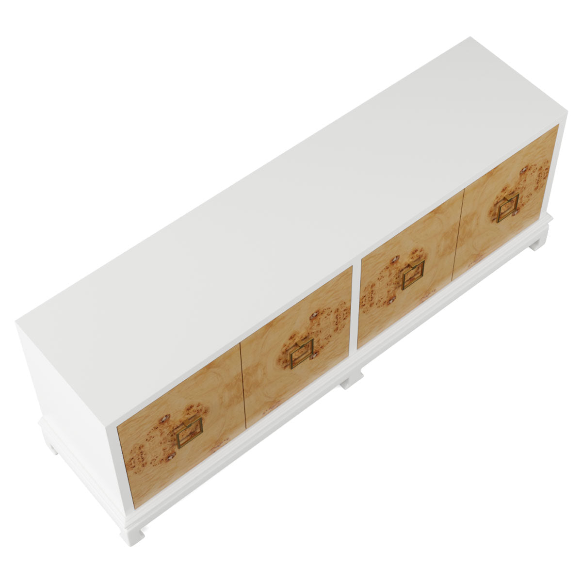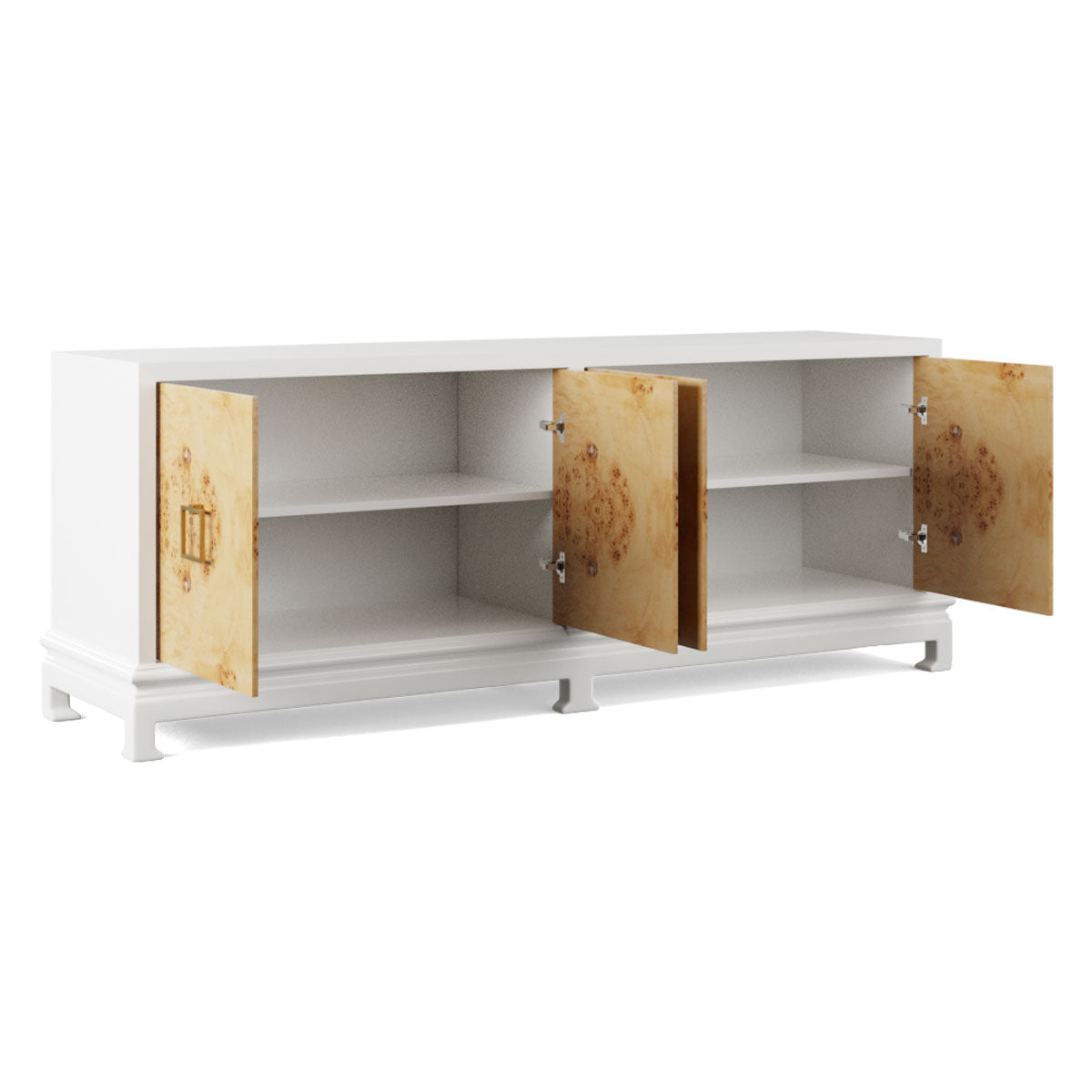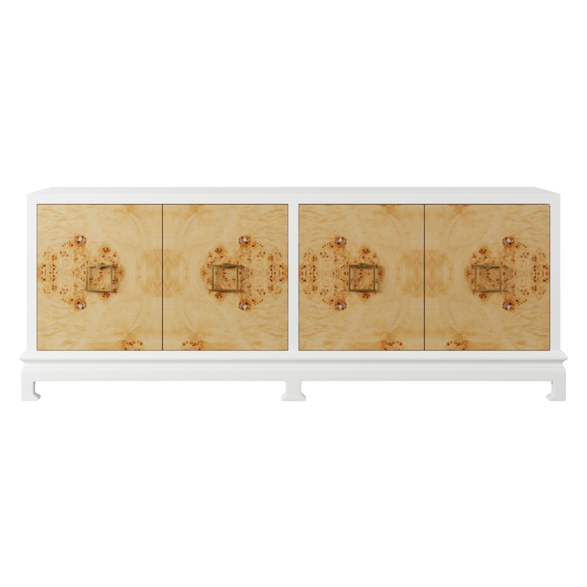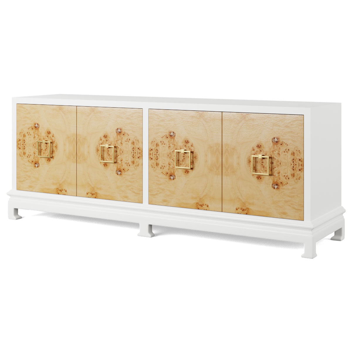 Our bespoke Yates Credenza features modernized Ming legs for a lewk both current and classic. Square brass ring hardware pops on the two cabinets with one adjustable shelf in each.