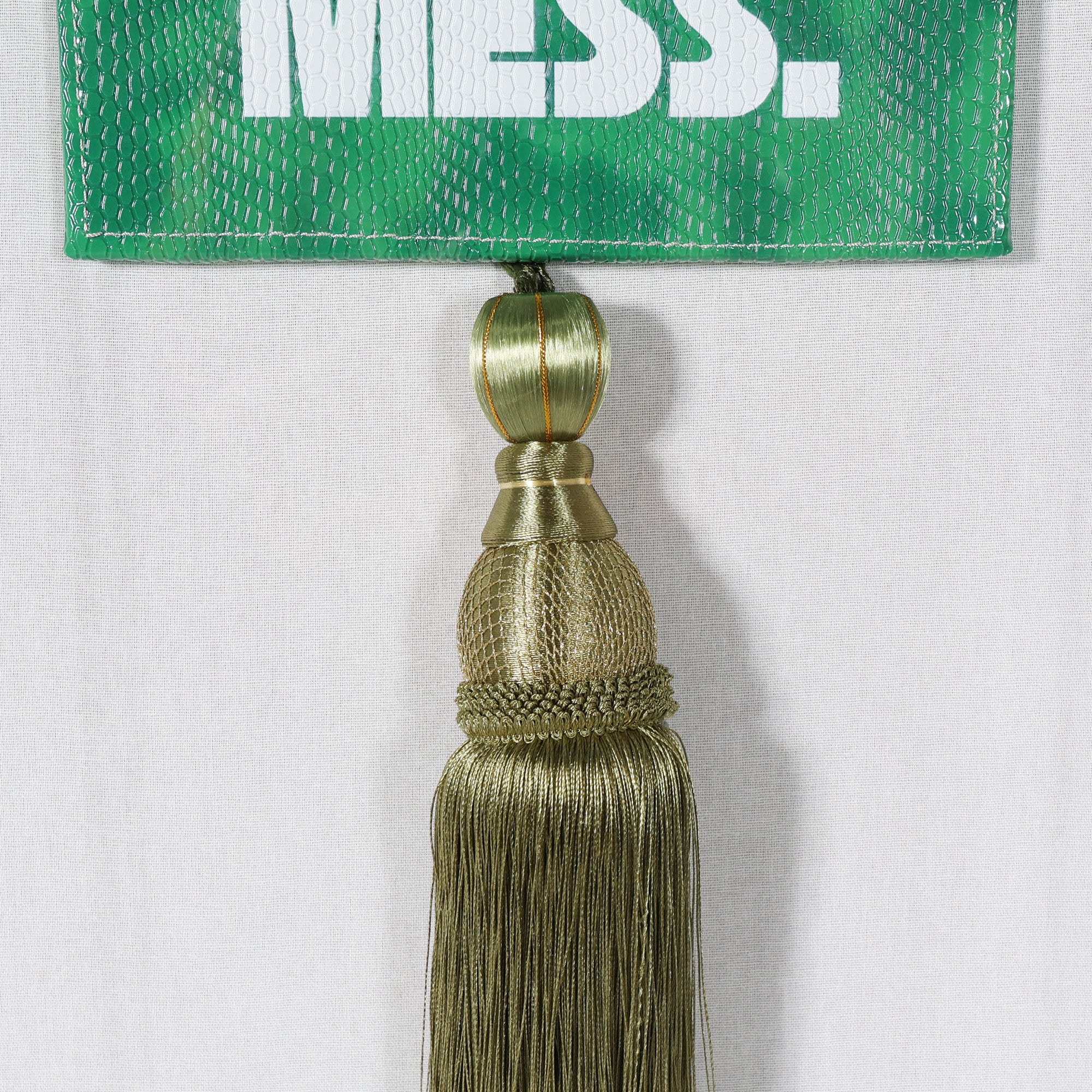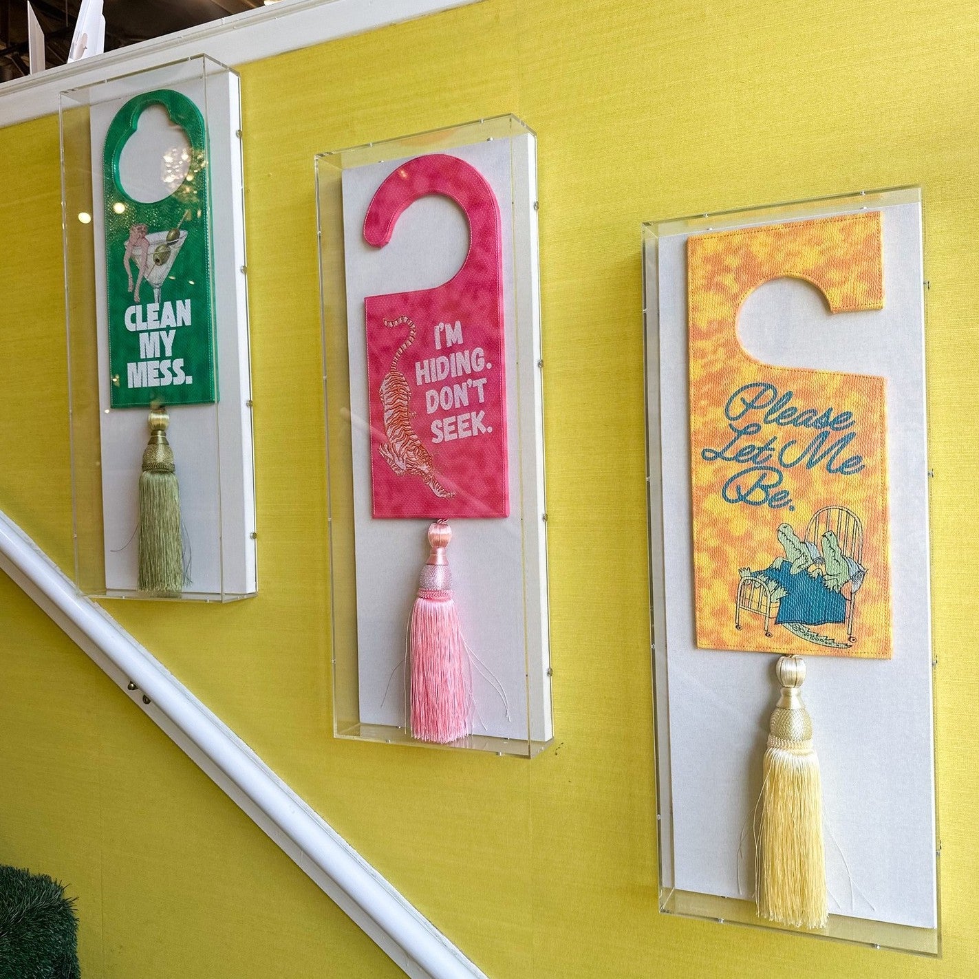 This playful hotel hang tag art series by Tat Frederick displays bold moods with one-liners painted over colorful faux snakeskin leather. Finished with swishy tassels for extra flair.