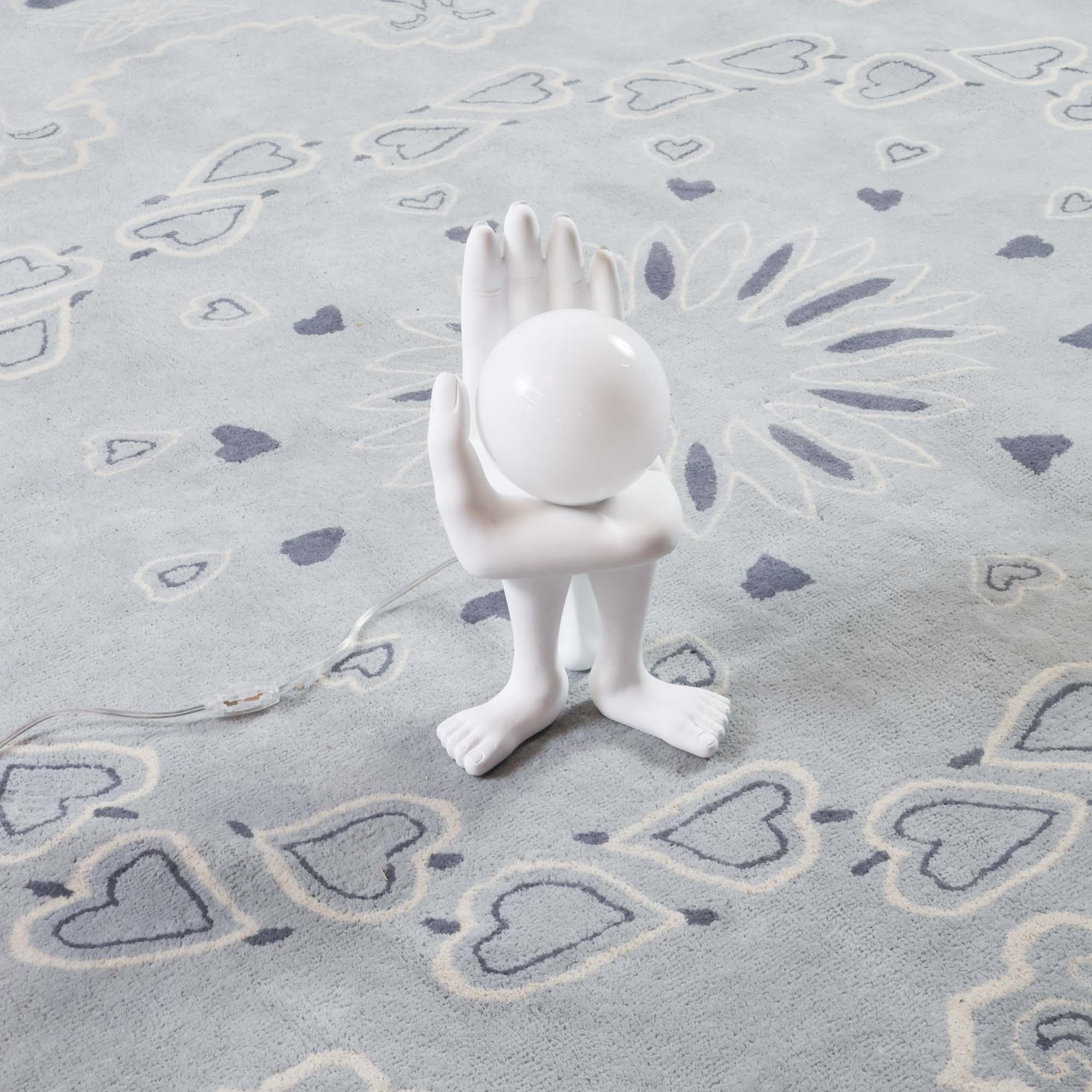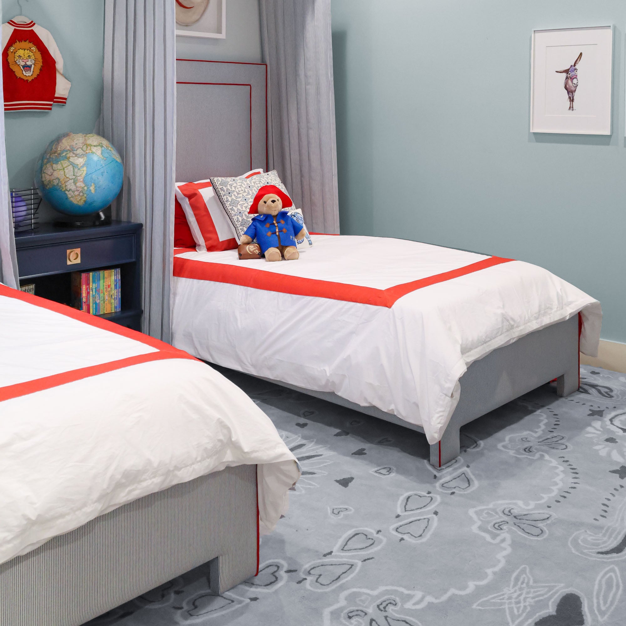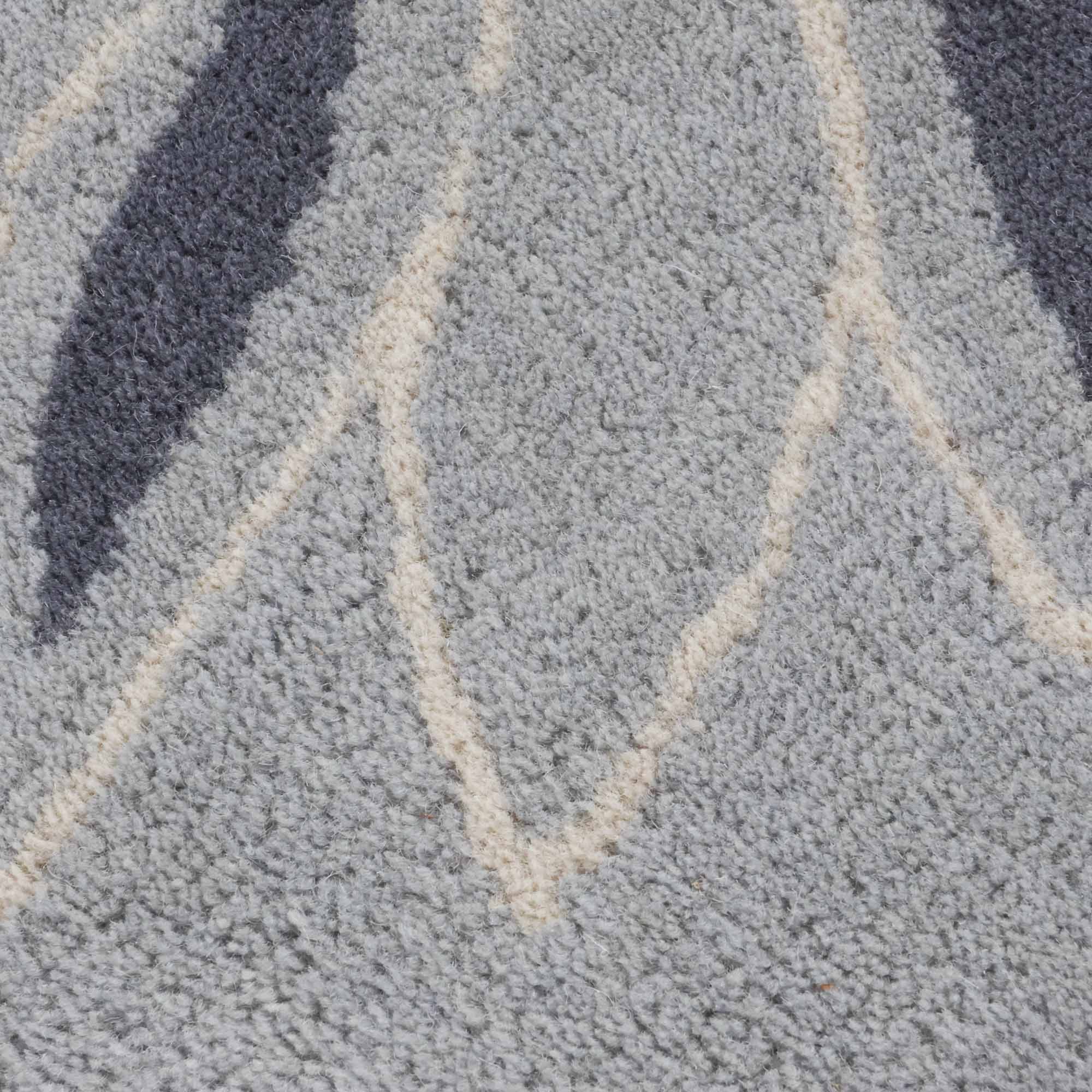 This custom rug was designed by Scout and hand-tufted by artisans in India. It features a durable wool pile that's super soft underfoot and neutral blue grey hues.