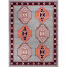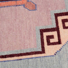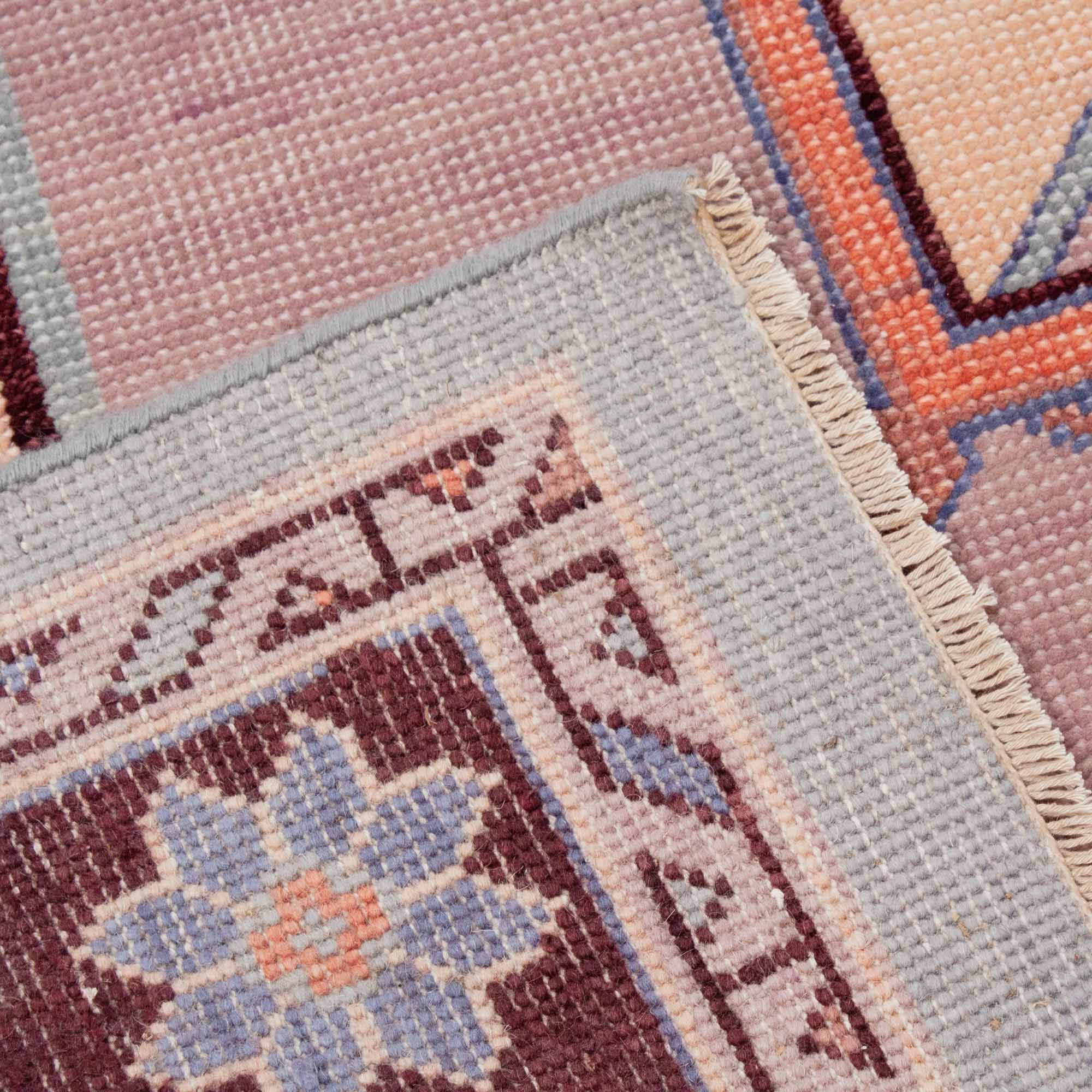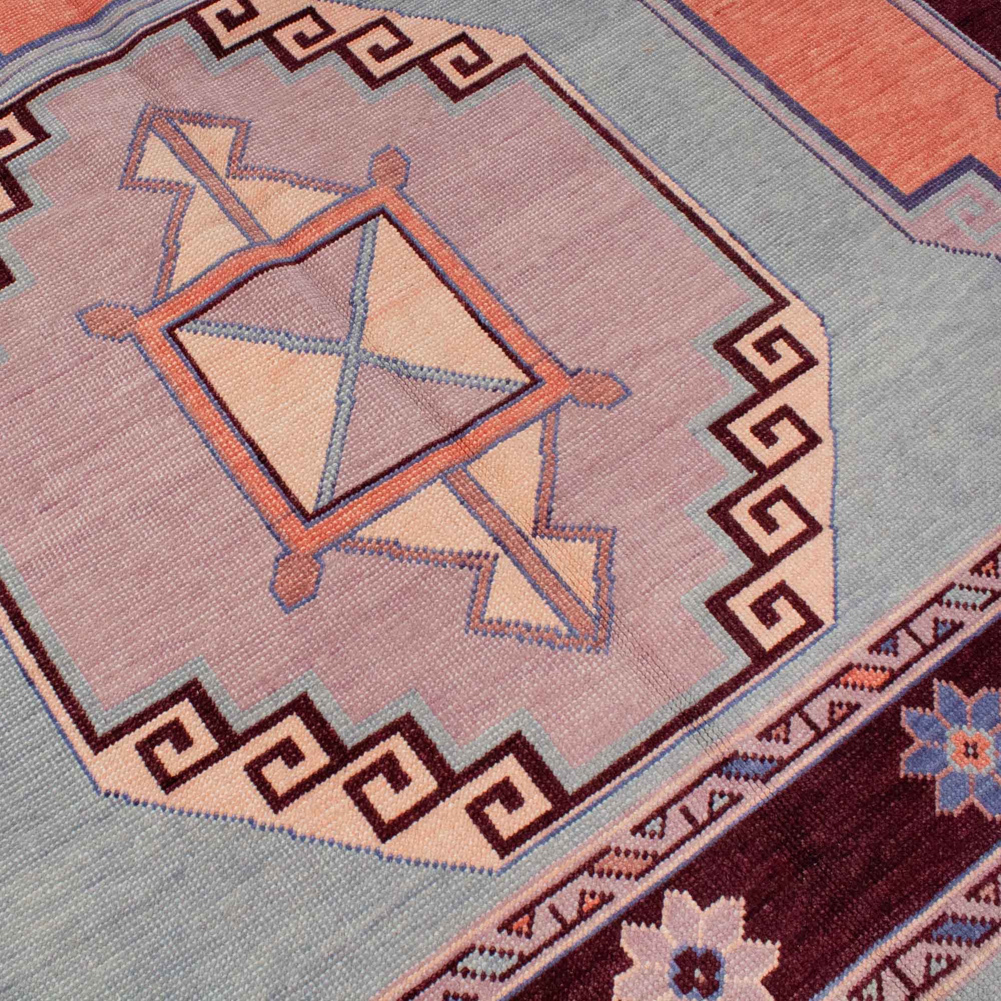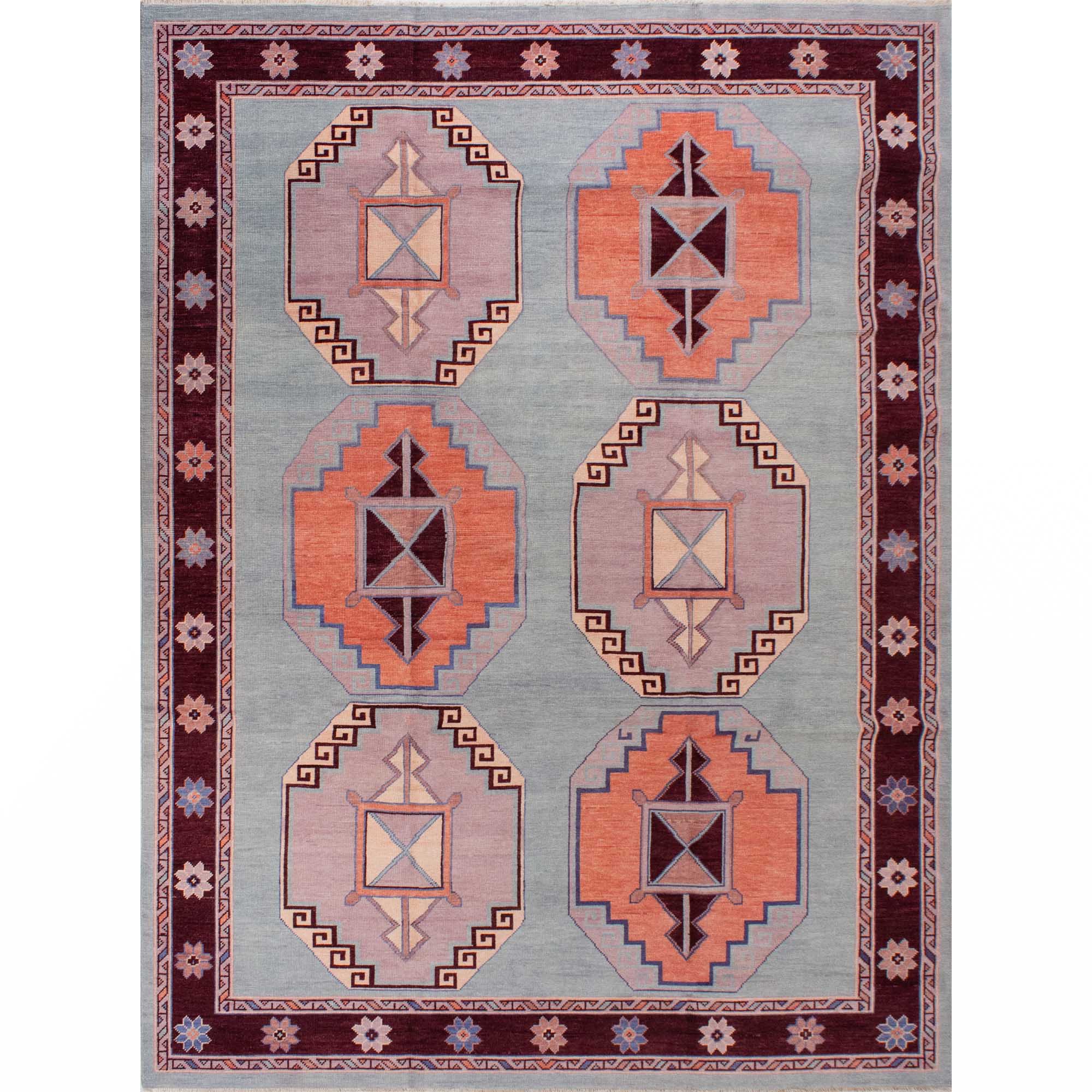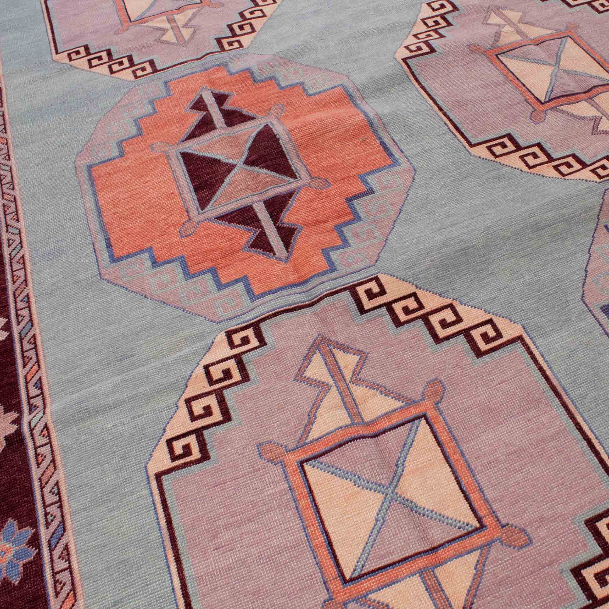 This custom oushak-inspired rug was designed by Scout and hand woven with a Turkish-style knot by artisans in India. It features a durable wool construction and plum colors against a light blue background.