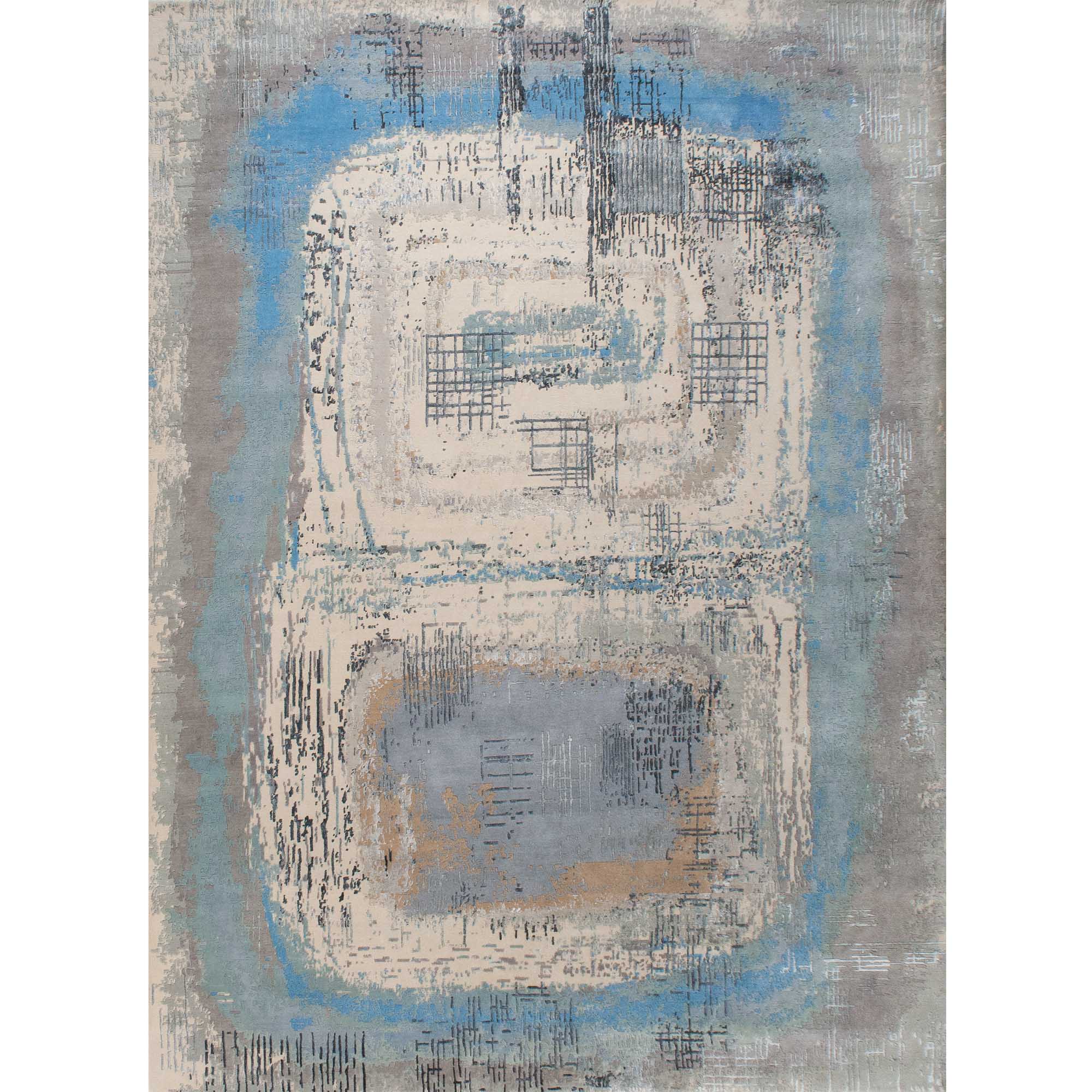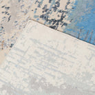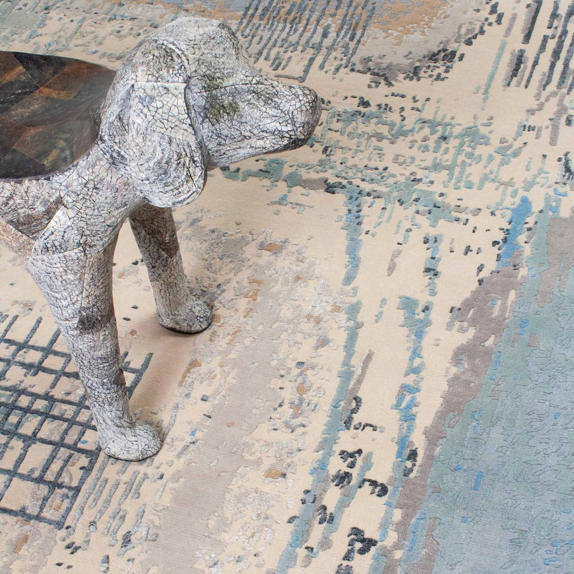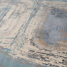 Our Delilah rug features an abstract design of blue, grey and black hues against a tan background. Made of silk with a luxurious sheen that won't go unnoticed.