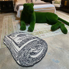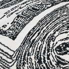 Dolla Toile was designed by Scout and hand woven with a Turkish-style knot by artisans in India. It features a durable wool construction and an ivory background with a stylized illustration of a wad of hundred dollar bills.