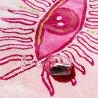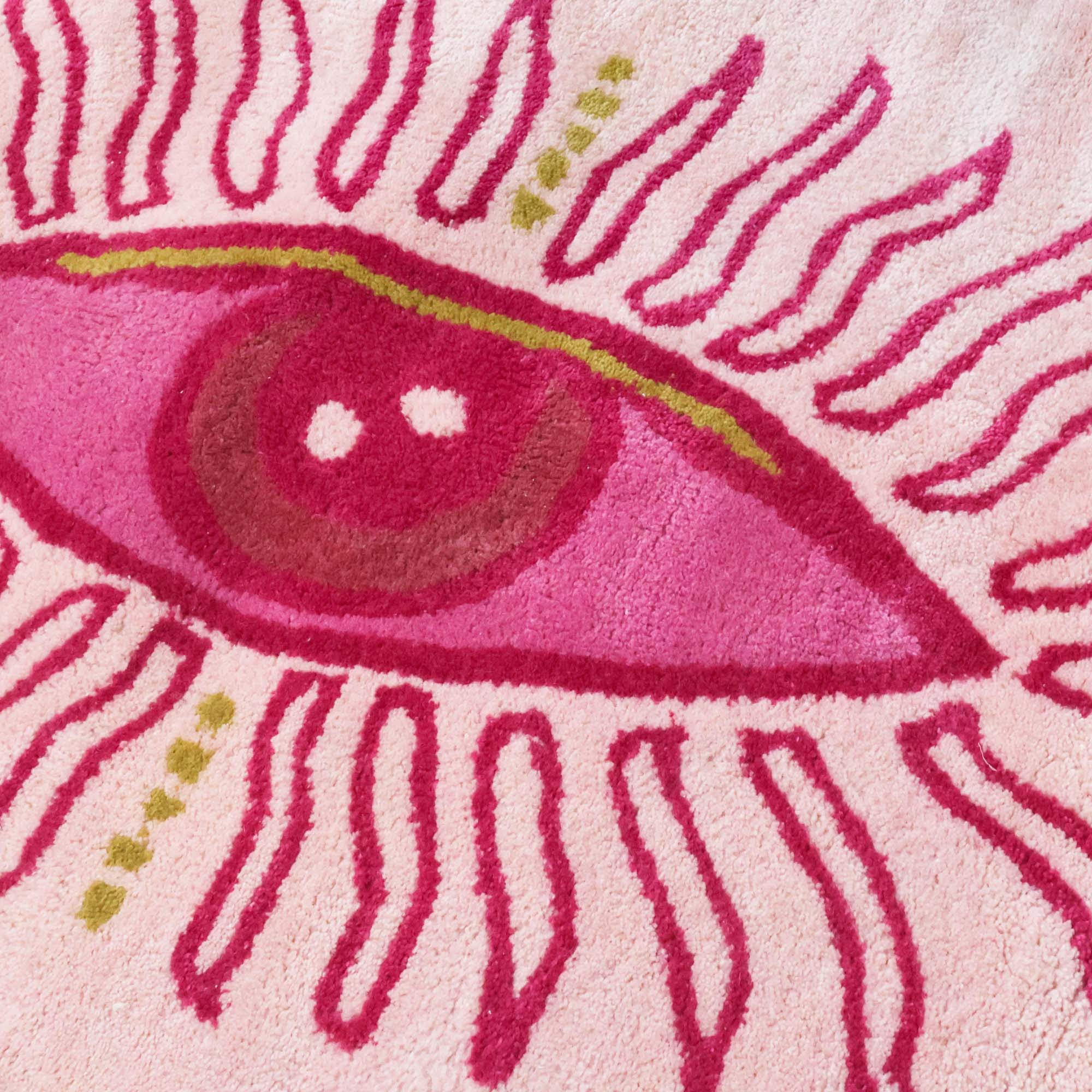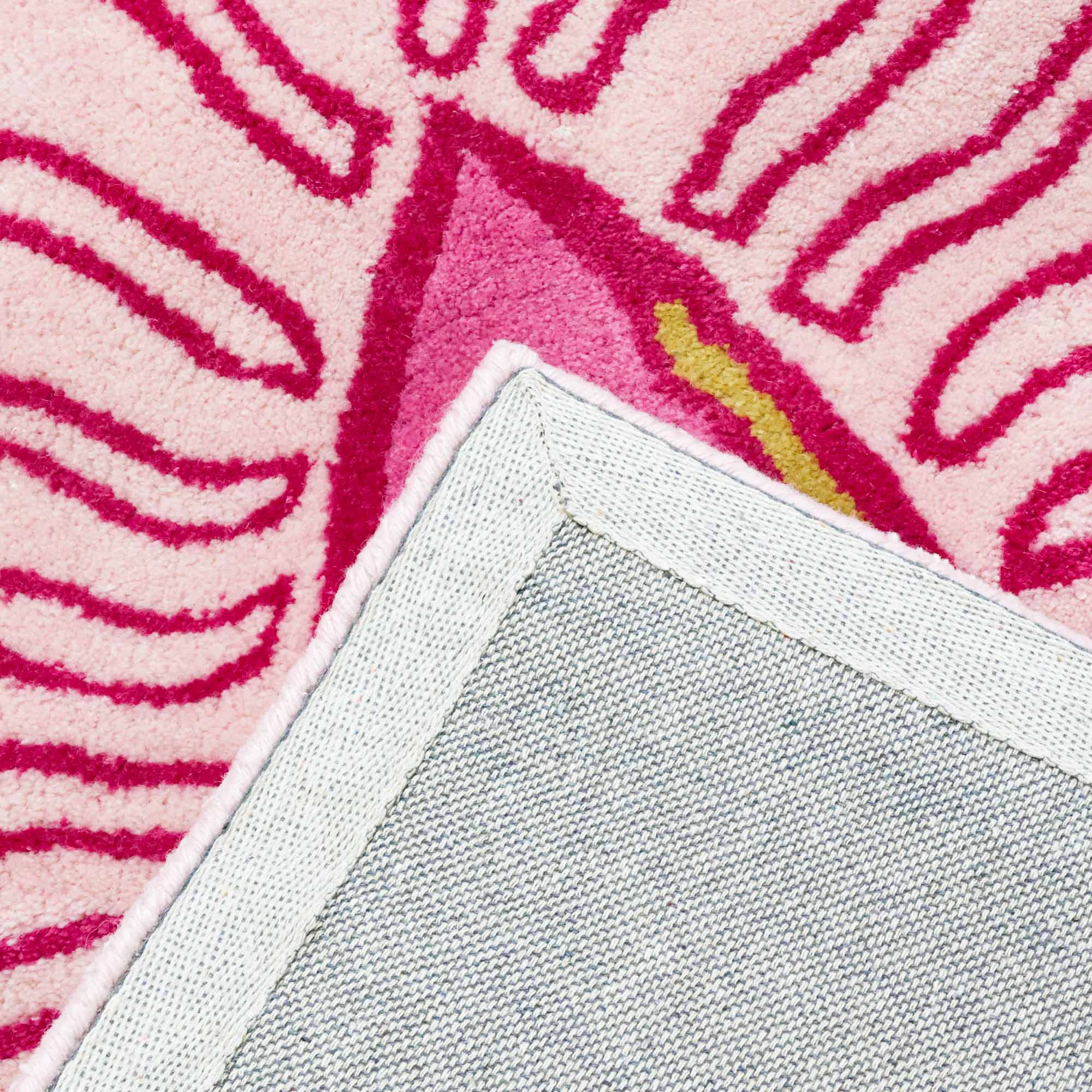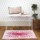 This custom mat was designed by Scout and hand-tufted by artisans in India. It features a durable wool pile that's super soft underfoot, and a light pink background with a hot pink design.