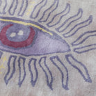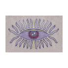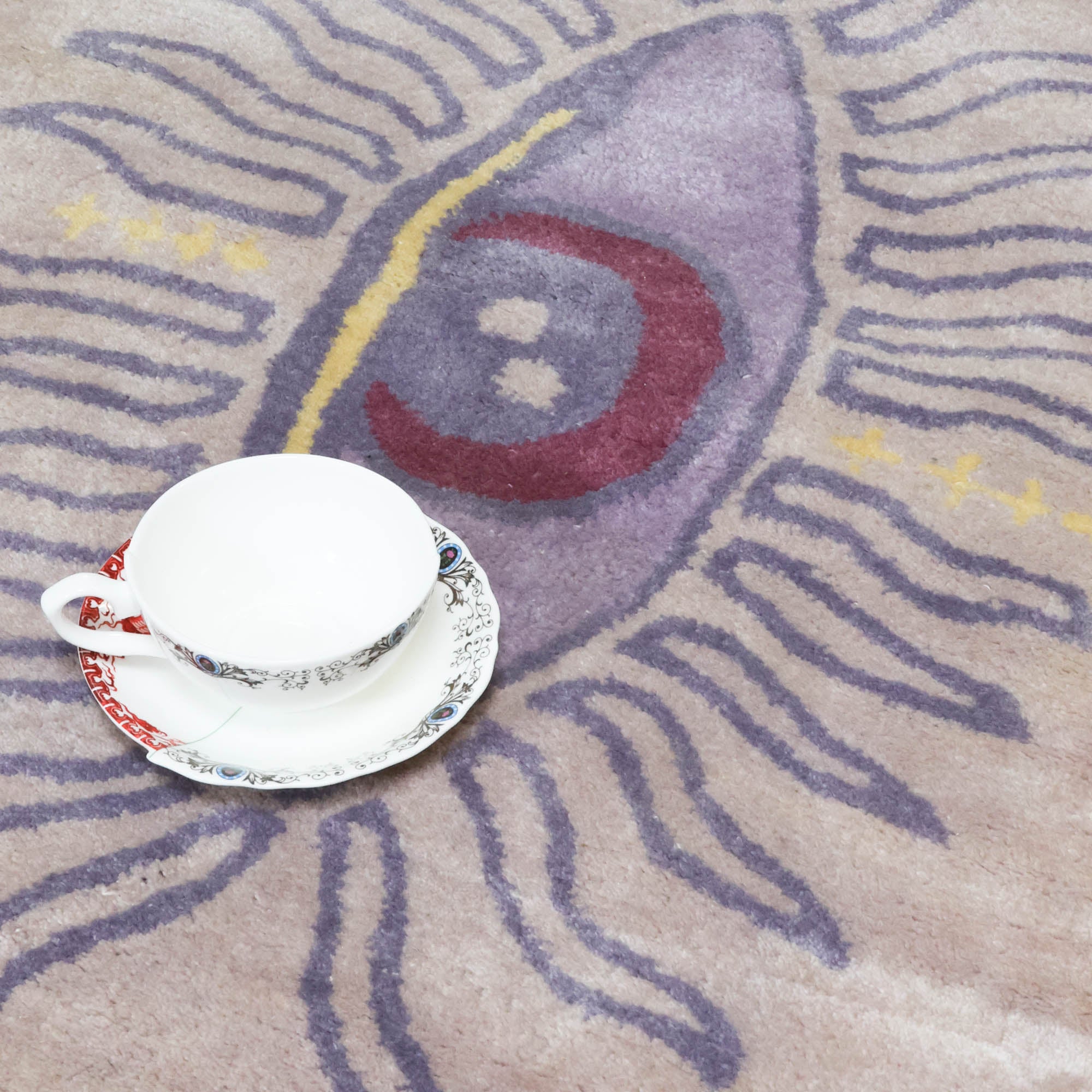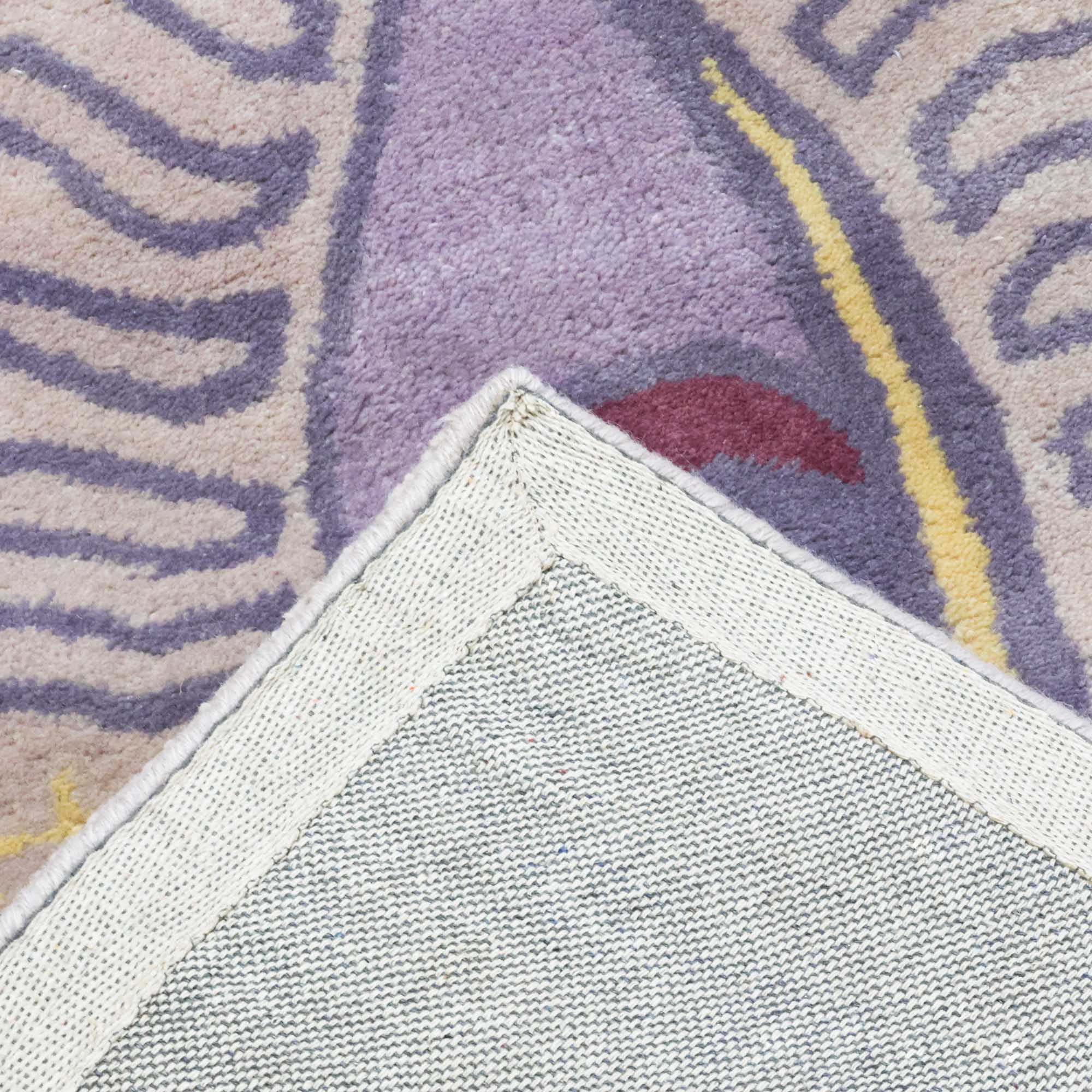 This custom mat was designed by Scout and hand-tufted by artisans in India. It features a durable wool pile that's super soft underfoot, and a light pink background with a darker purple design.