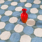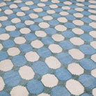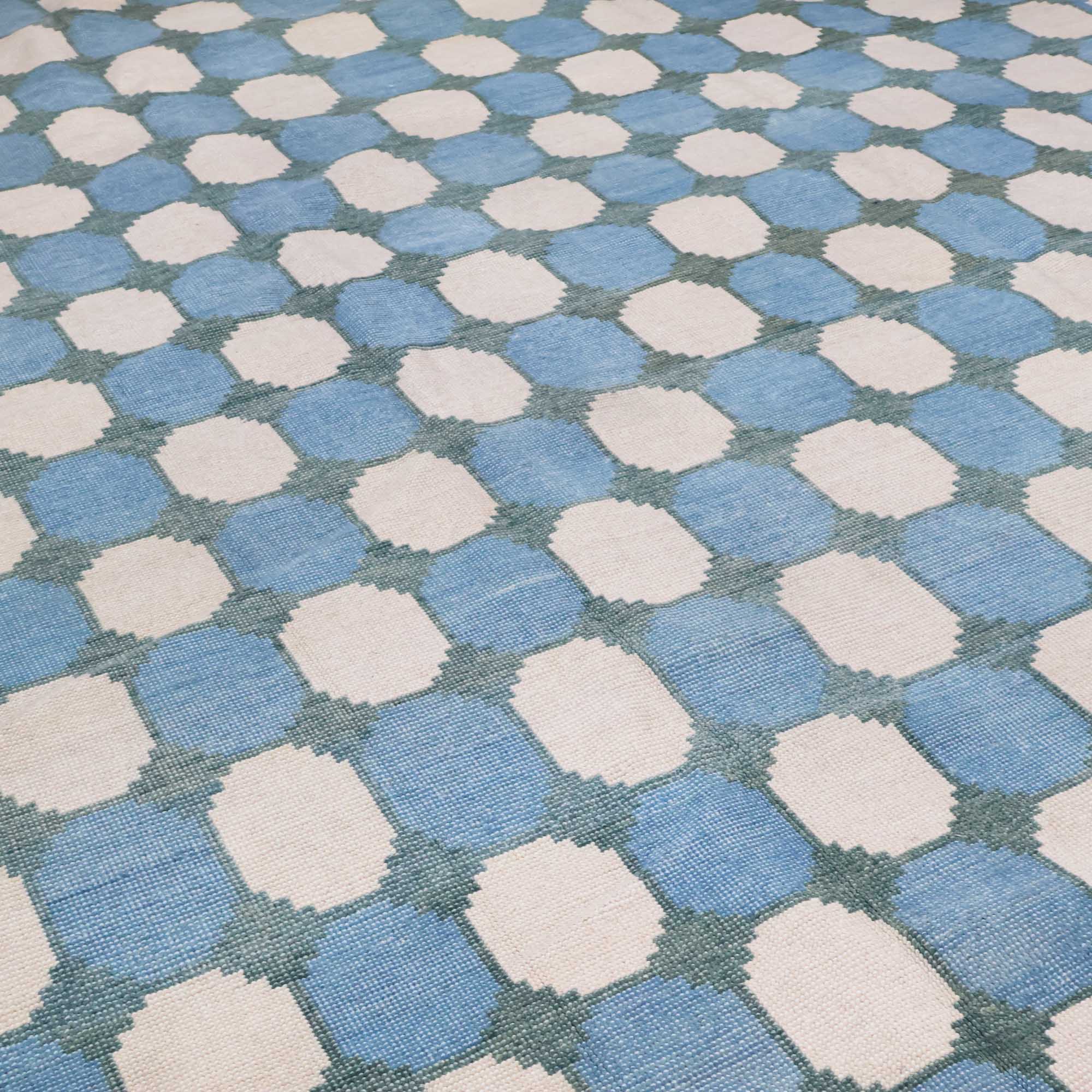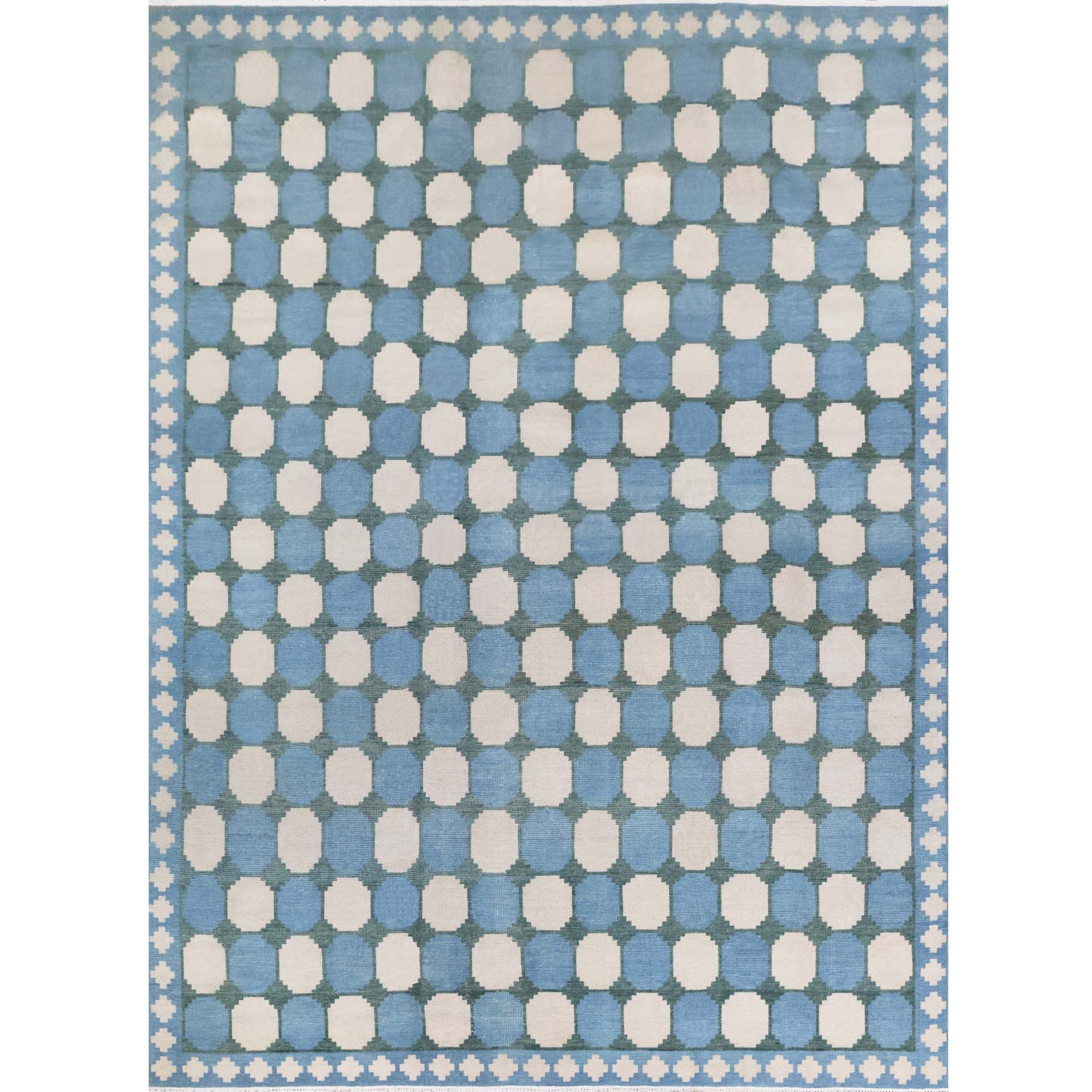 This custom oushak-inspired wool rug was designed by Scout and hand woven with a Turkish-style knot by artisans in India. The piece depicts a pattern comprised of cornflower blue, muted green & ivory.