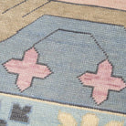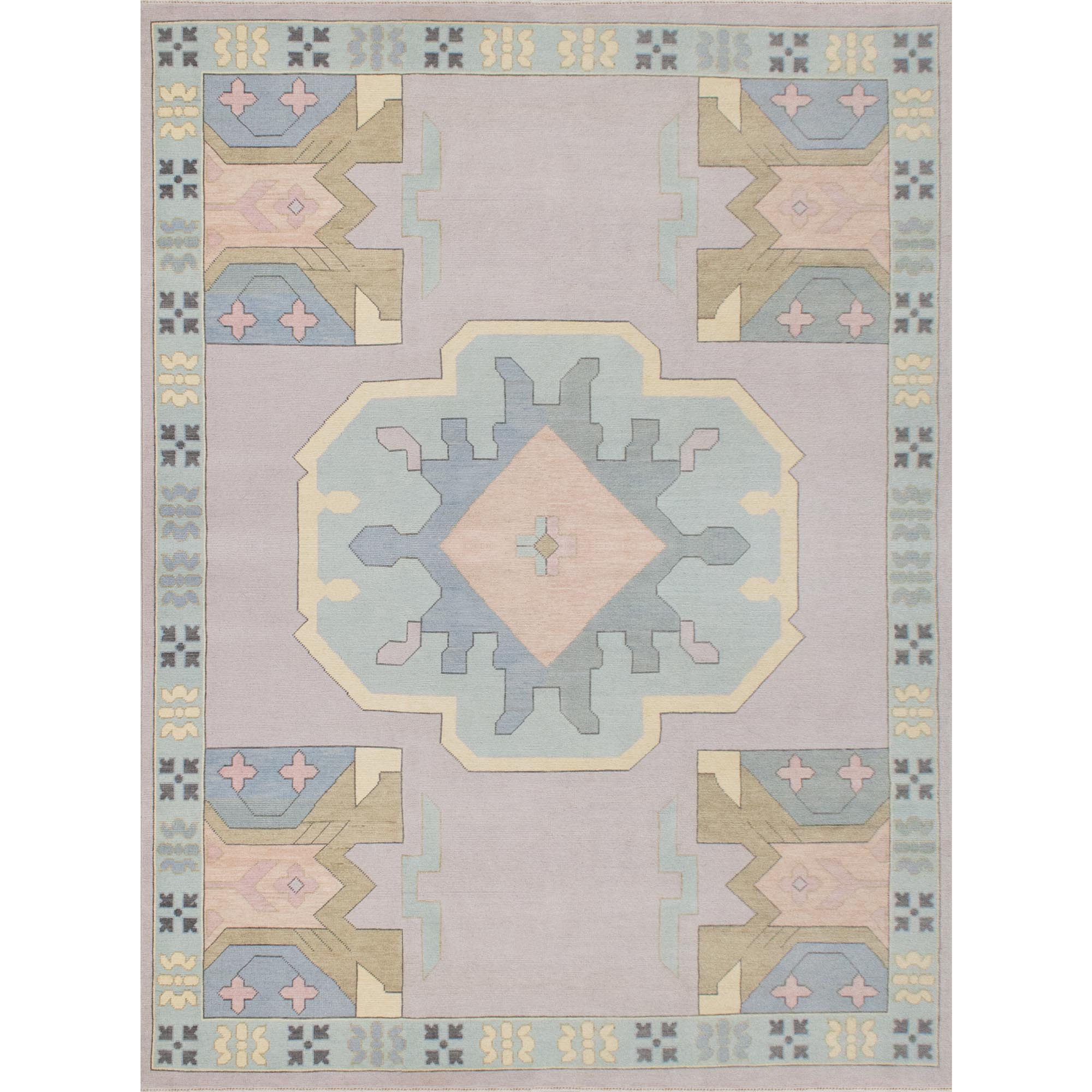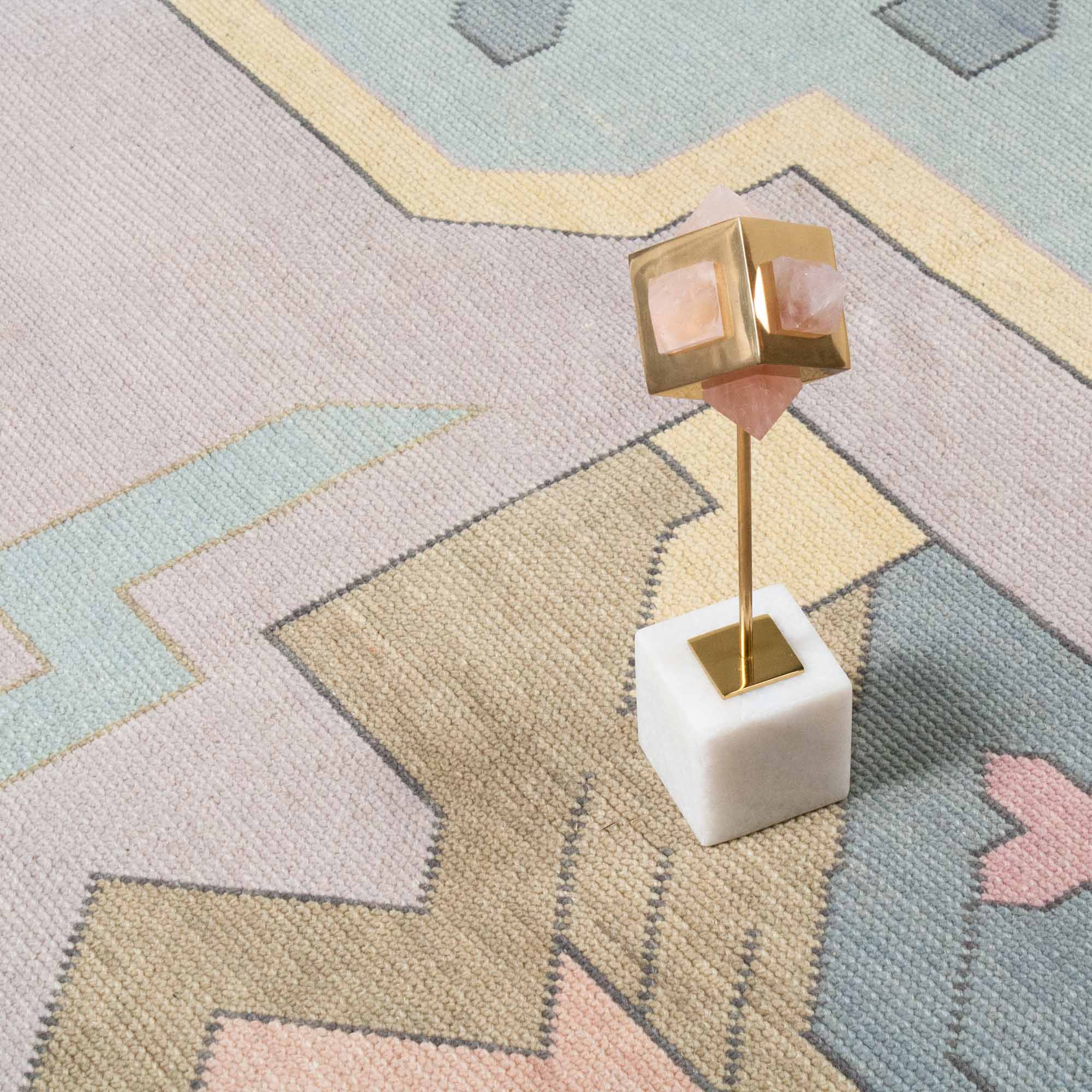 Hand-woven by artisans in India, our custom Zara rug features an Egyptian-inspired geometric pattern on a pastel blue and lavender background. The wool pile was woven with a Turkish-style knot for durability.
