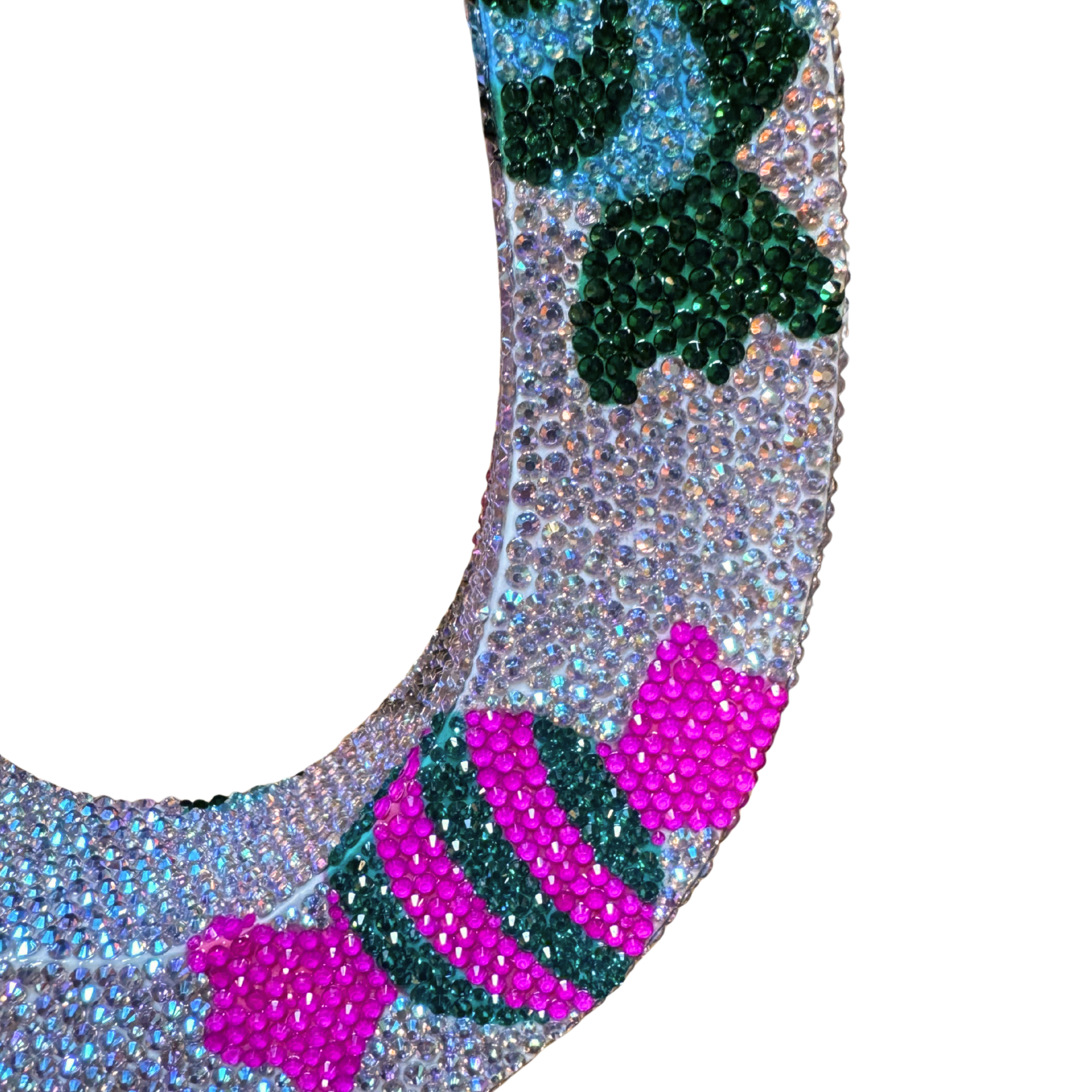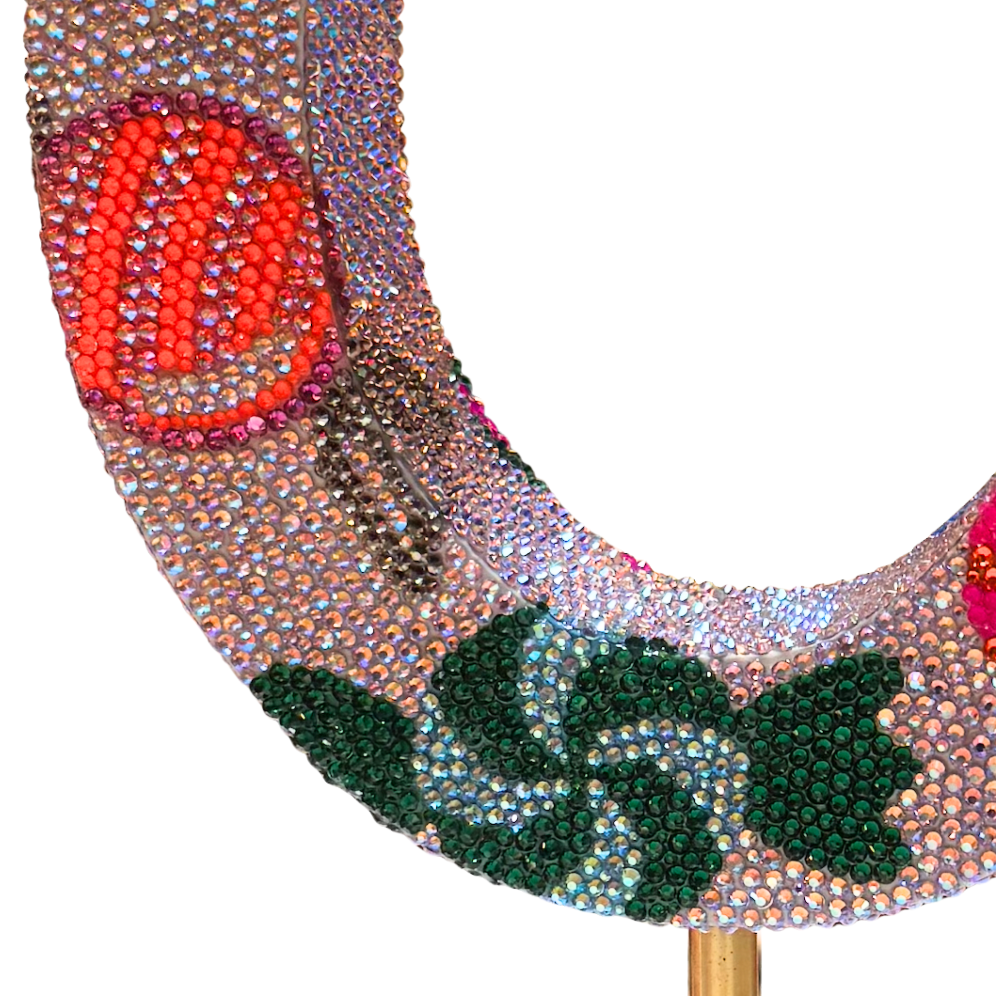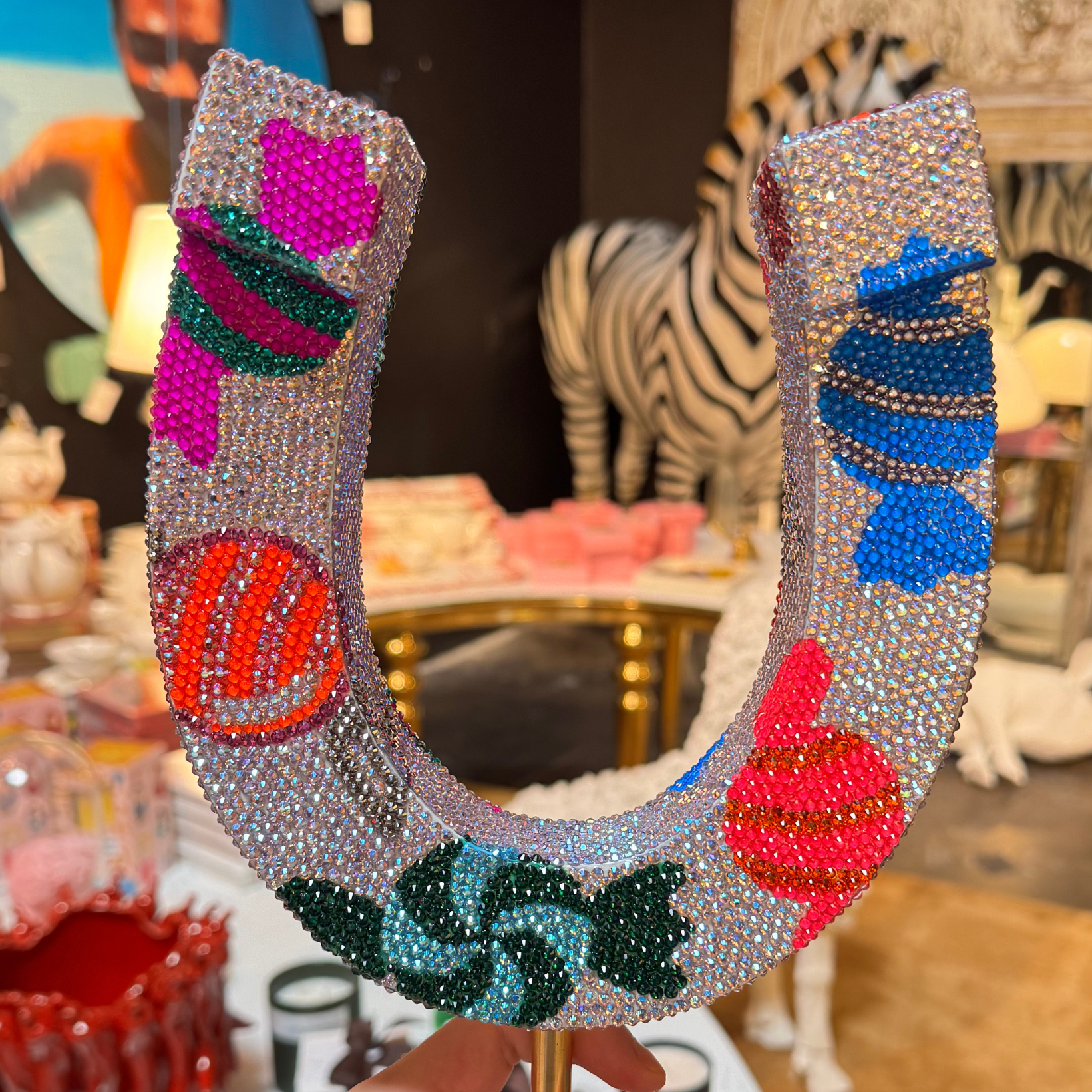 Hand-crafted by artist Loli DiSanto, this fabulous horseshoe sculpture is finished with acrylic paint, resin, and approximately 10,000 Swarovski crystals resting on an acrylic base. A unique piece that's sure to get the conversation started.