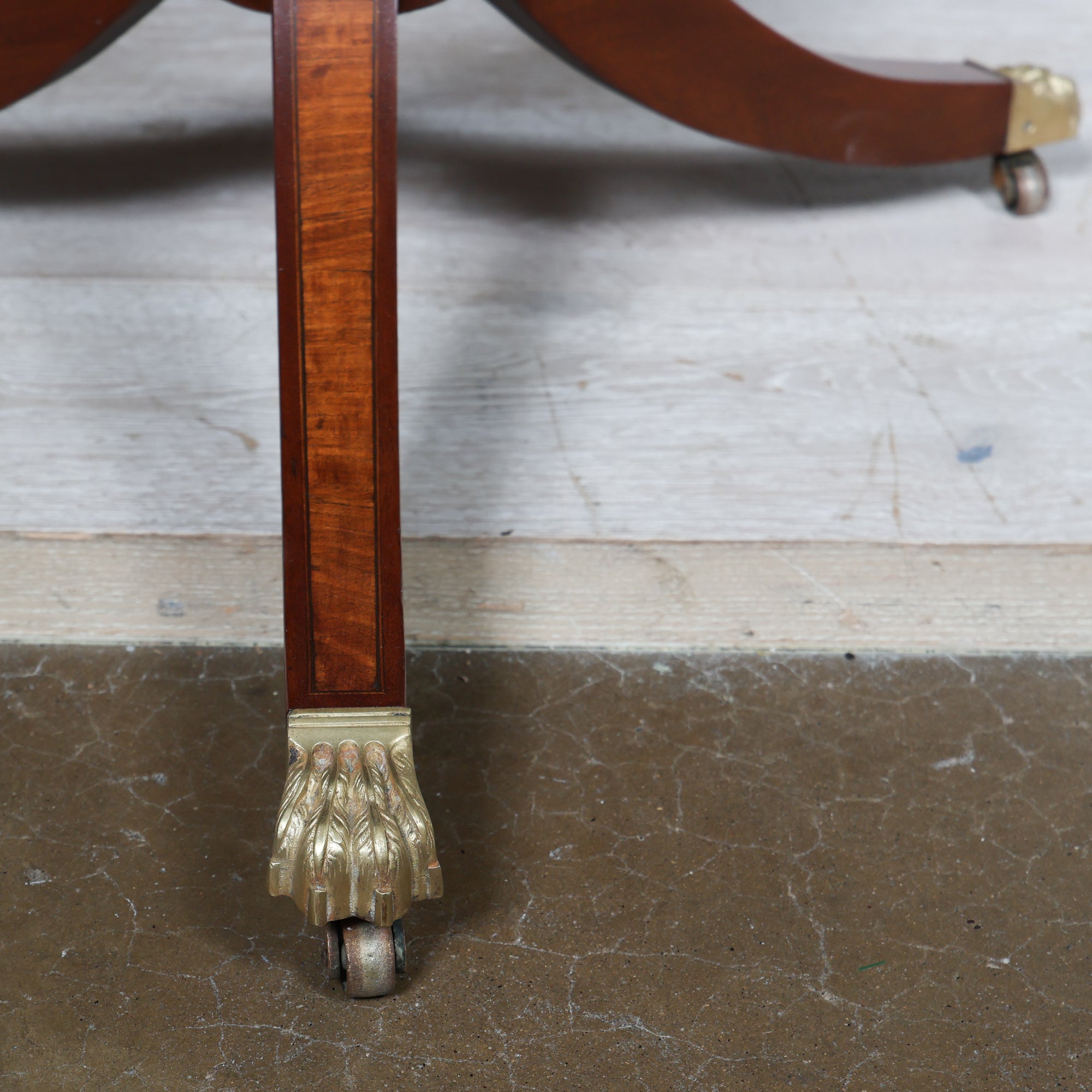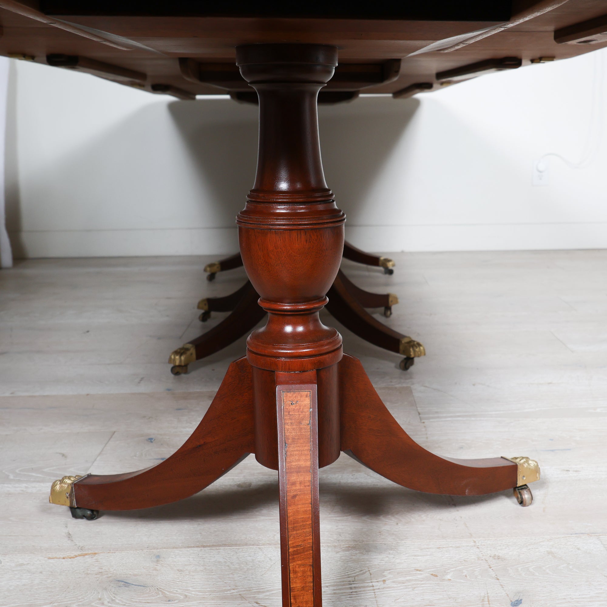 Recently refinished, this exceptional 20th-century Regency Revival dining table showcases rich flame mahogany framed by elegant satinwood crossbanding. The table has two leaves which can be added or removed as desired to suit the occasion and is raised on 3 pedestal bases, each inlaid with satinwood banding and fitted with elegant brass toes and castors.