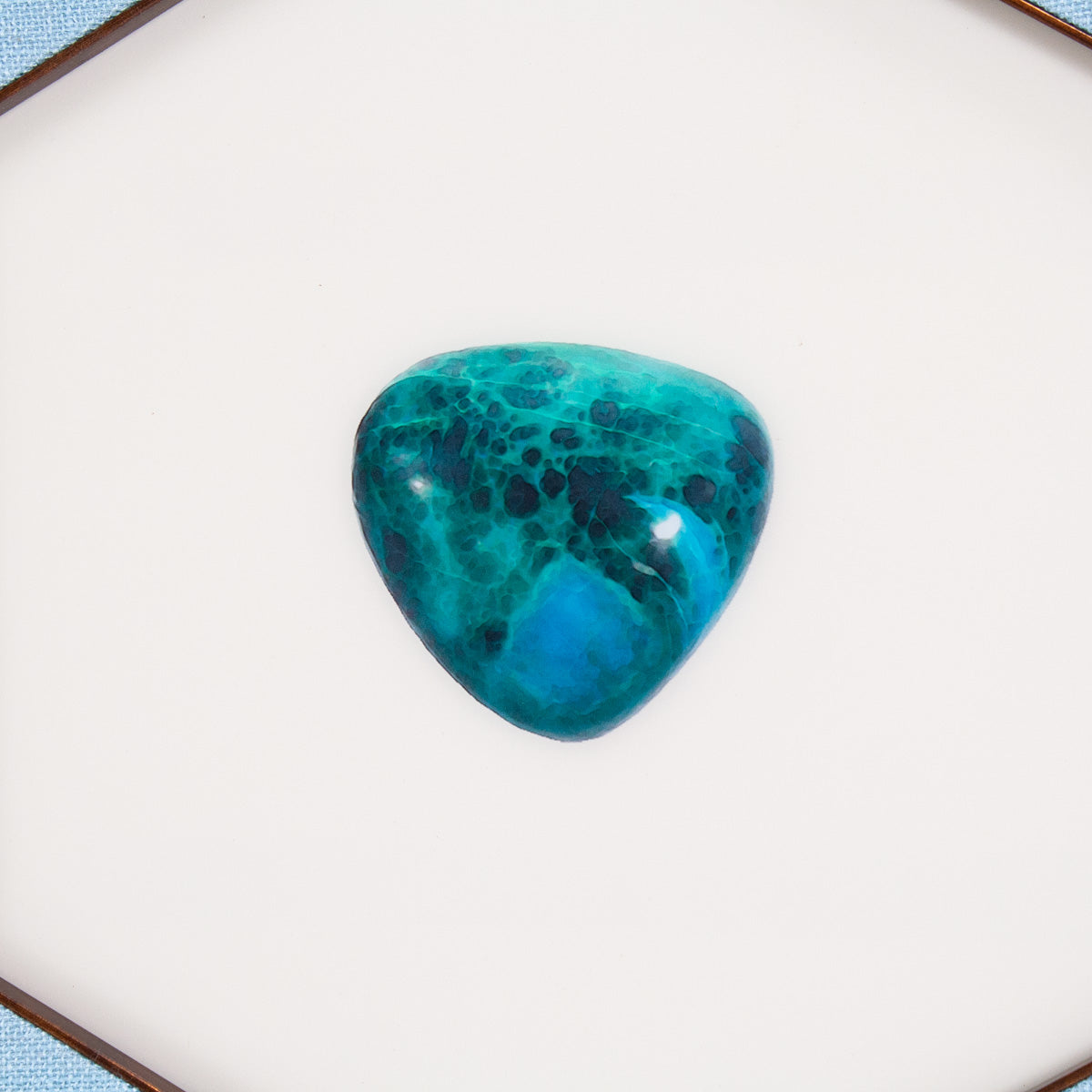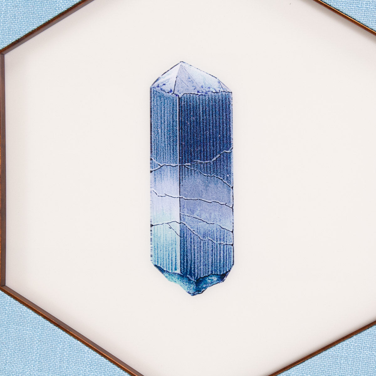 Printed acrylic artwork with a blue linen matte in a black and gold frame.