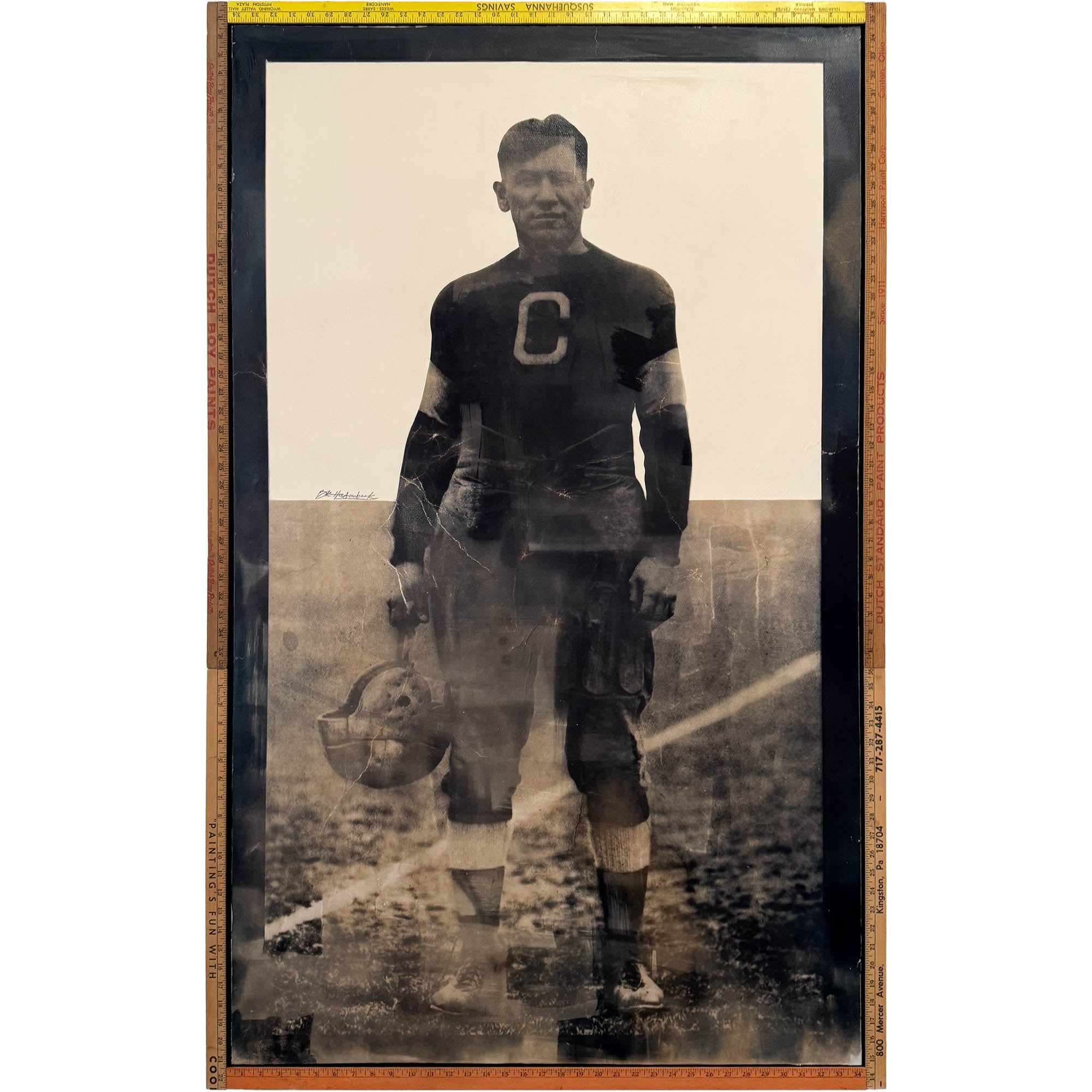 Inspired by the legendary Native American athlete, "Jim Thorpe" by BK Holsomback is an original 56x36 mixed media collage on panel, framed in a yardstick frame.