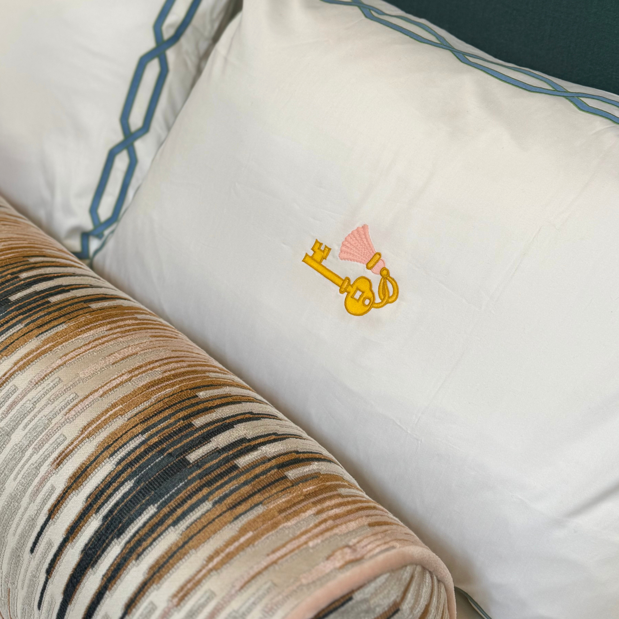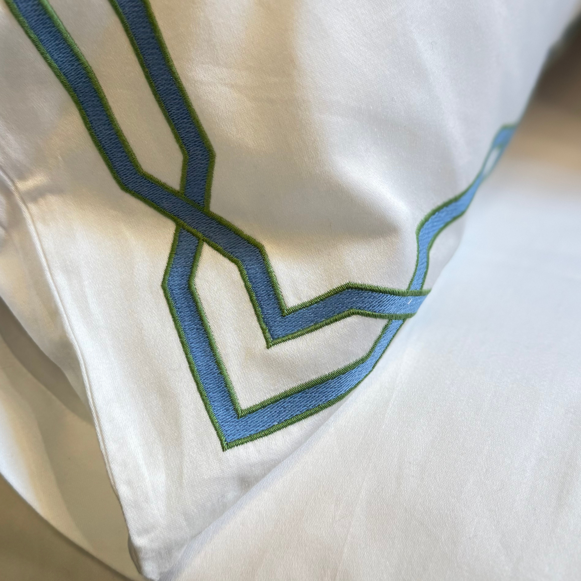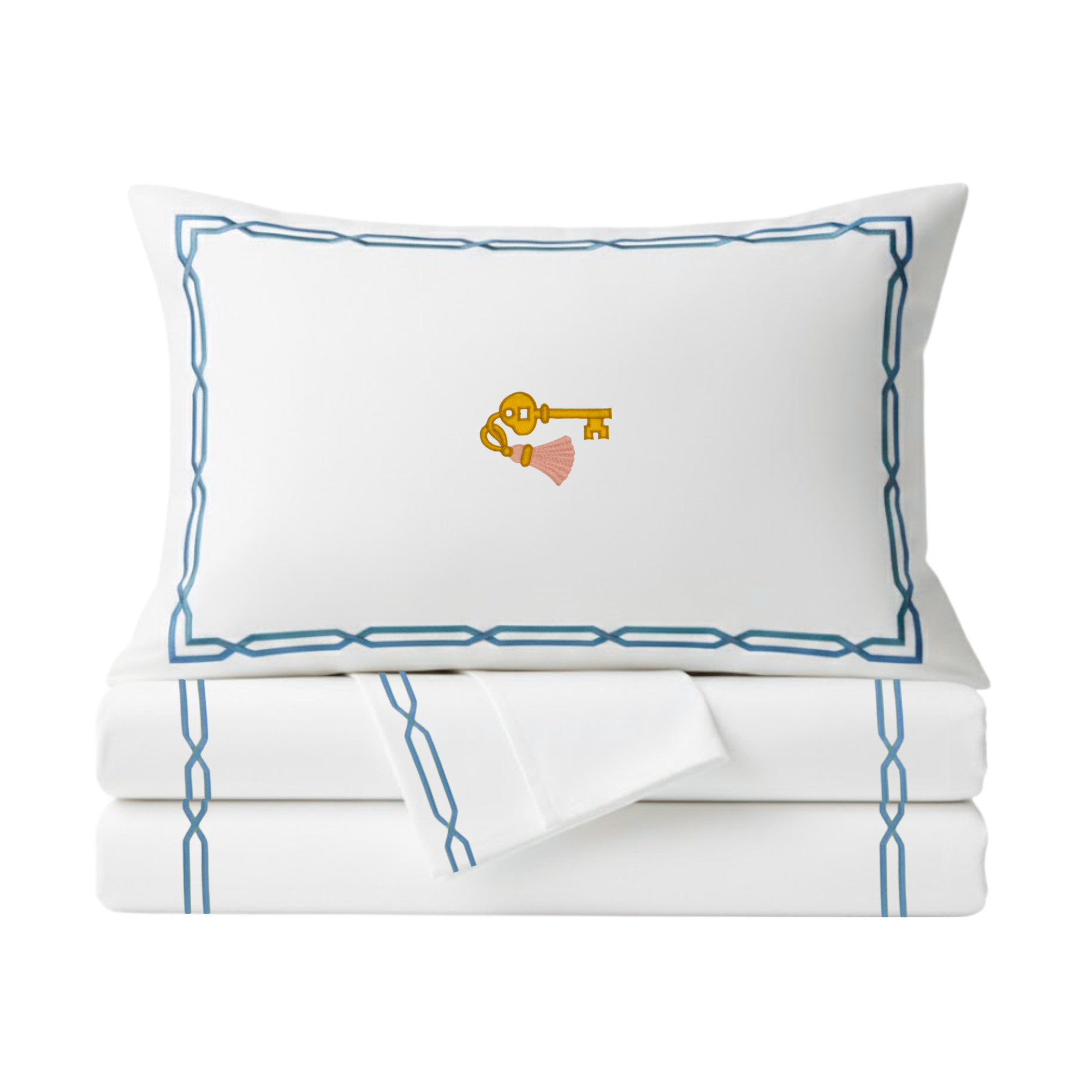 This lovely set features crisp white bedding with a tailored embroidered blue and green border and charming key-and-tassel accents. This is the kind of bedding that makes every night feel like turndown service is on the way.