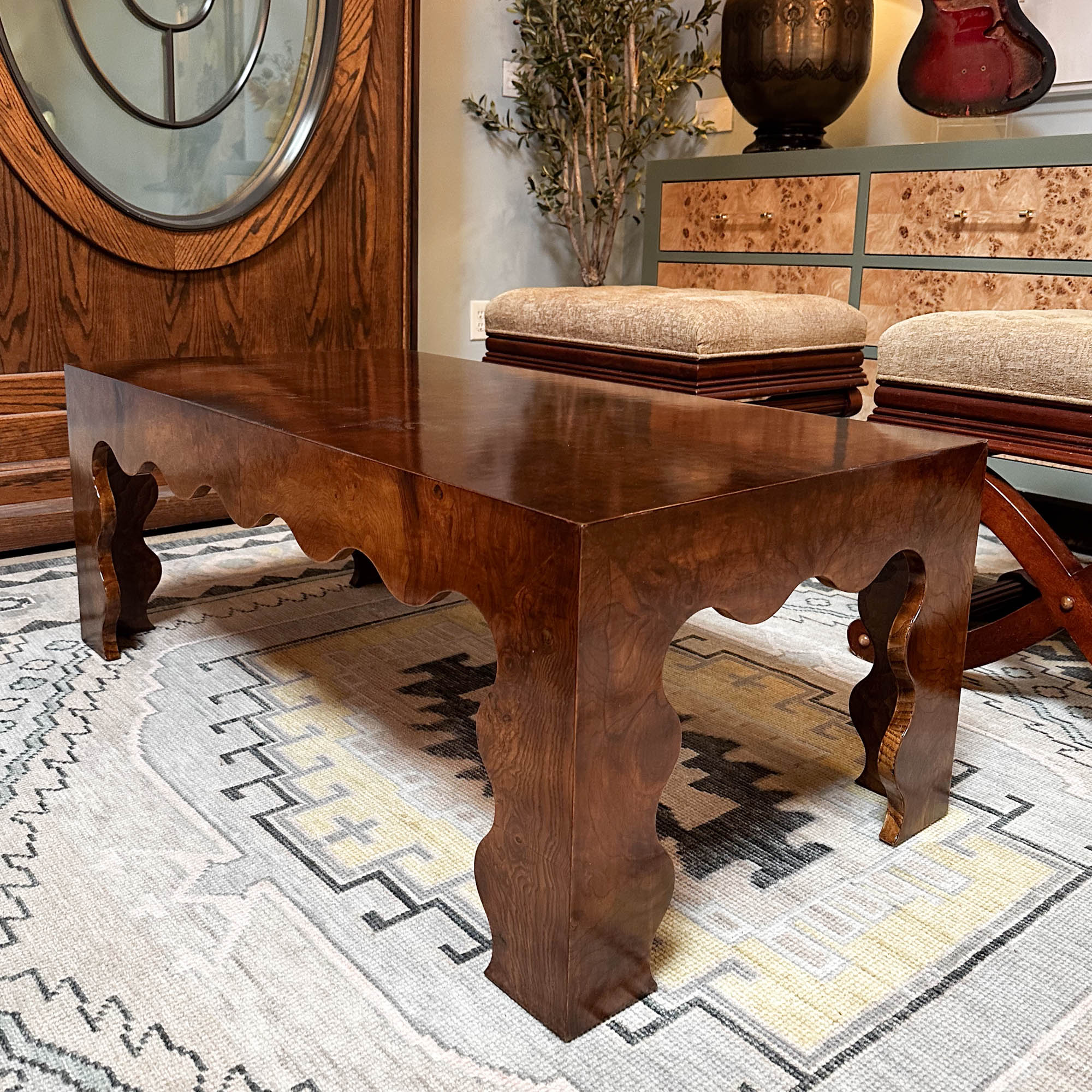 Bespoke without the wait y'all - get your dream piece with quick shipping! From our custom collection, this custom Elizalde Coffee Table in a custom glossy auburn finish on Olive Ash Burl is in stock and ready to go.