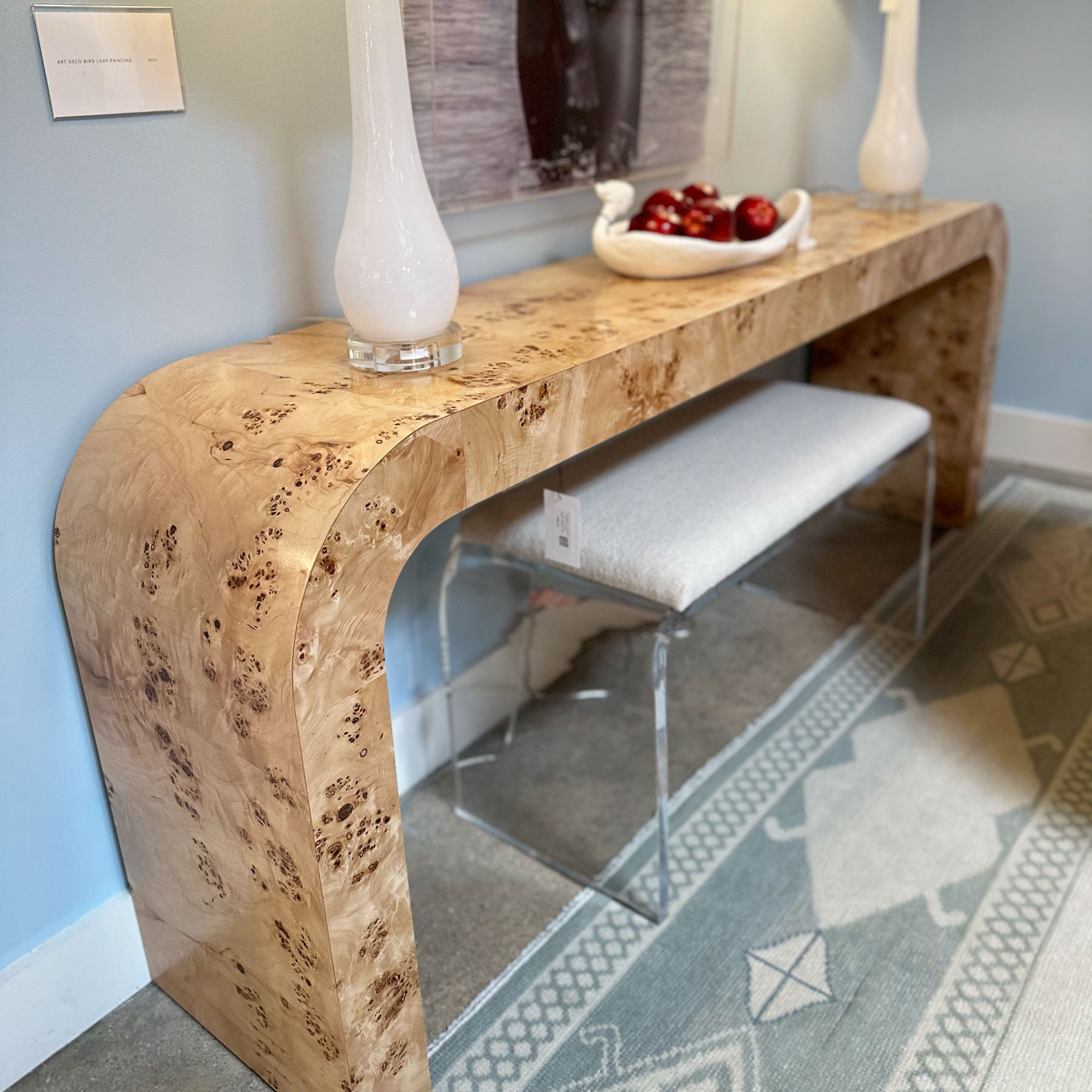 Bespoke without the wait y'all - get your dream piece with quick shipping! From our custom collection, this 80" Marion Console in Golden Pecan Mappa Burl is in stock and ready to go.