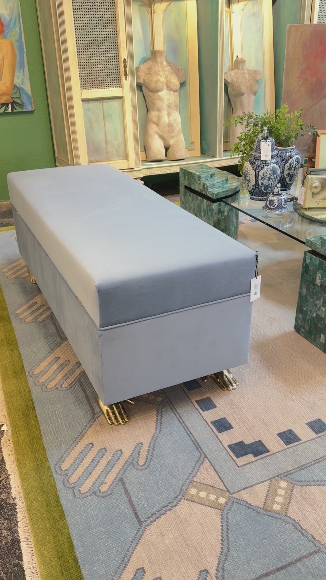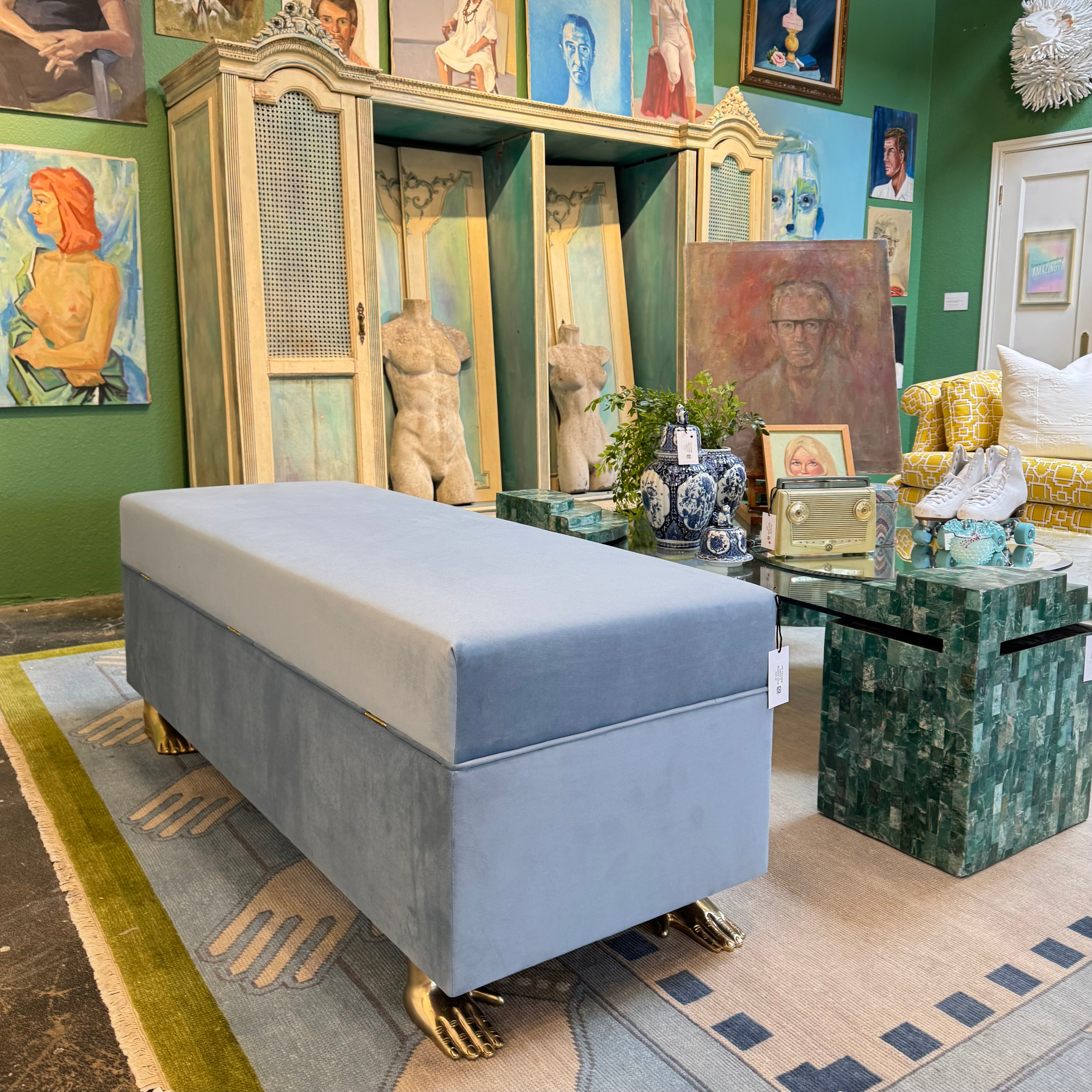 Bespoke without the wait y'all - get your dream piece with quick shipping! Built and upholstered by our in-house team, this Triomphe Bench in Bluebird Velvet is in stock and ready to go.