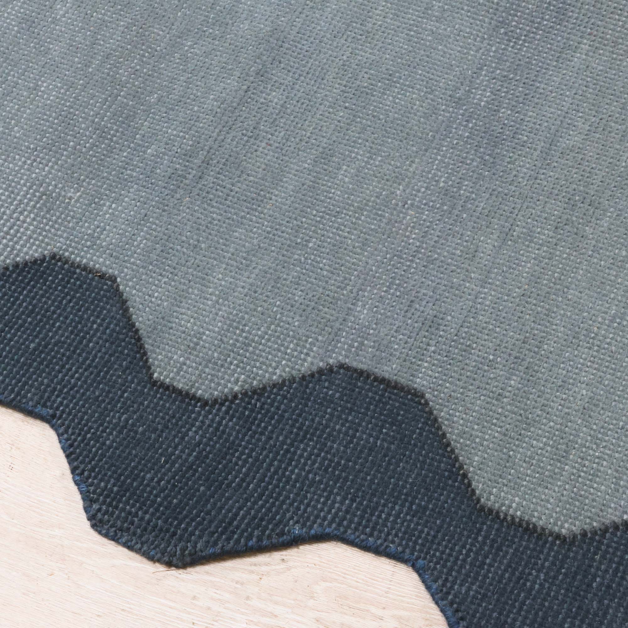 We love the simple twist on our Andrews design. Featuring a geometric scalloped border and dark blue hues, this rug is anything but boring. This custom wool rug was designed by Scout and is hand knotted by artisans in India.