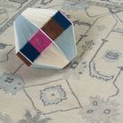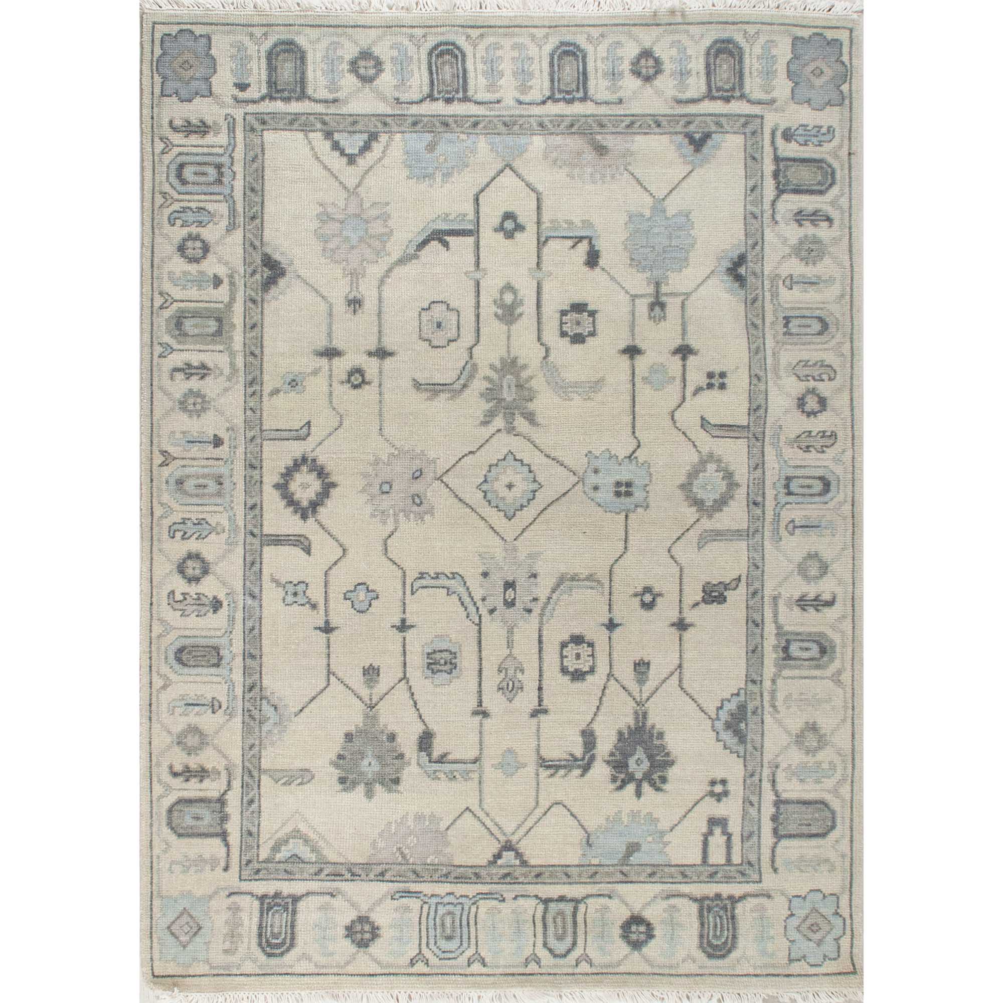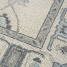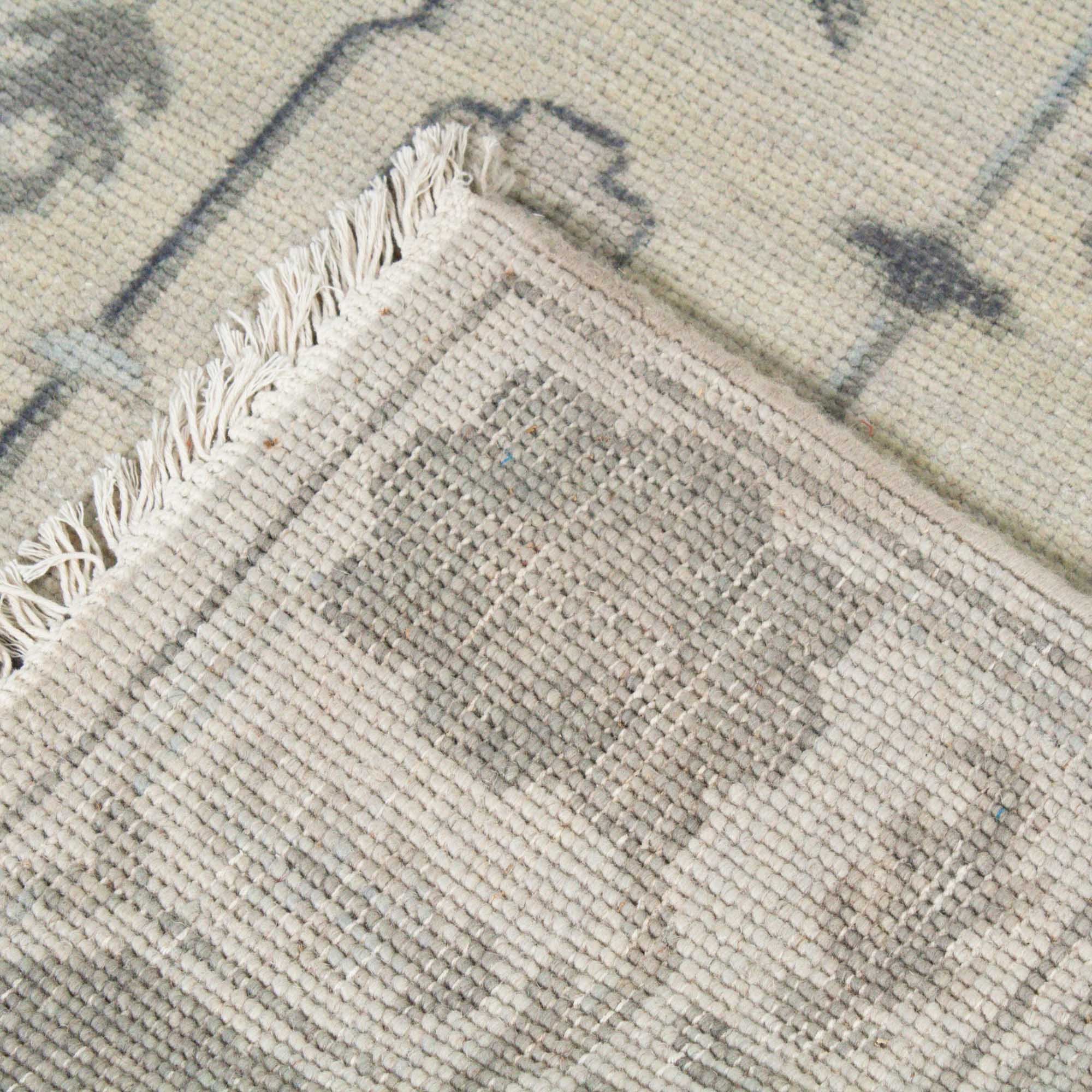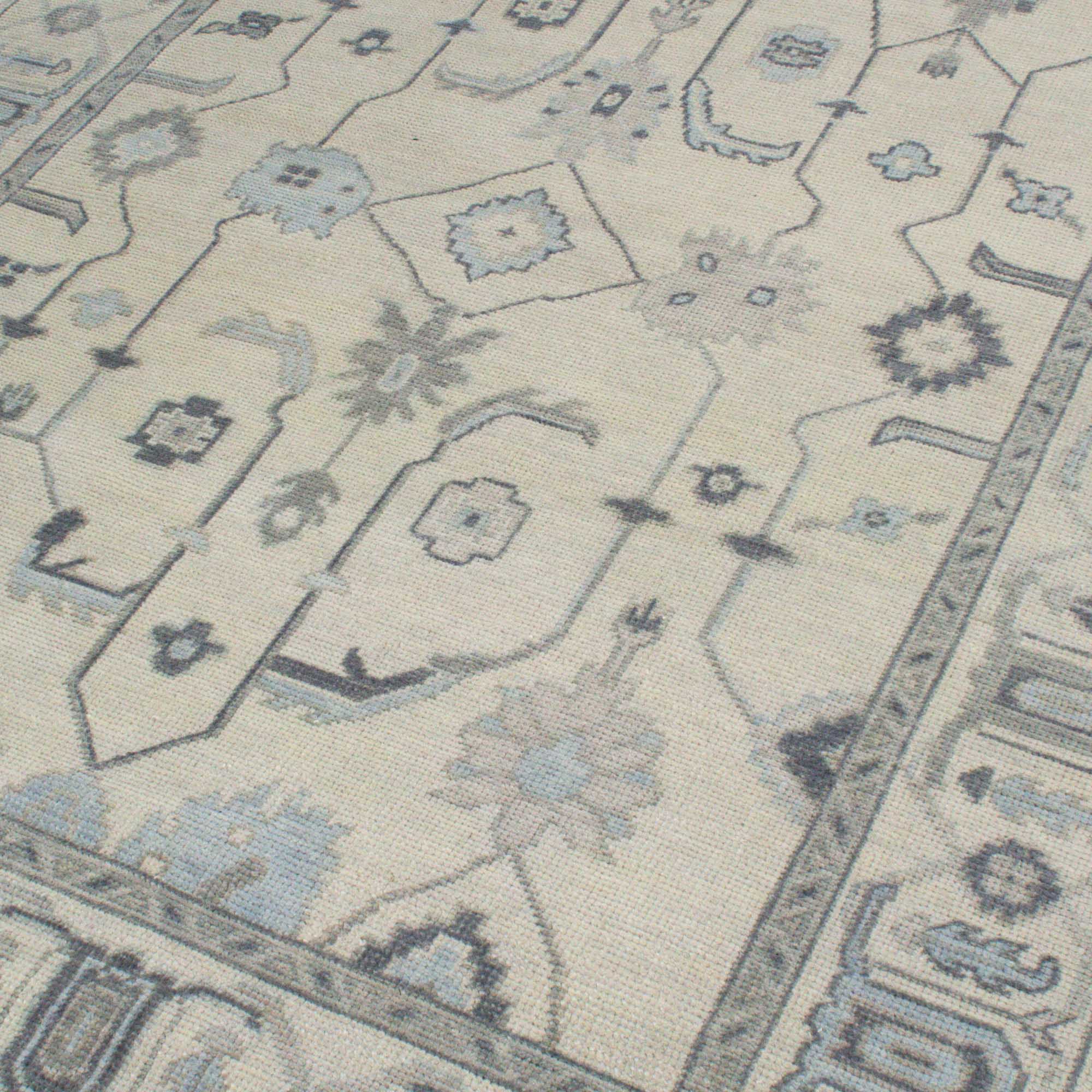 This oushak-inspired rug was designed by Scout and hand woven with a Turkish-style knot by artisans in India. It features a durable wool construction and neutral cream background with blue accents.