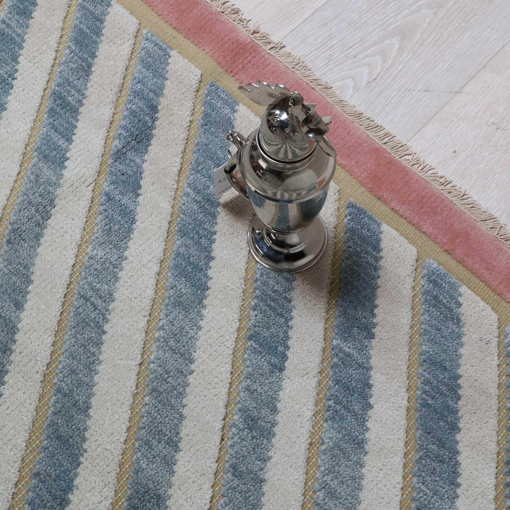 Bring on the dimension. The Marfa Tilt High-Low Rug makes a statement with bold diagonal stripes in soft ivory and slate blue, anchored by a golden olive field and finished with a blush border. Its playful tilt and tonal contrast give a modern edge to a timeless pattern.
