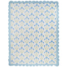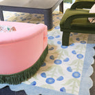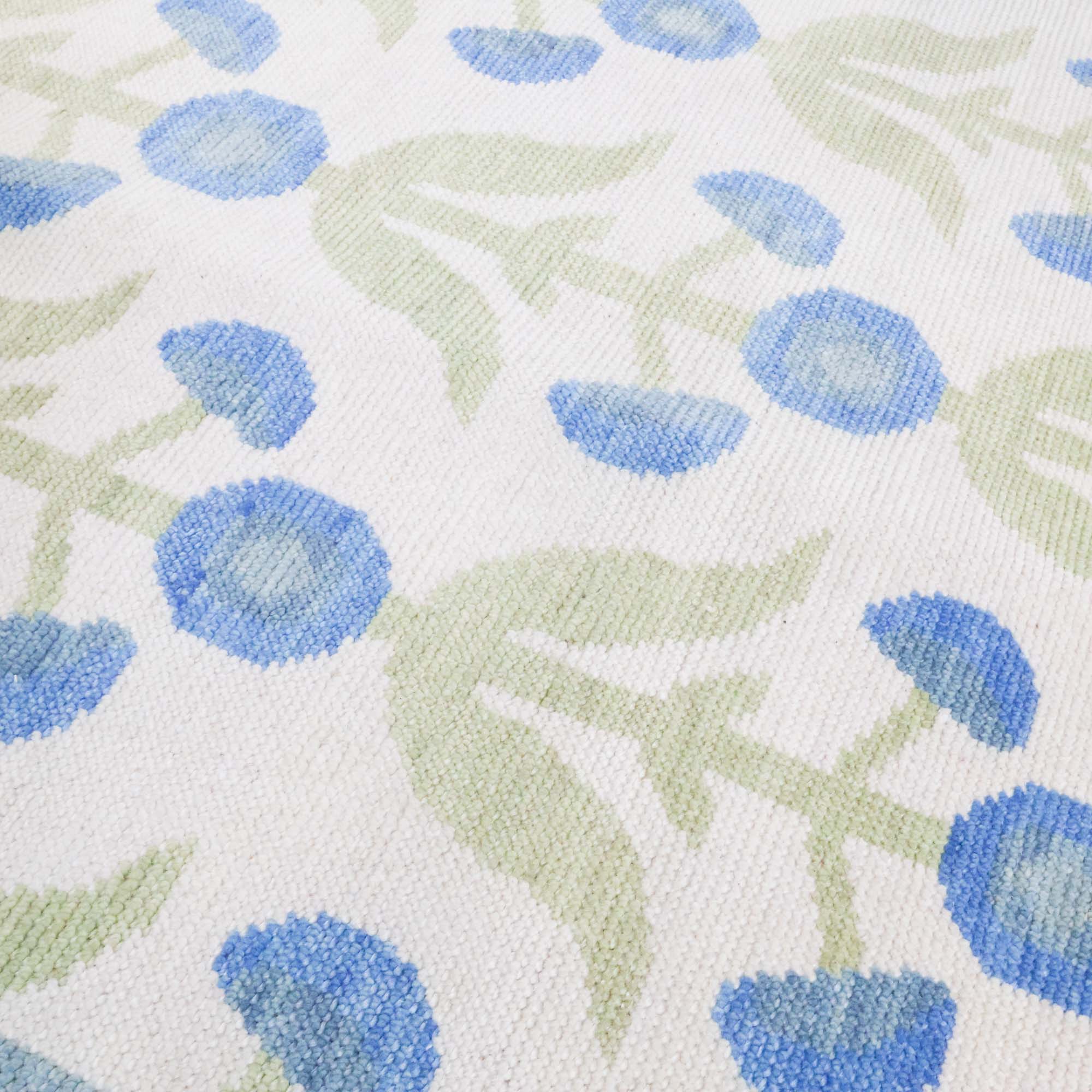 Featuring a scalloped border and flower design, this rug is as sweet as it gets. Light blues and greens on a cream background offer transitional versatility. This custom wool rug was designed by Scout and is hand knotted by artisans in India.