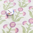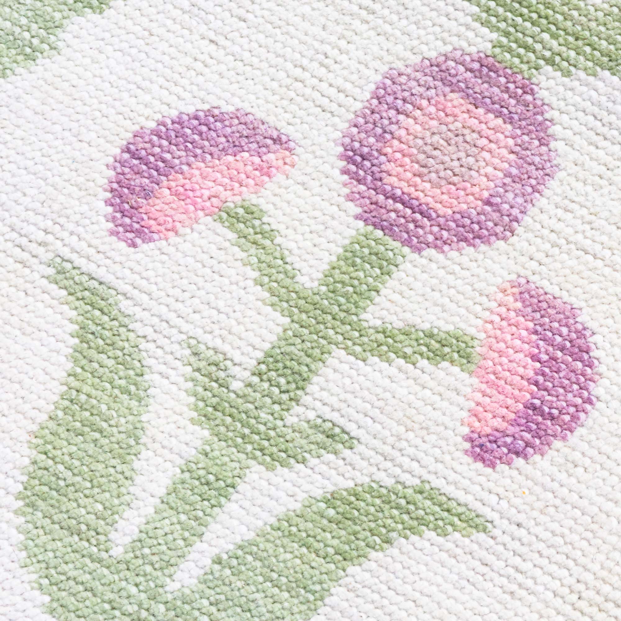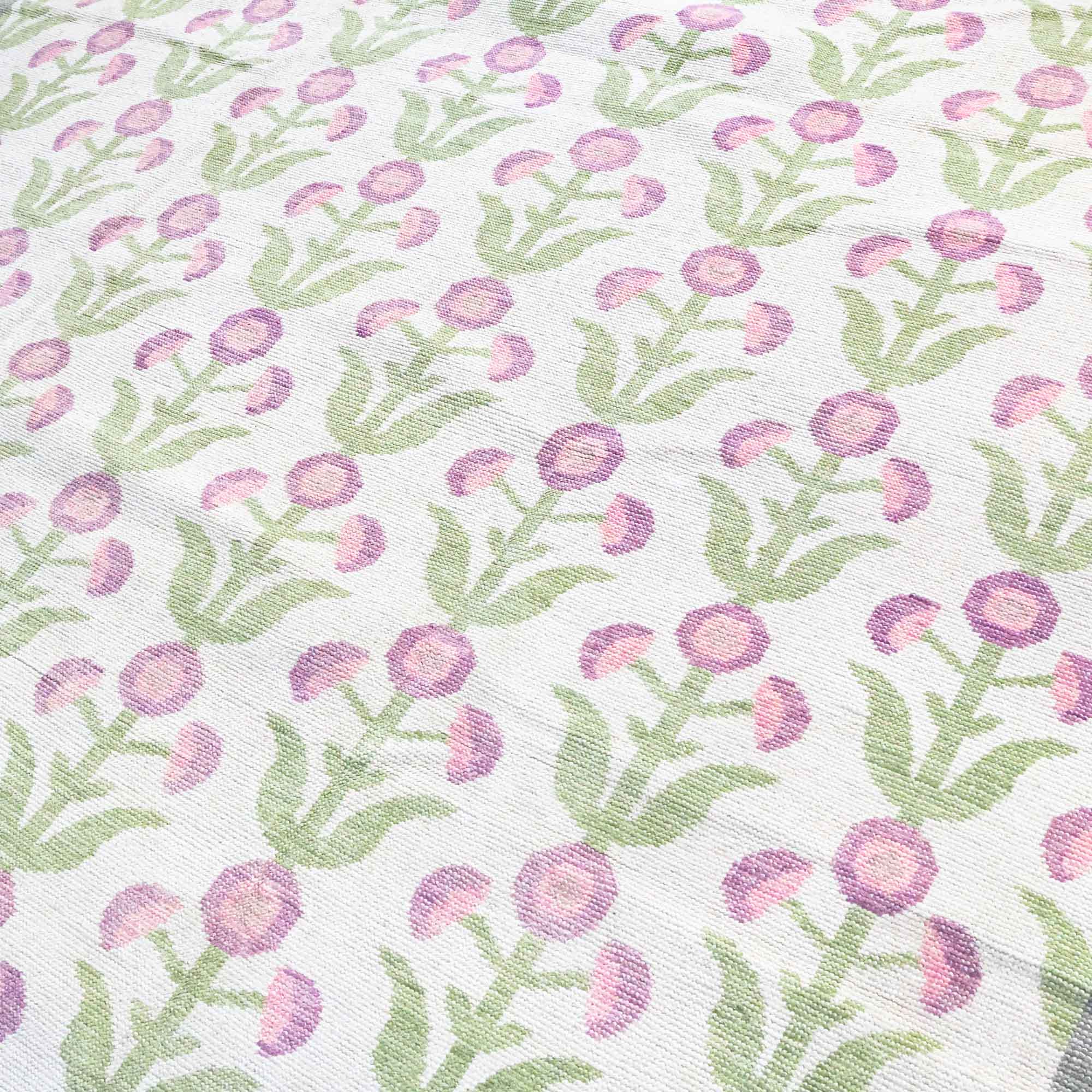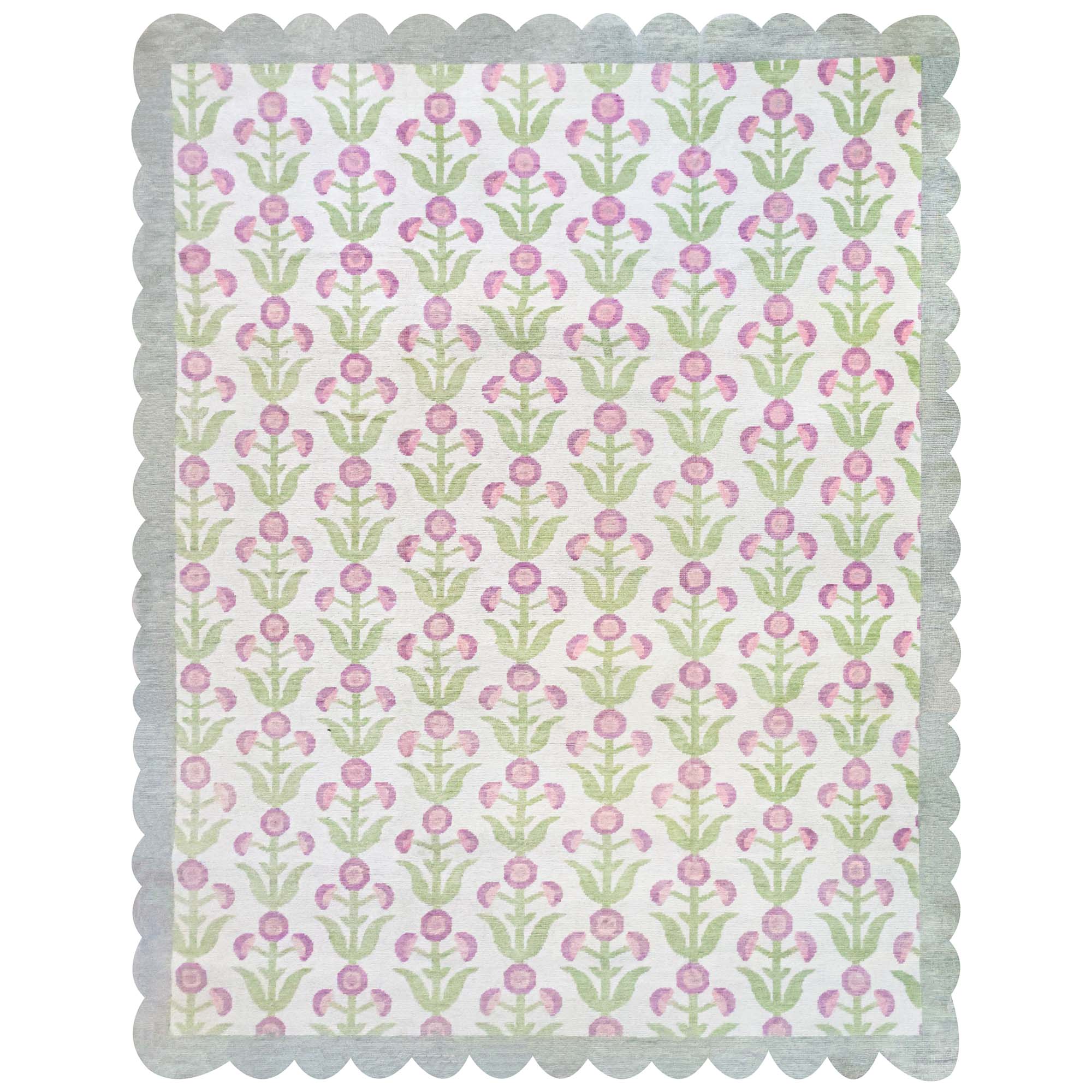 Featuring a scalloped border and flower design, this rug is as sweet as it gets. Lilac pinks and greens on a cream background offer transitional versatility. This custom wool rug was designed by Scout and is hand knotted by artisans in India.