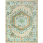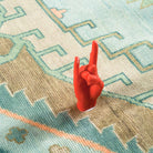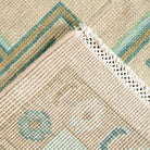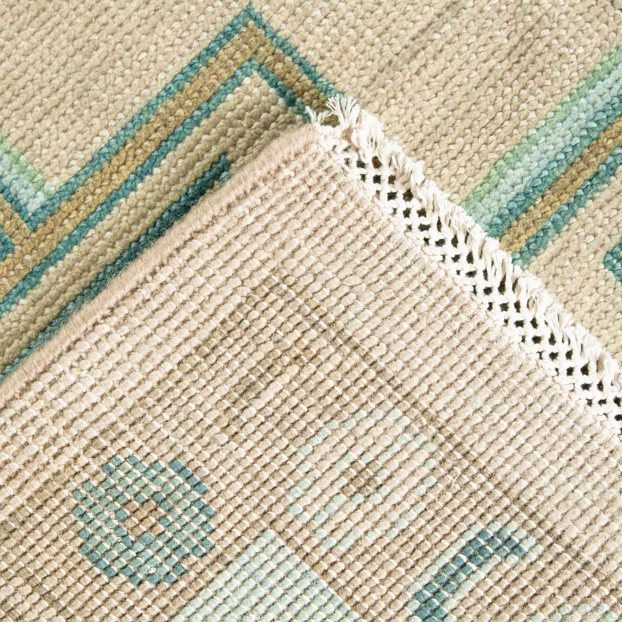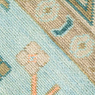This custom oushak-inspired wool rug was designed by Scout and hand woven with a Turkish-style knot by artisans in India. The piece features a light, neutral background and with an array of blue-toned motifs and pops of coral.
