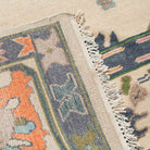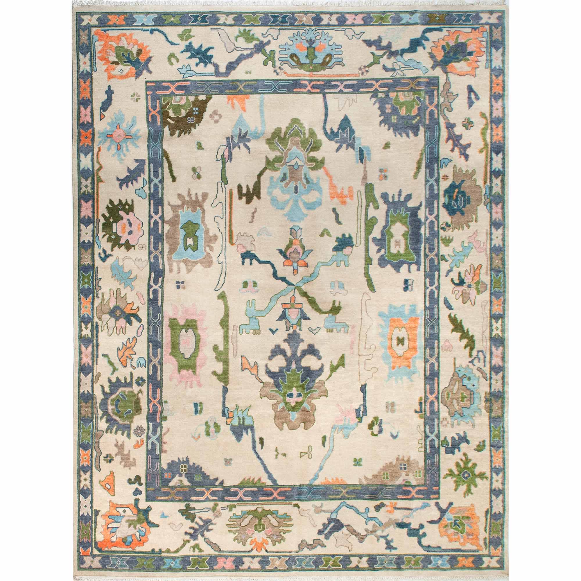 This oushak-inspired rug was designed by Scout and hand woven with a Turkish-style knot by artisans in India. It features a durable wool construction and neutral cream background with blue and orange accents.