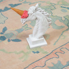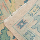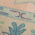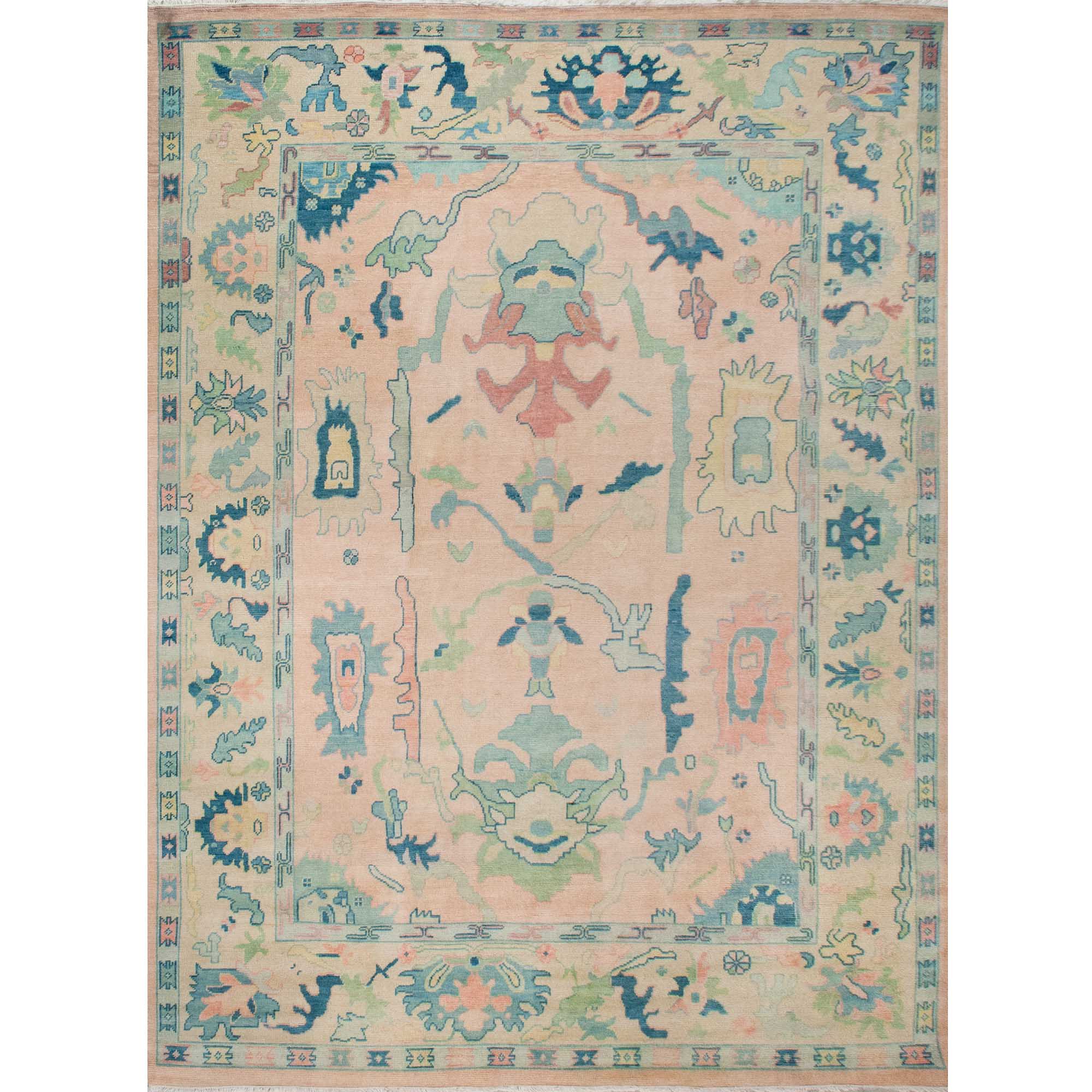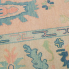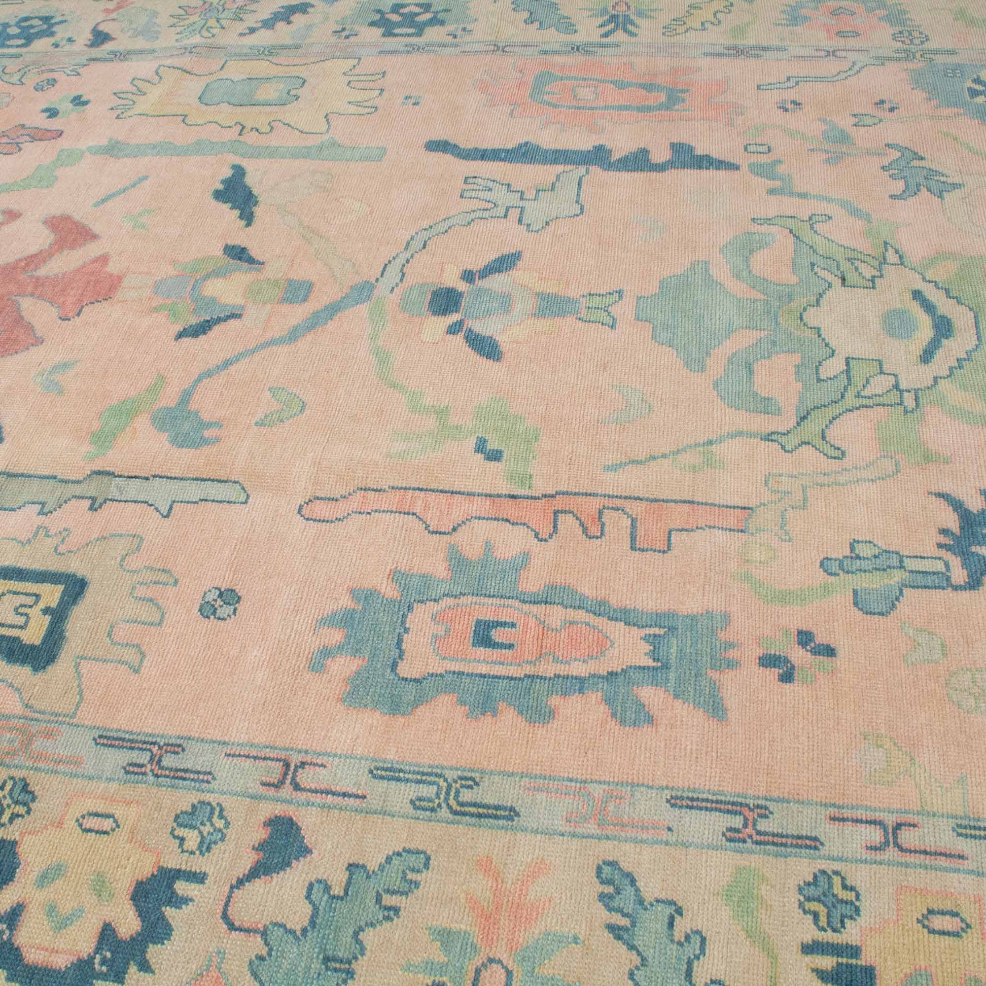 This custom oushak-inspired wool rug was designed by Scout and hand knotted  by artisans in India. The traditional oushak pattern is given a fresh feel with light pastel pink and blues for the modern home.