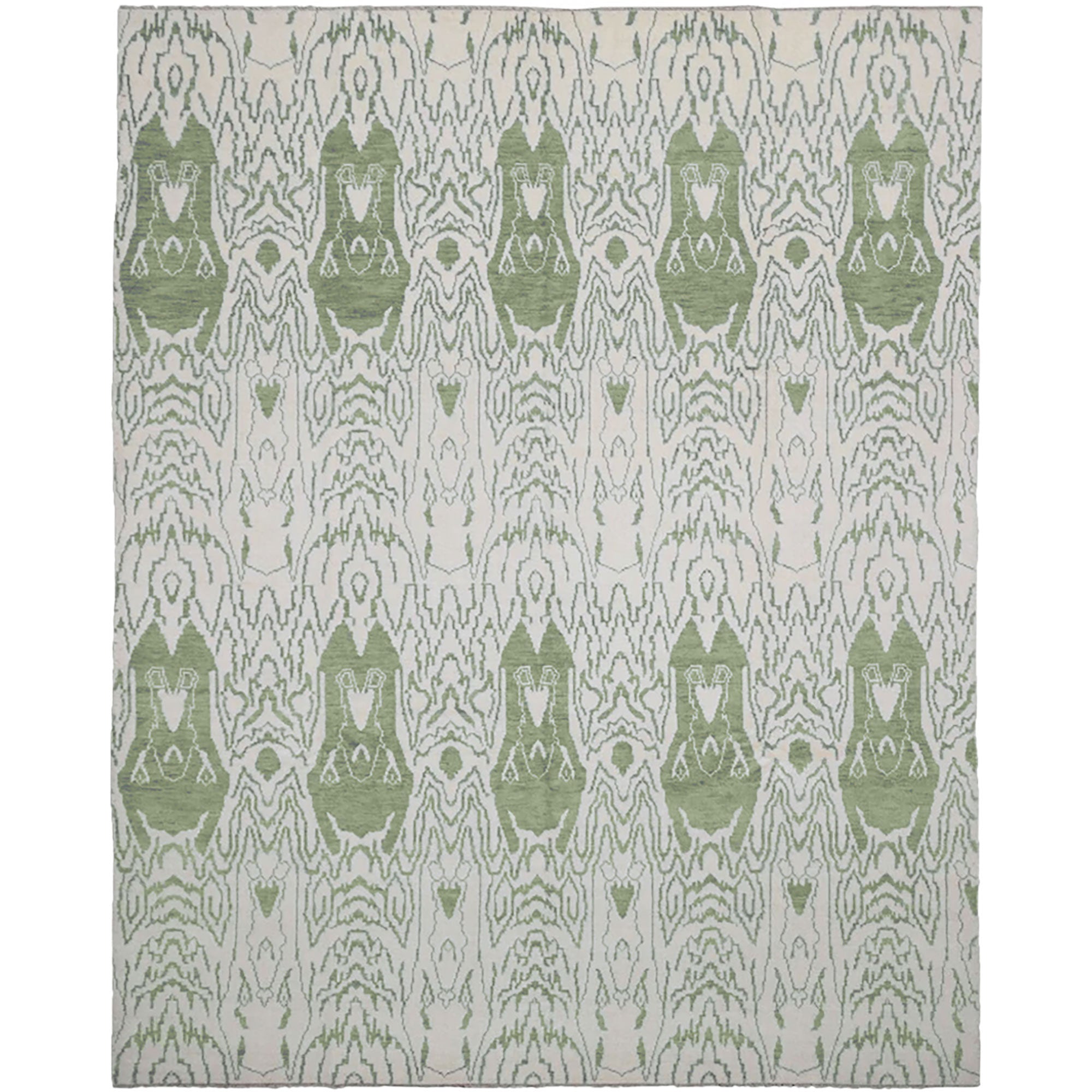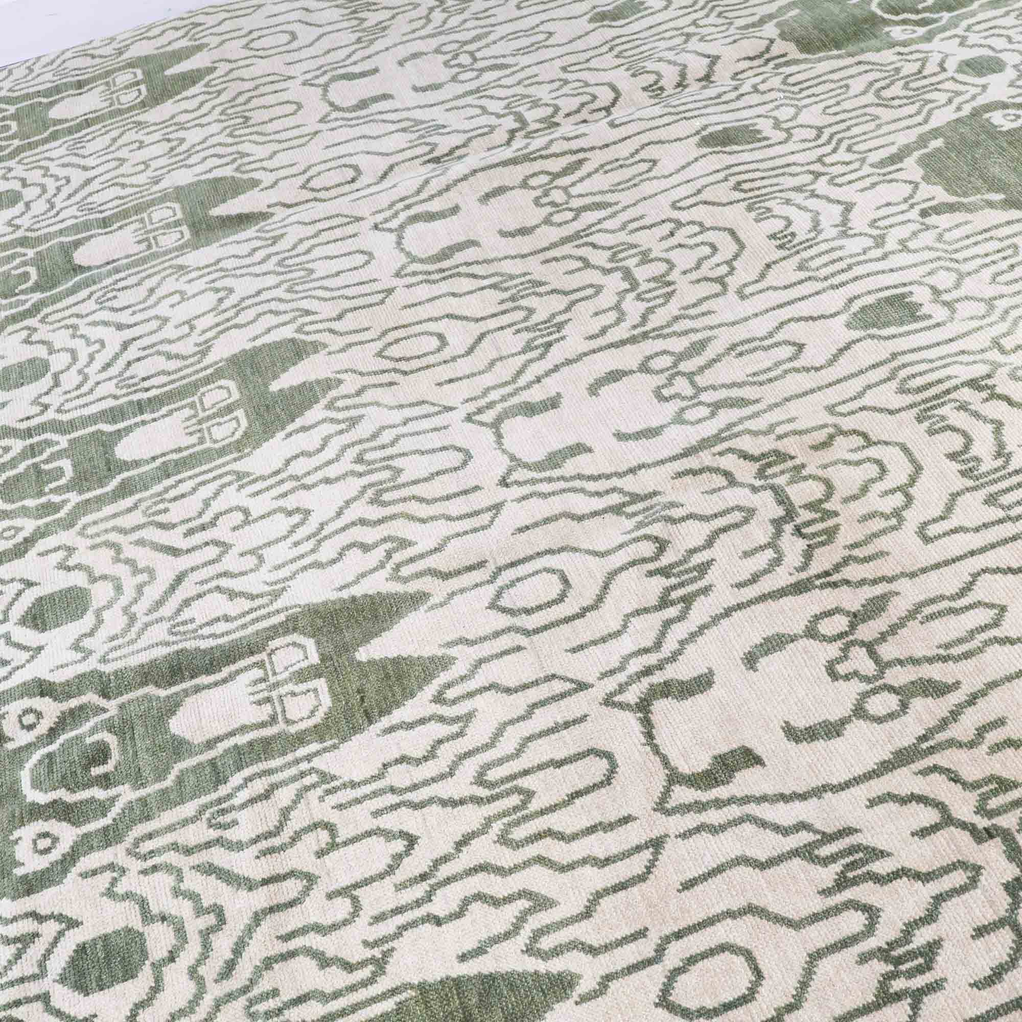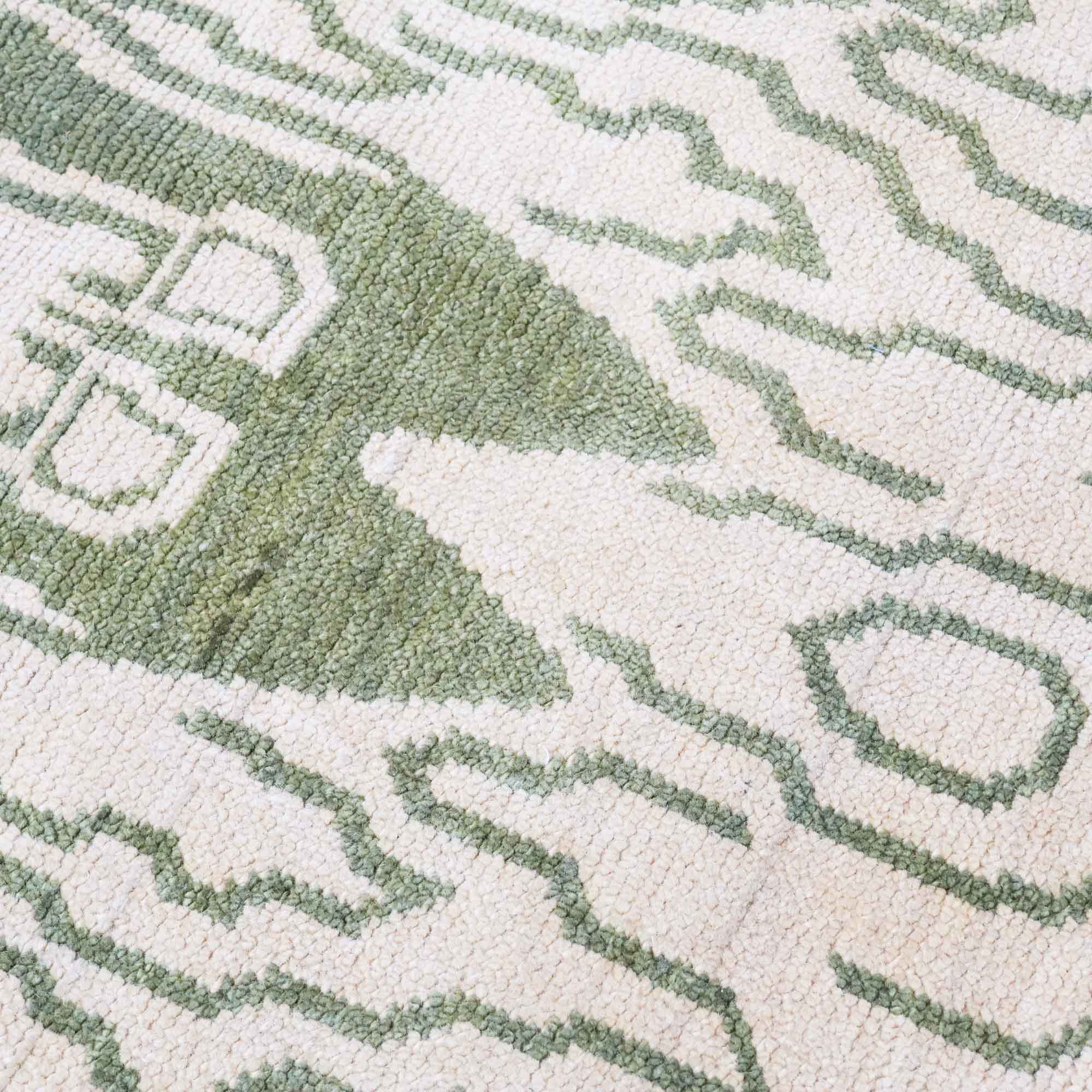 Our Taiga rug features a subtle tiger pattern that hides in plain sight with perfect olive green and cream hues. This custom wool rug is hand knotted by our incredible artisan partners in India.