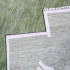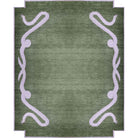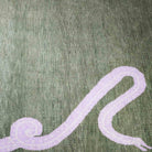 This custom oushak-inspired wool rug was designed by Scout and hand woven with a Turkish-style knot by artisans in India. The Viper Rug features an olive green background with a snake design and corner cut outs in lavender.