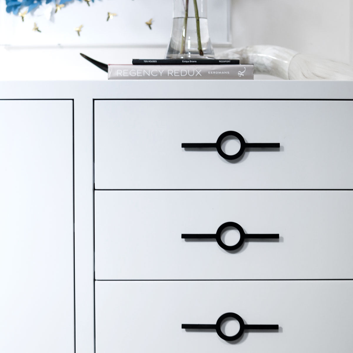 Circular handle hardware with a matte black finish. Use for drawers or cabinets.