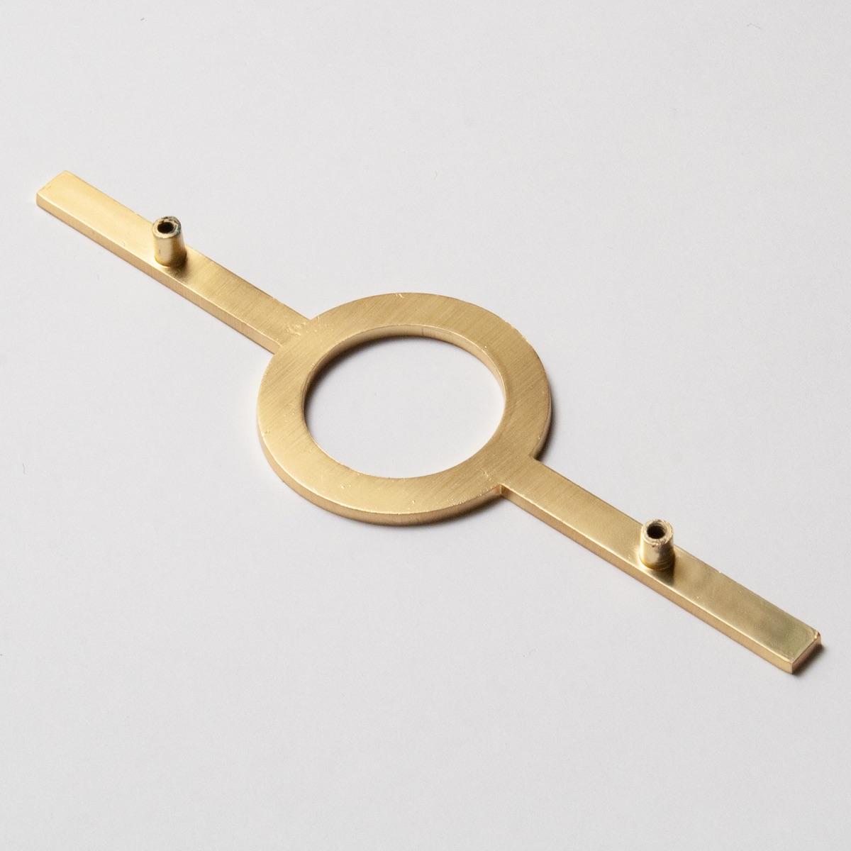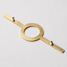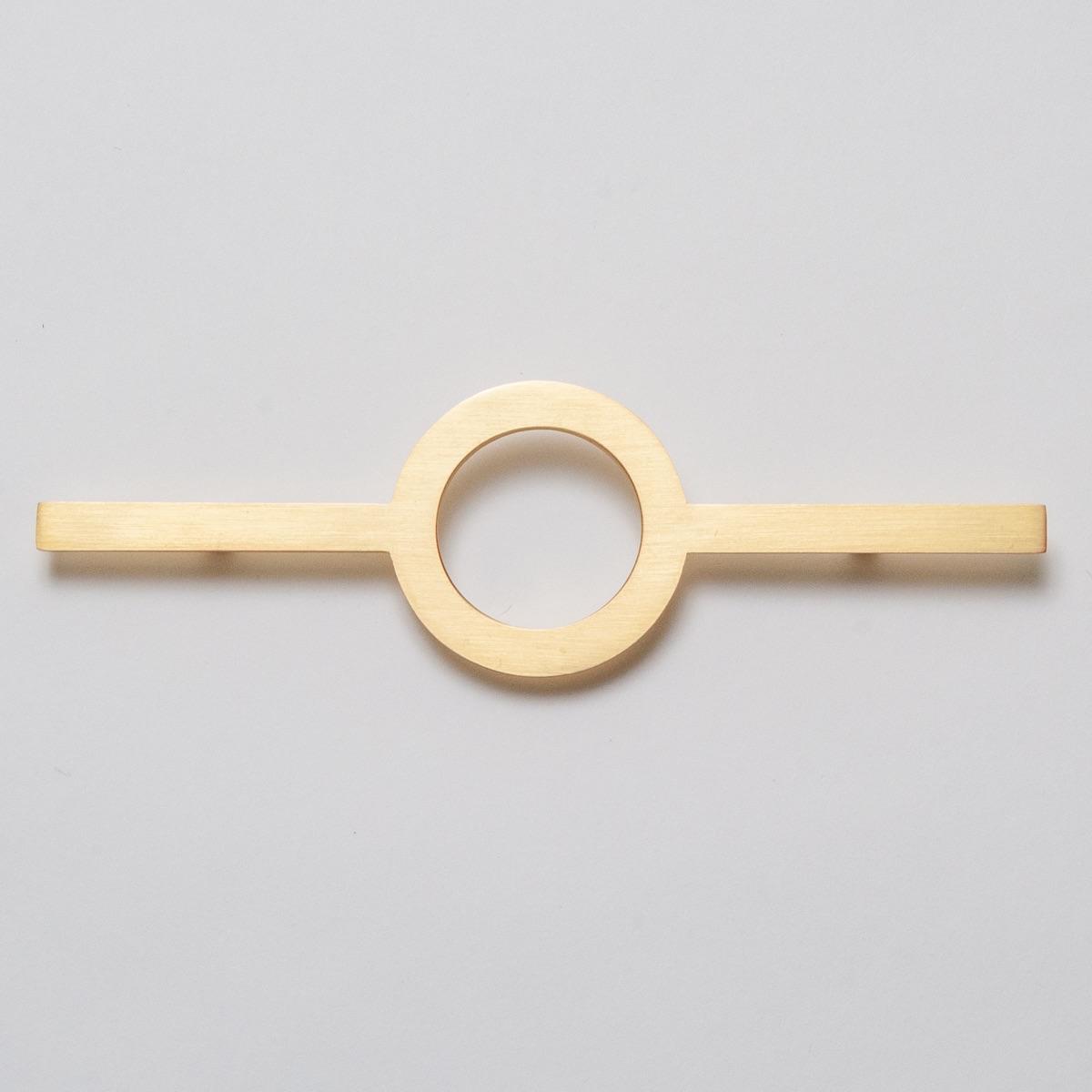 Circular handle hardware with a gold brass finish. Use for drawers or cabinets.