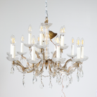 This vintage crystal chandelier is pure old-world glamour, with gracefully scrolling brass arms and delicate floral crystal rosettes - completely draped in faceted crystal drops, prisms, and beaded accents.