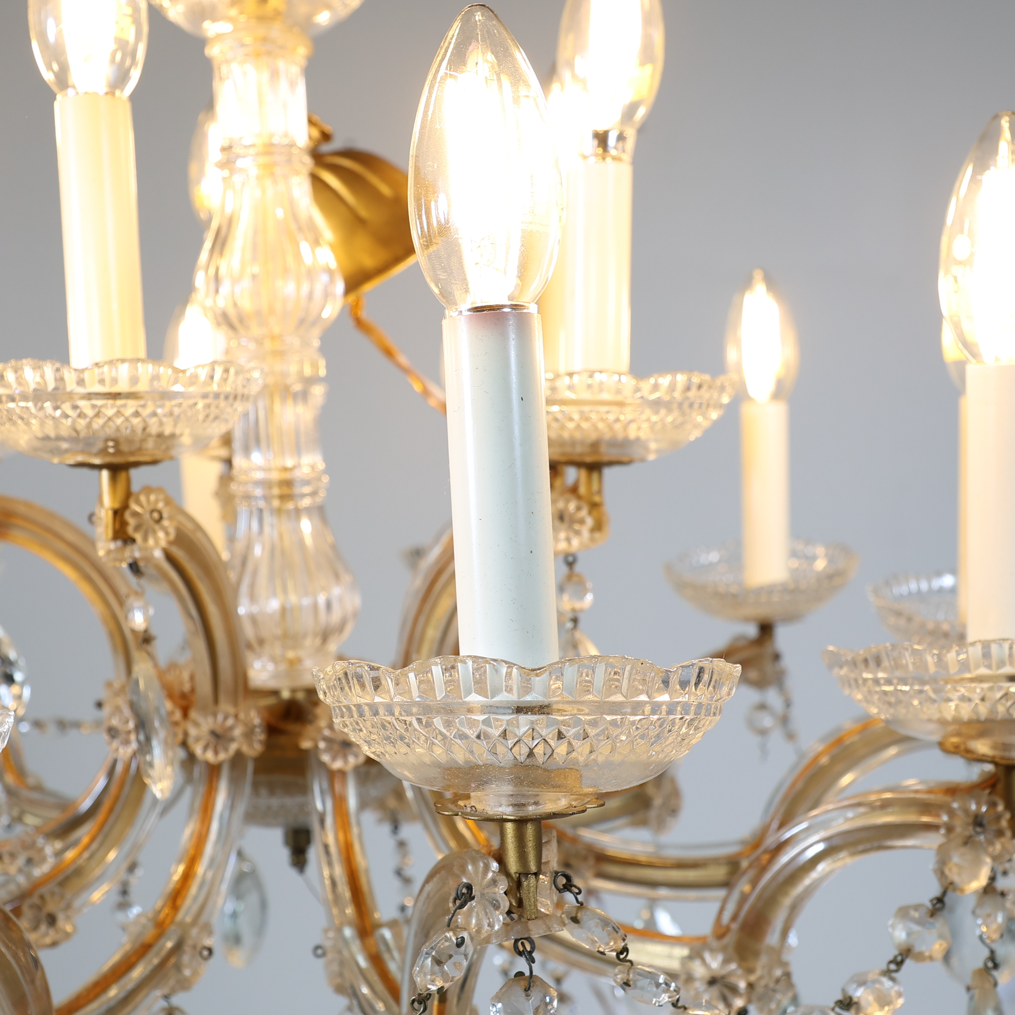 Each candle-style light sits in a cut crystal bobeche, adding layers of sparkle and romance.