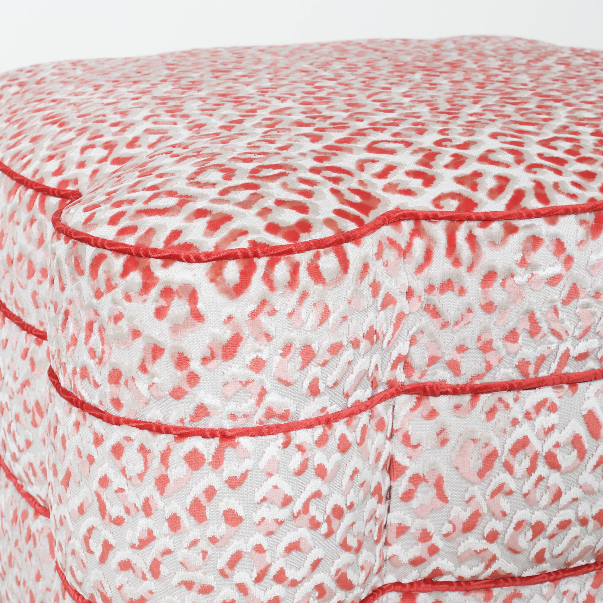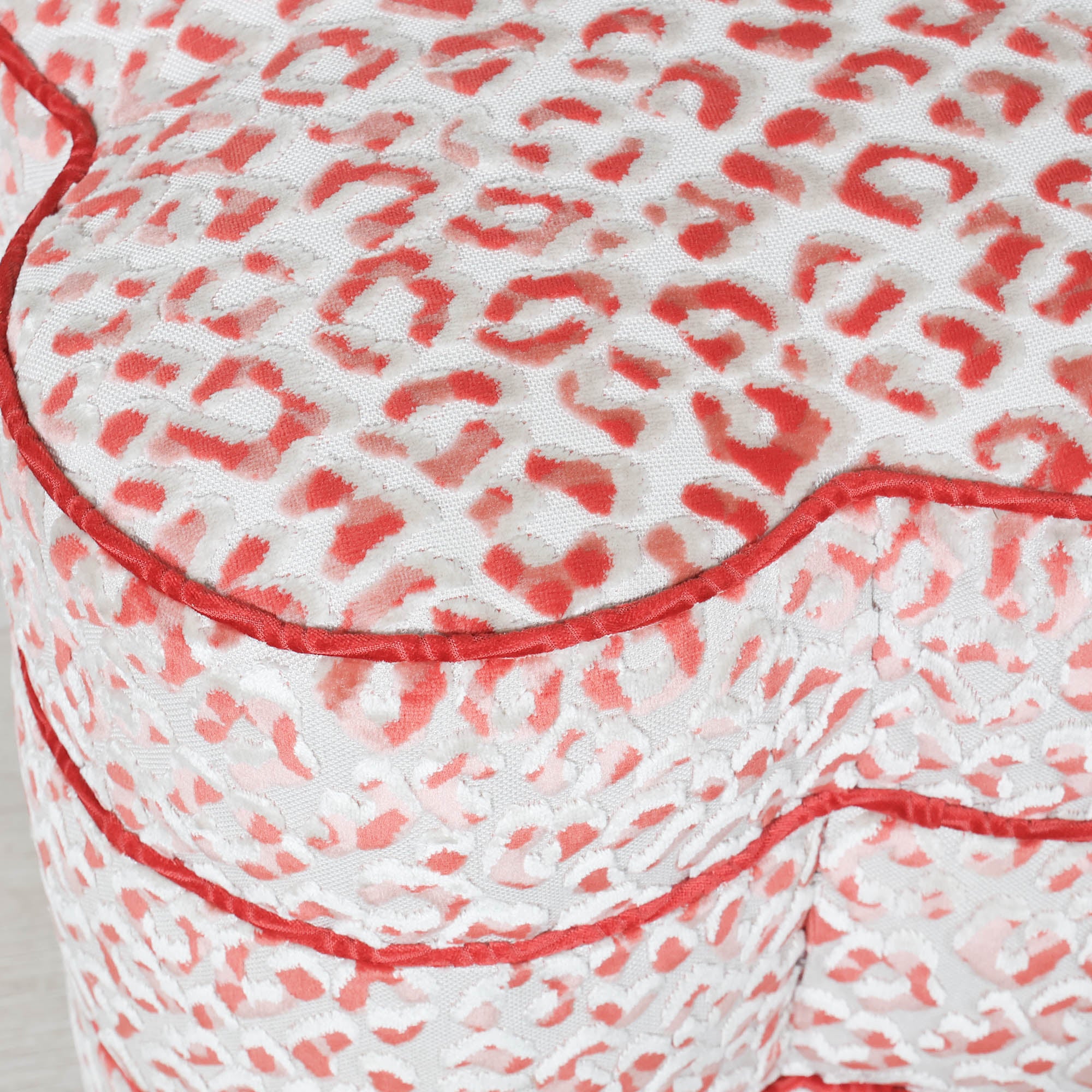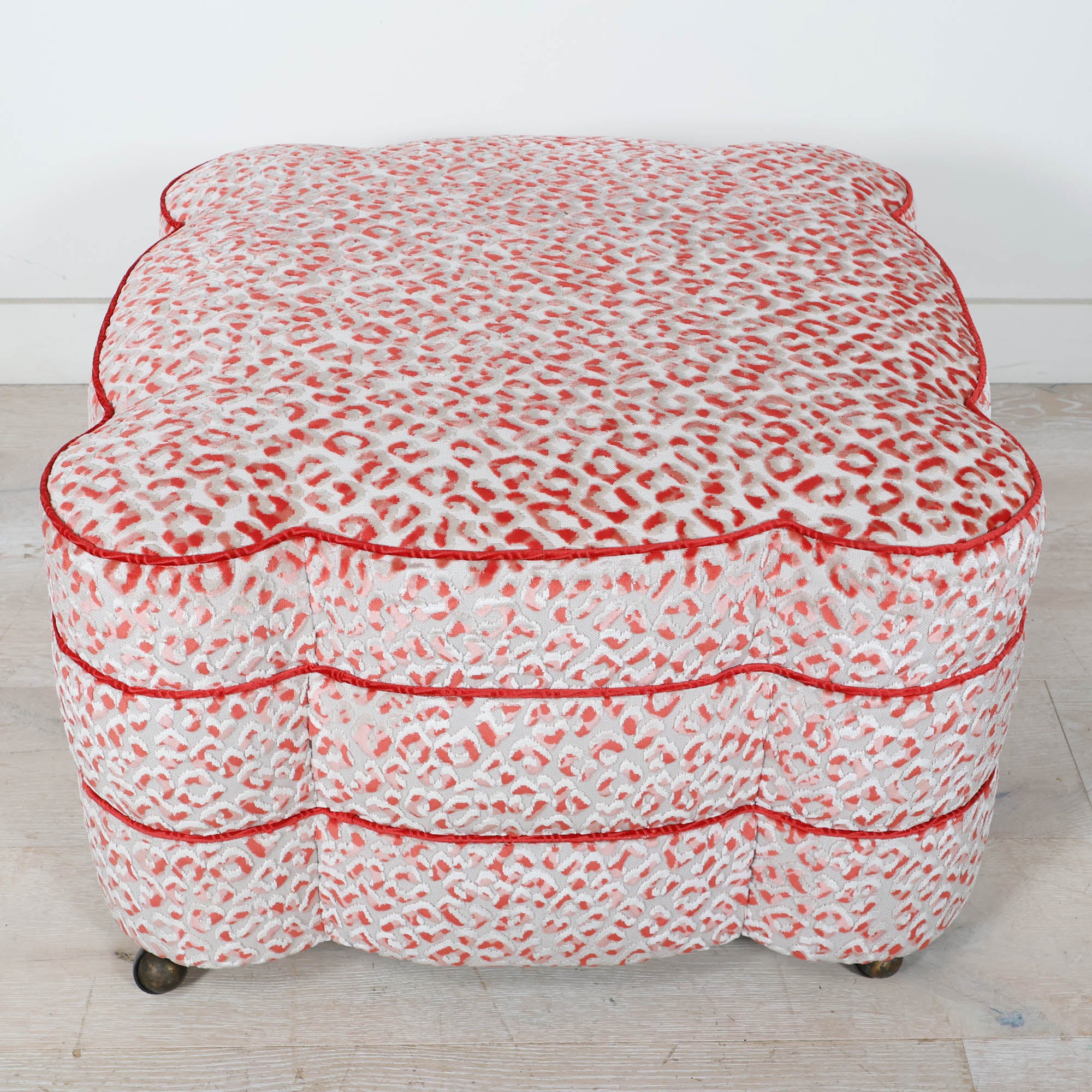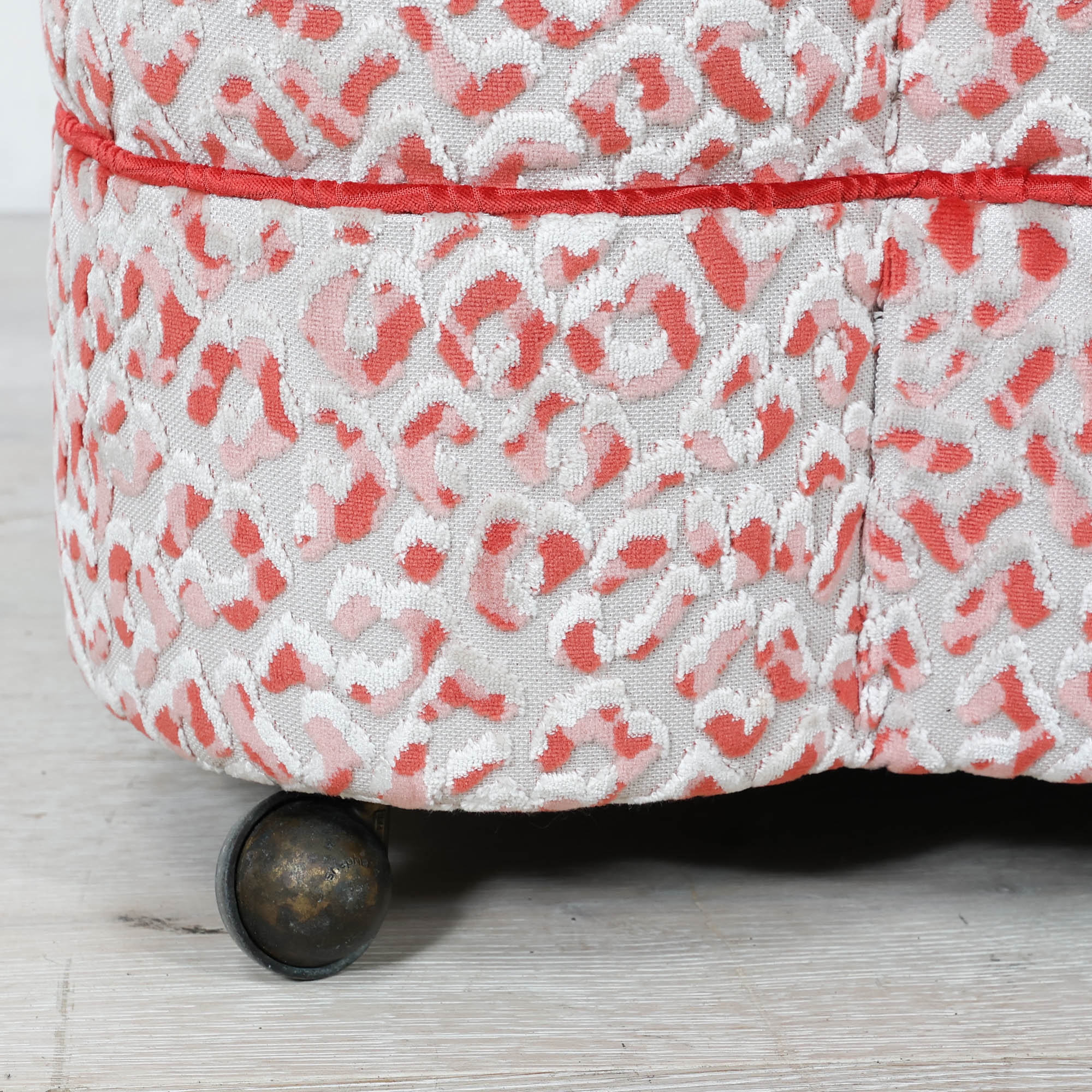 This scalloped ottoman is upholstered in coral leopard fabric with crisp piping and sits on vintage casters for easy movement. The upholstery is new and in fabulous condition, giving the piece a fresh look while keeping its playful, classic shape.