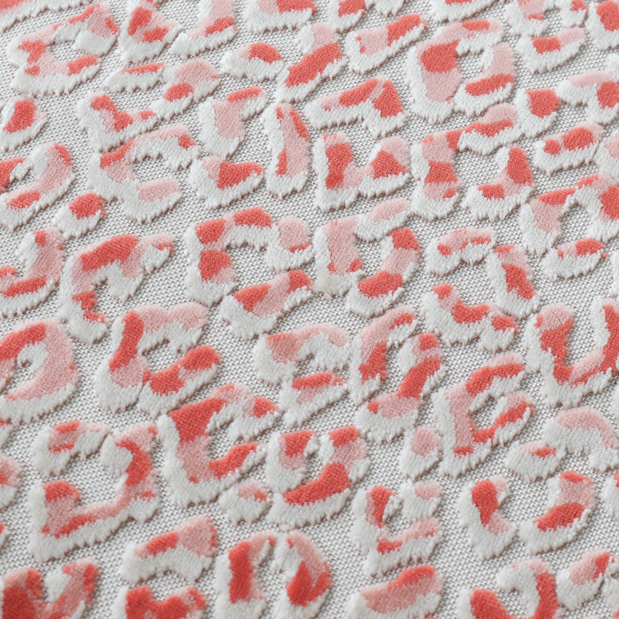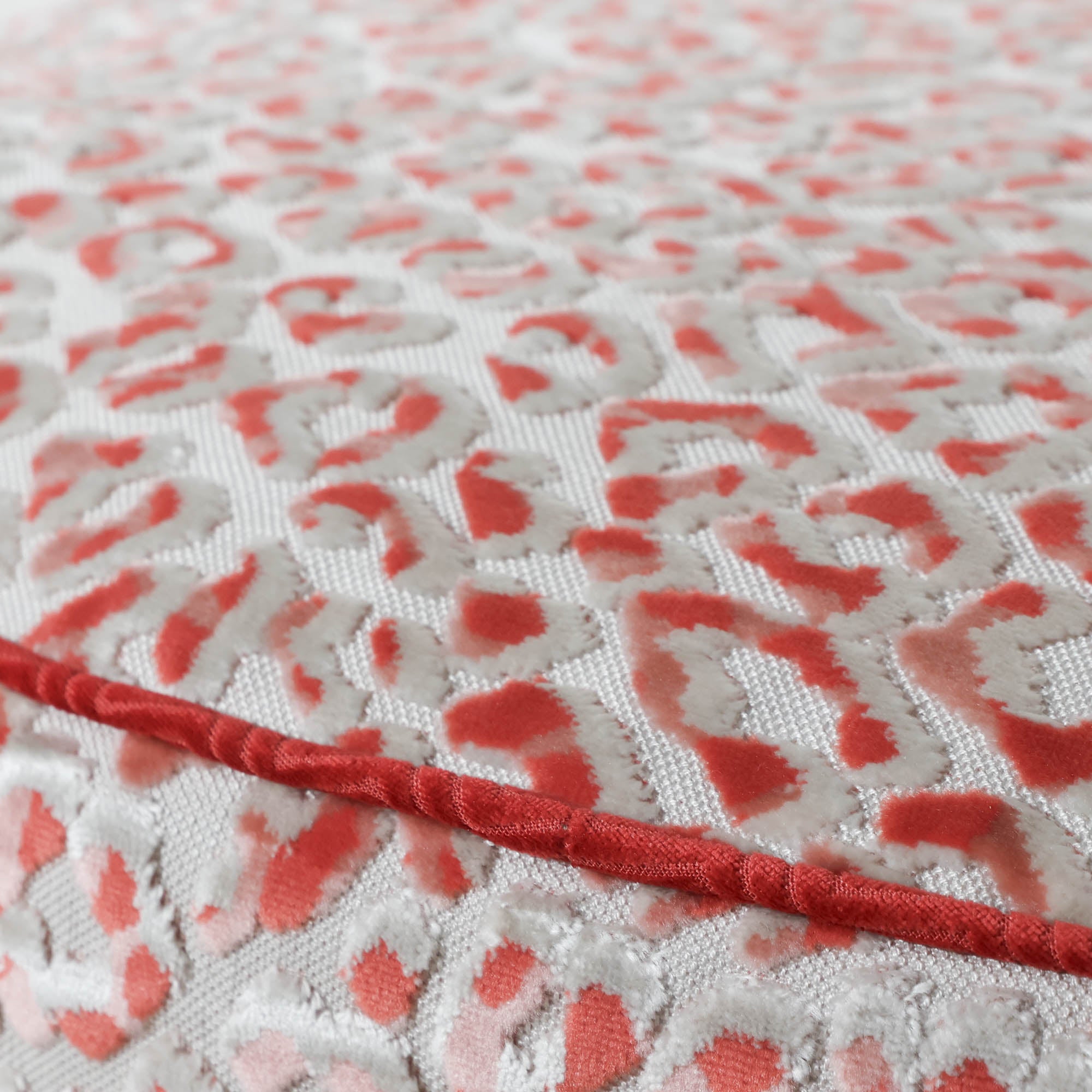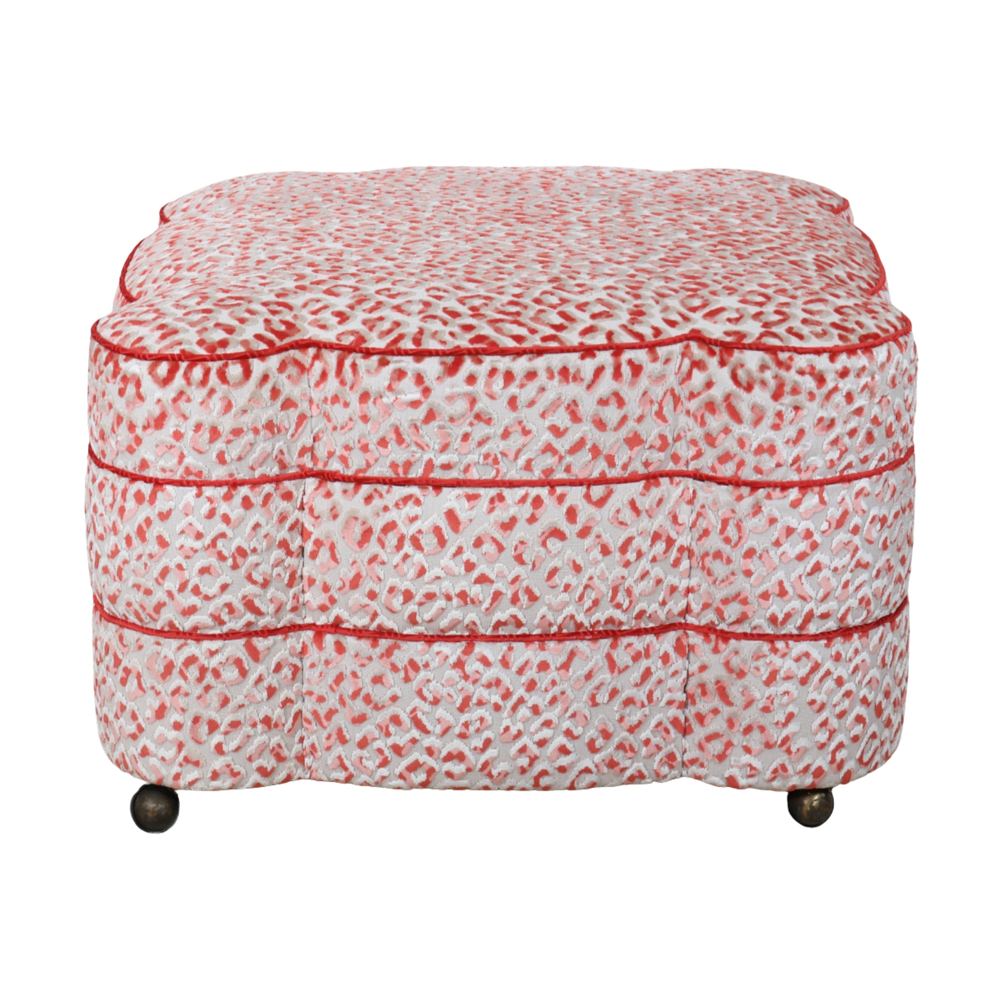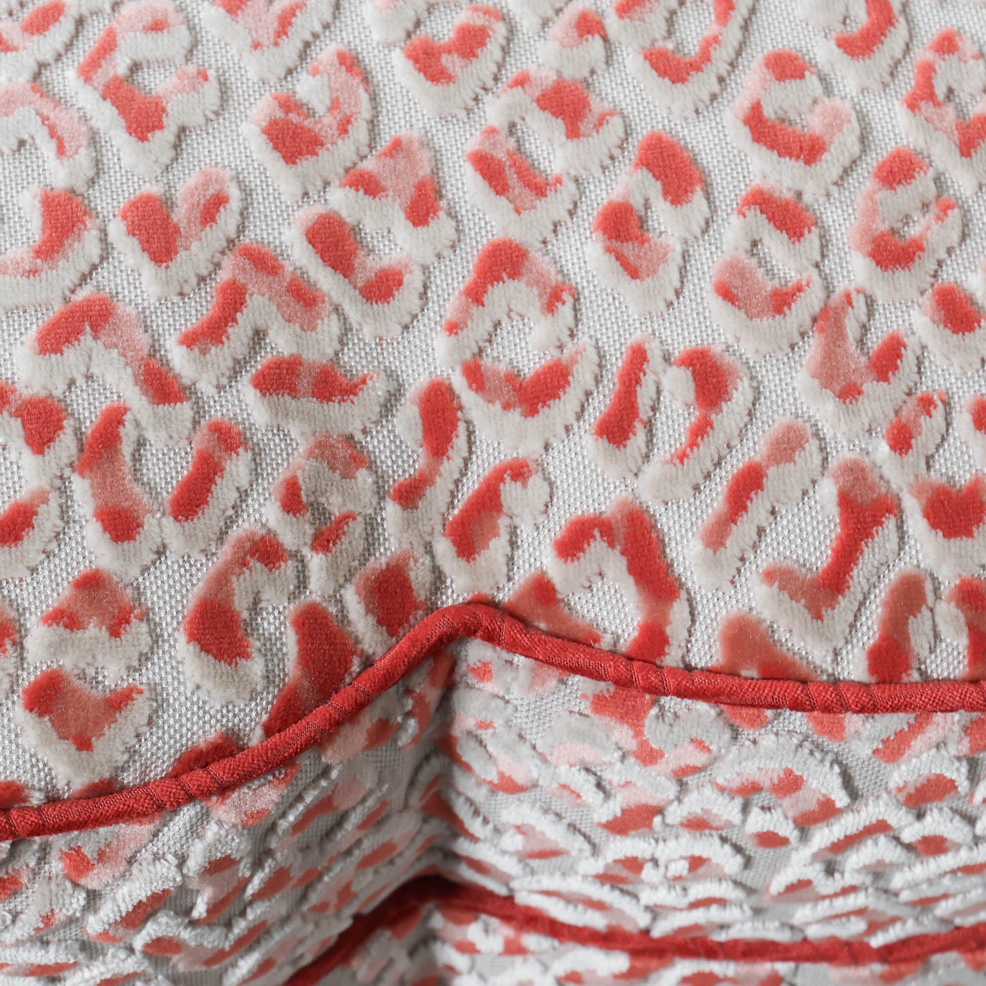 This scalloped ottoman is upholstered in coral leopard fabric with crisp piping and sits on vintage casters for easy movement. The upholstery is new and in fabulous condition, giving the piece a fresh look while keeping its playful, classic shape.