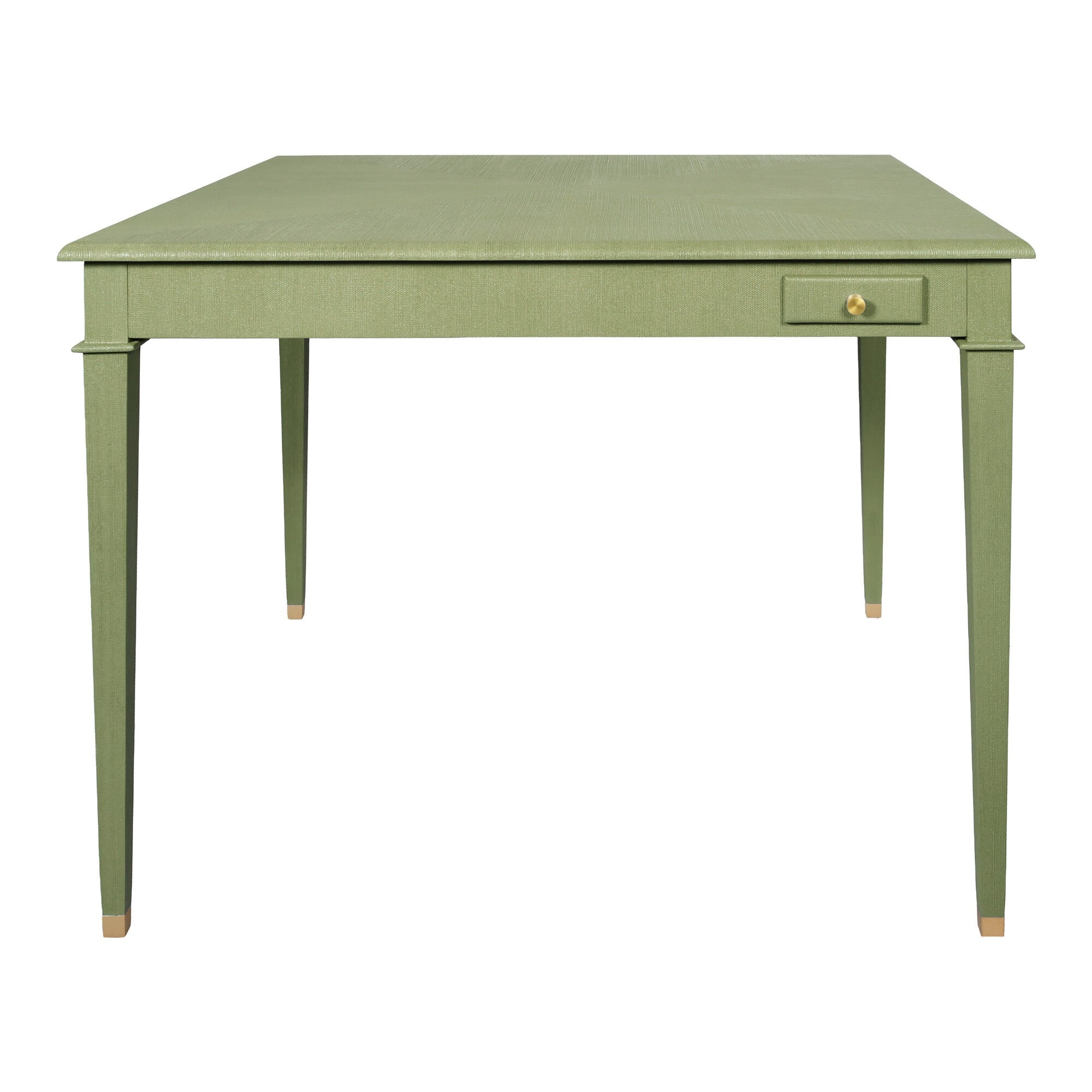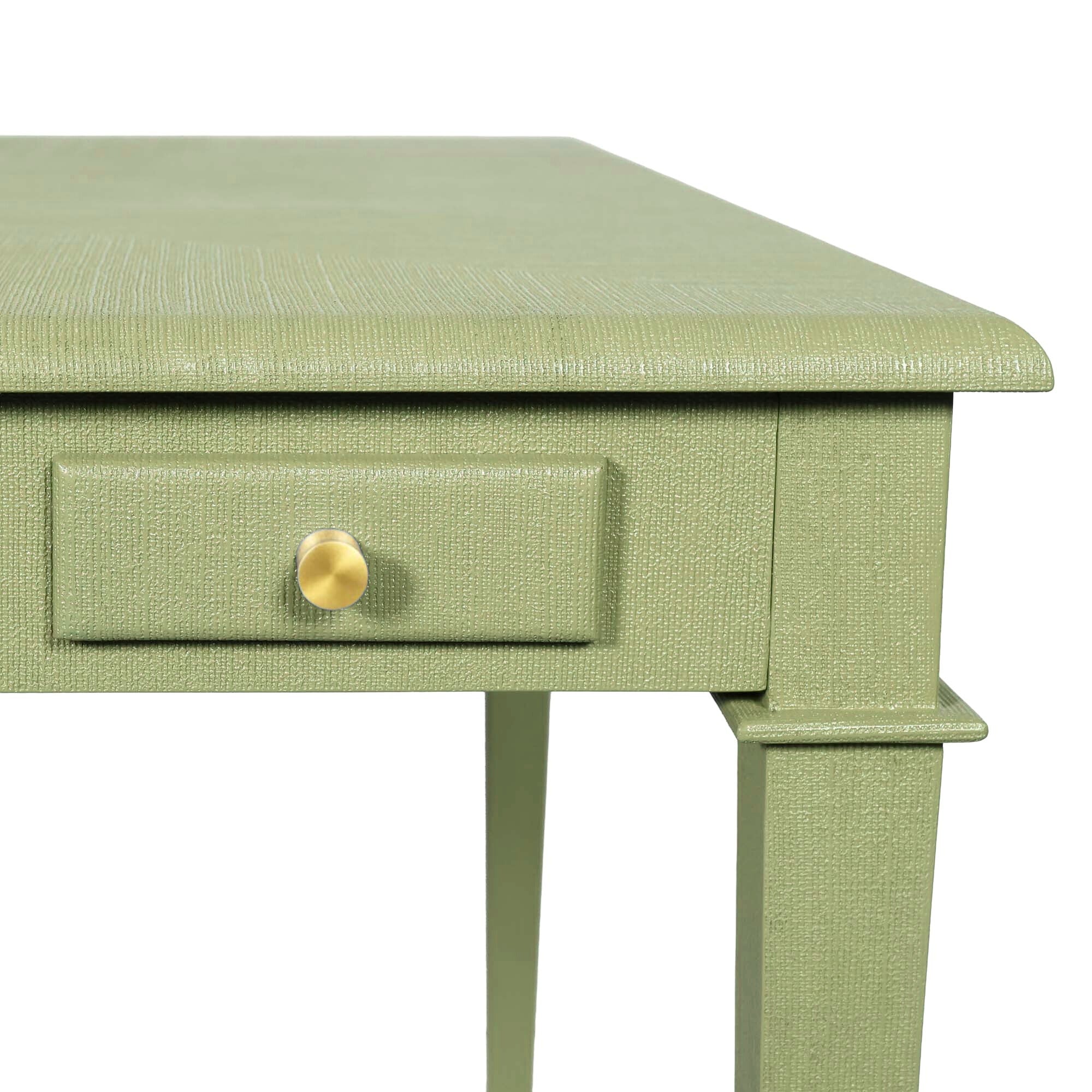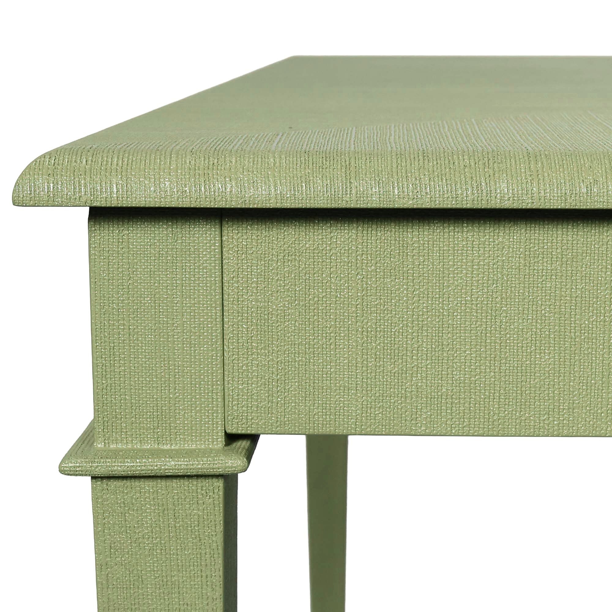 With 4 push-close coasters tucked into each corner and finished with petite brass pulls, The Parlor Game Table is ready for every shuffle, sip, and showdown. The tapered legs, subtle step-detail corners, and polished brass sabots bring a refined edge to its classic silhouette. Wrapped in a stunning and durable green faux linen, the tabletop’s opposing directional weave adds extra depth and dimension.