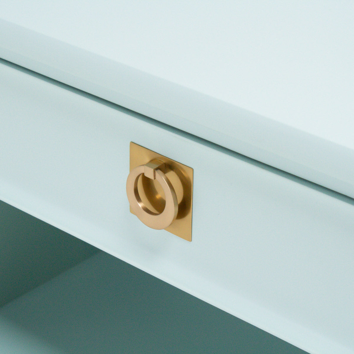 Our Liberation Chest is free to fit any decor you want it to! Polar Ice blue lacquer is accented with brass pulls and sabots for a touch of class.
