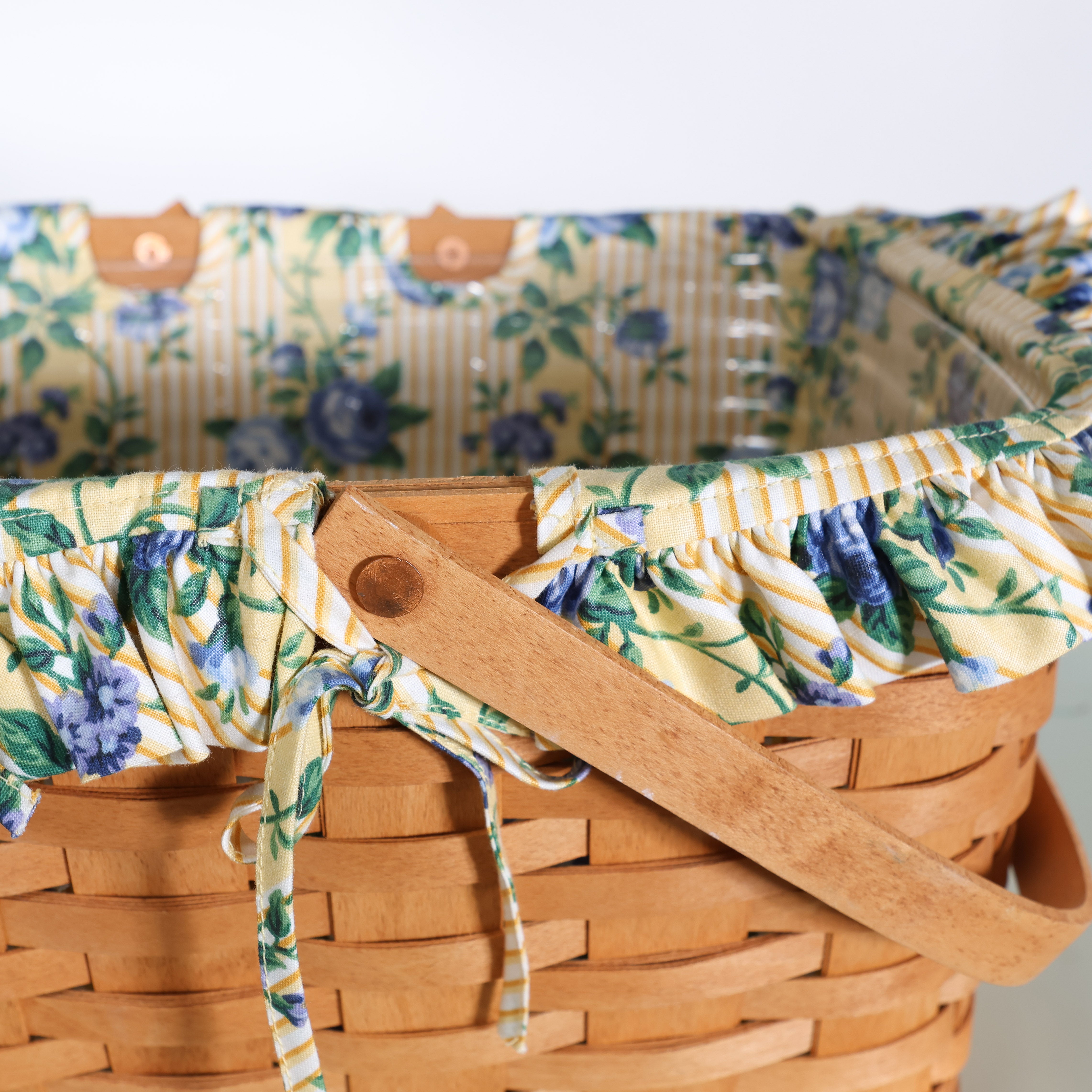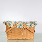 A large Longaberger basket featuring a sweet yellow floral liner and classic handwoven maple construction. Perfect for picnics or as a catchall!