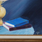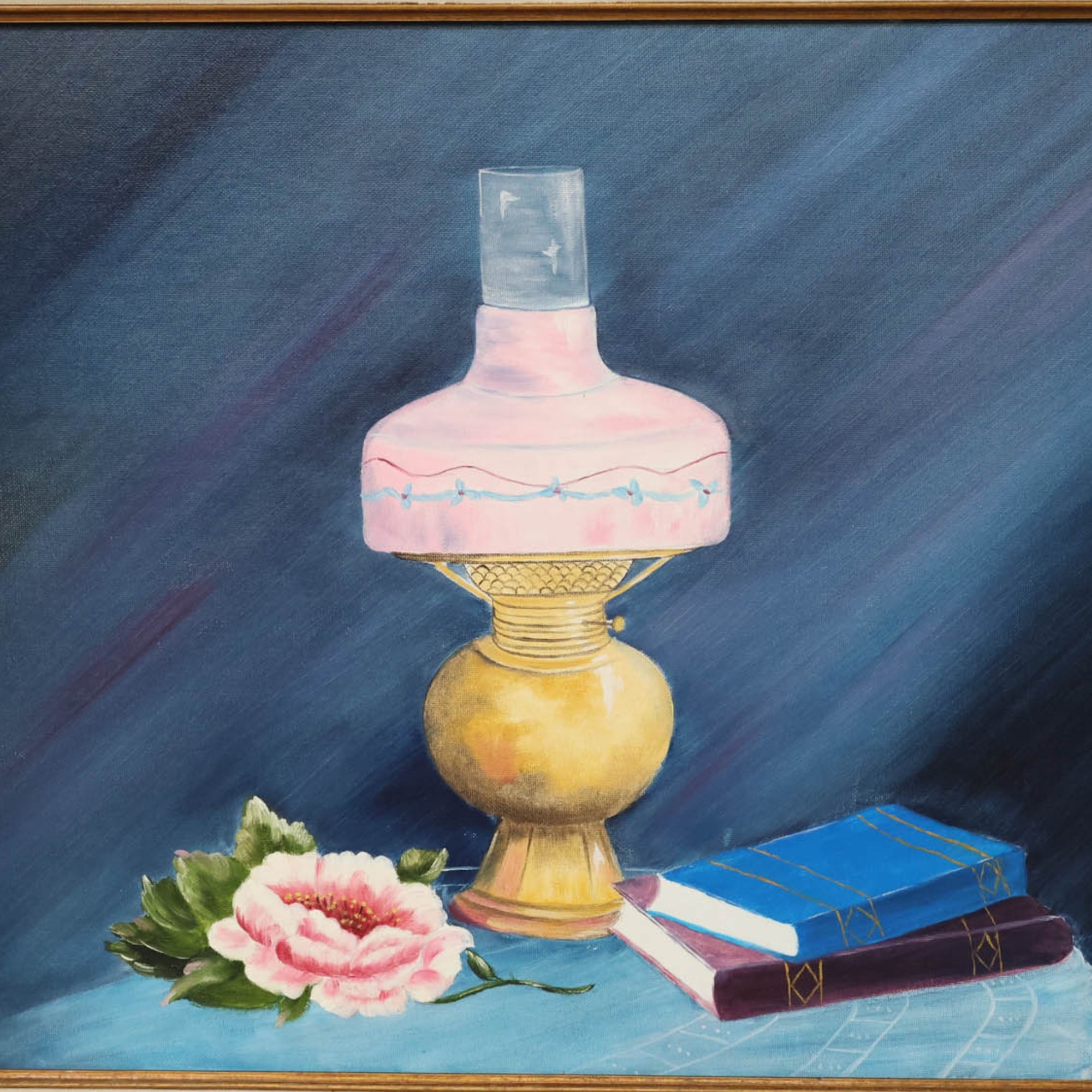 A still life that feels nostalgic, romantic, and softly luminous. This original painting features a vintage oil lamp with a blush pink shade, resting alongside stacked books and a single blooming peony. Set against a rich, moody blue background, the composition balances warmth and calm—classic objects rendered with a gentle, painterly touch.