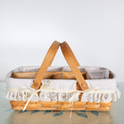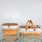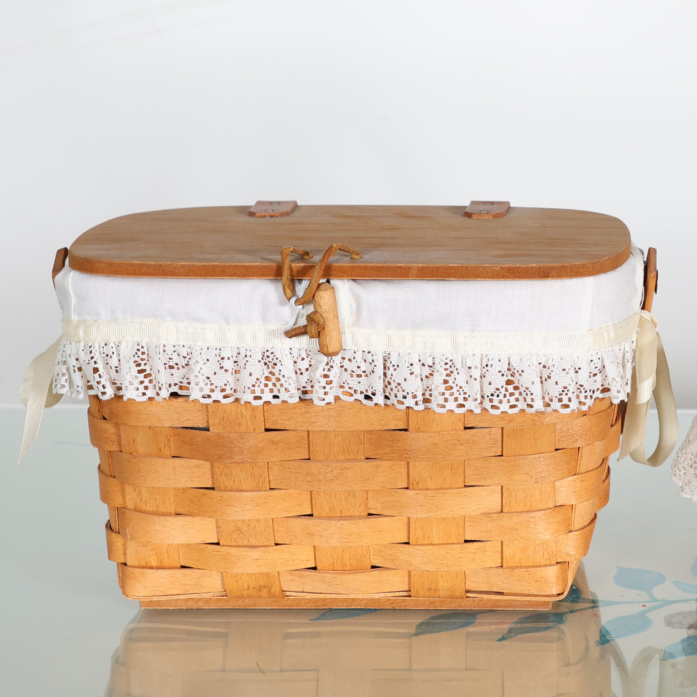 A darling pair of Longaberger baskets featuring classic handwoven maple construction and beautiful white lace fabric liners.