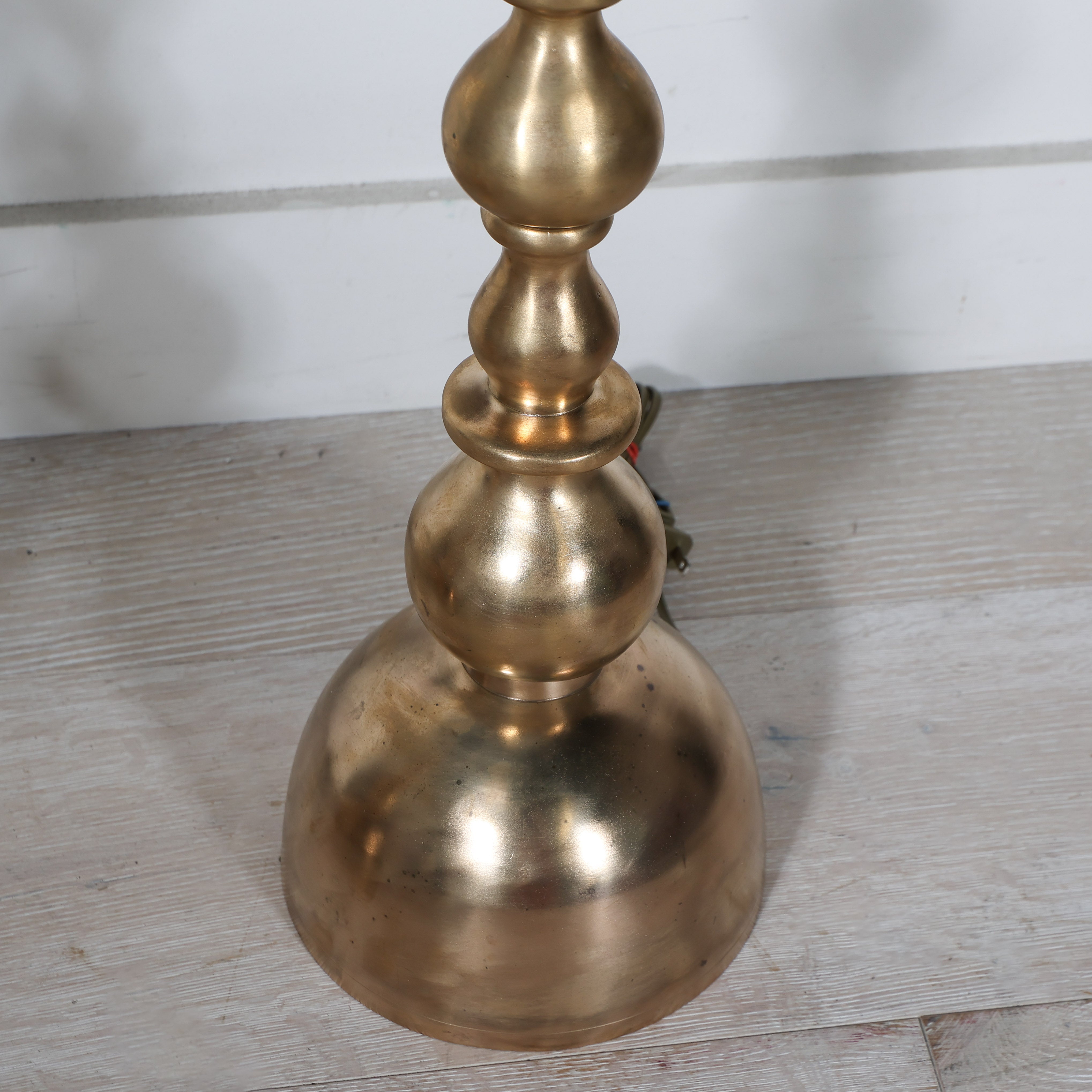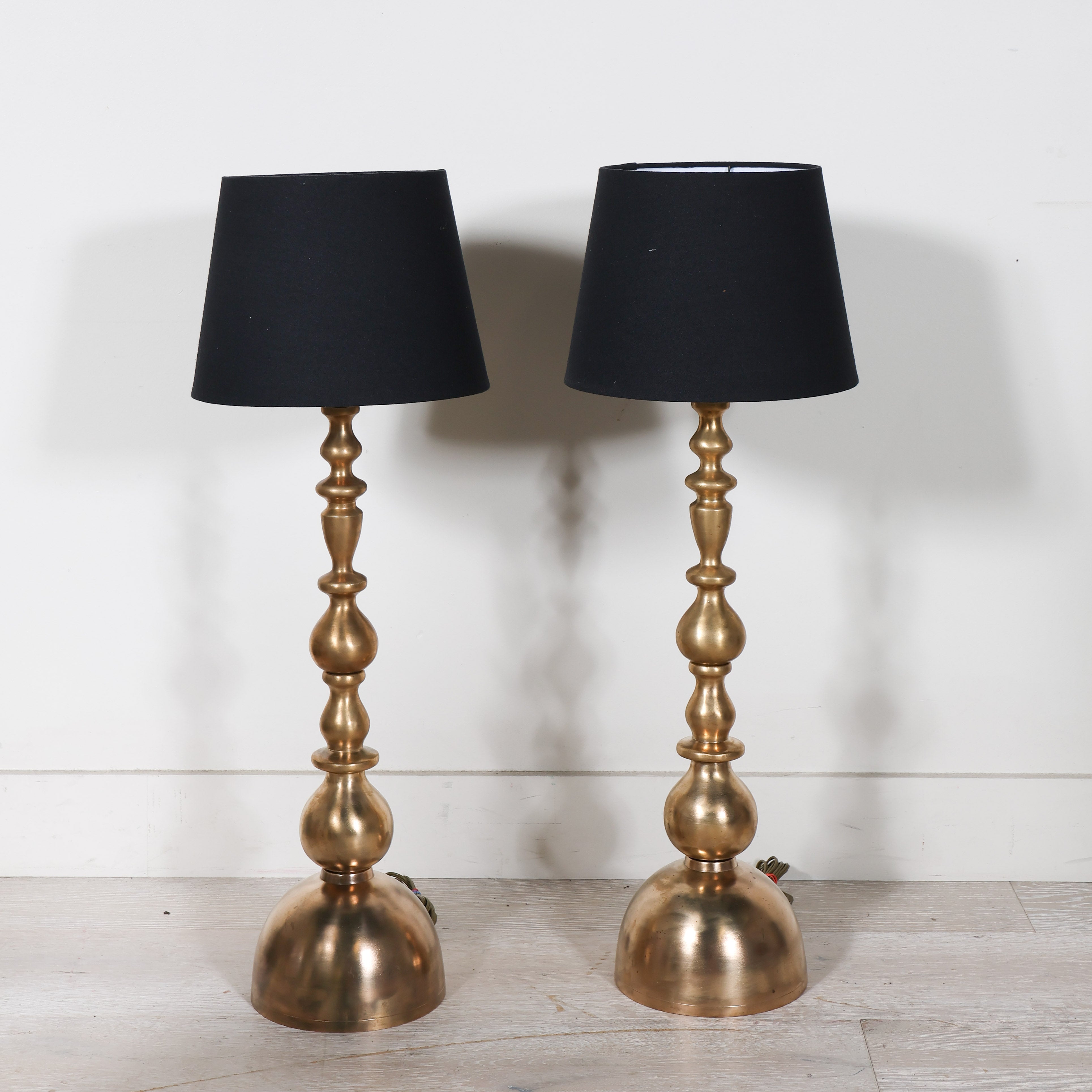 A great pair of tall brass lamps with turned bases and black shades. The stacked, rounded shapes give the lamps an elegant and versatile look.