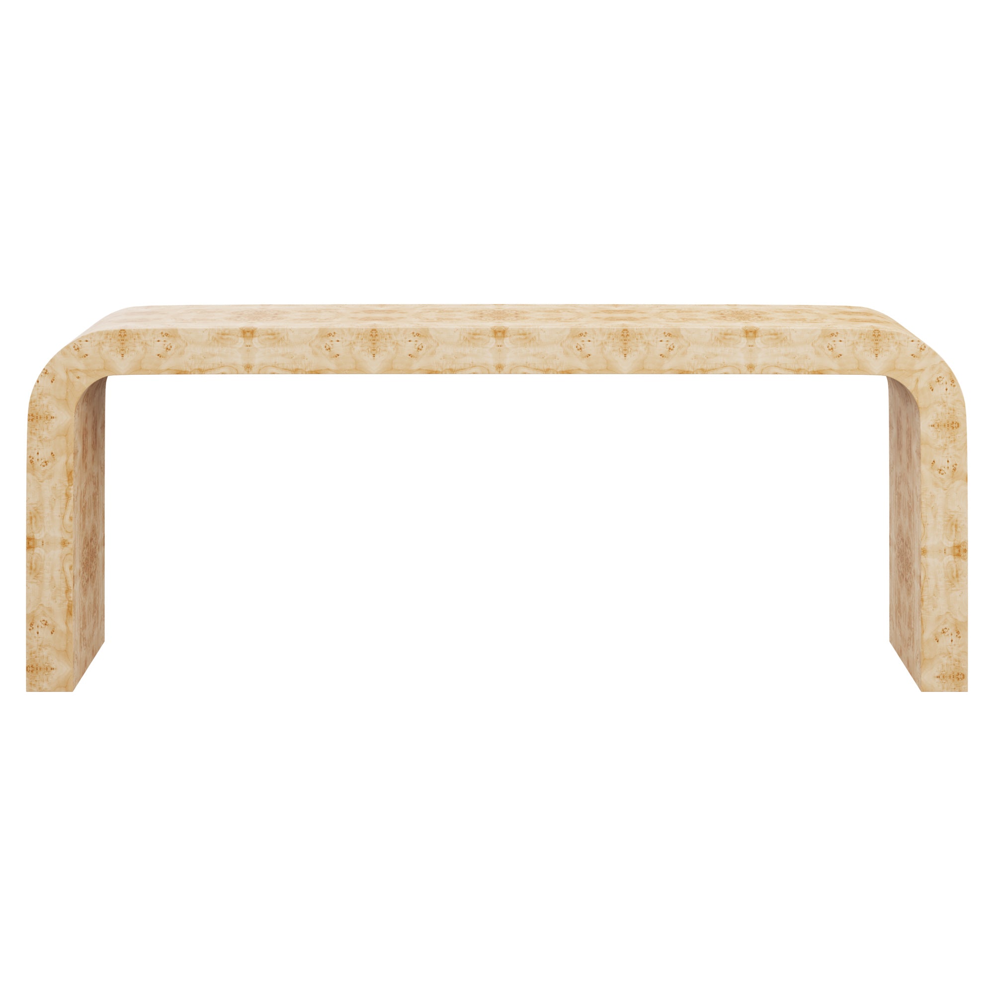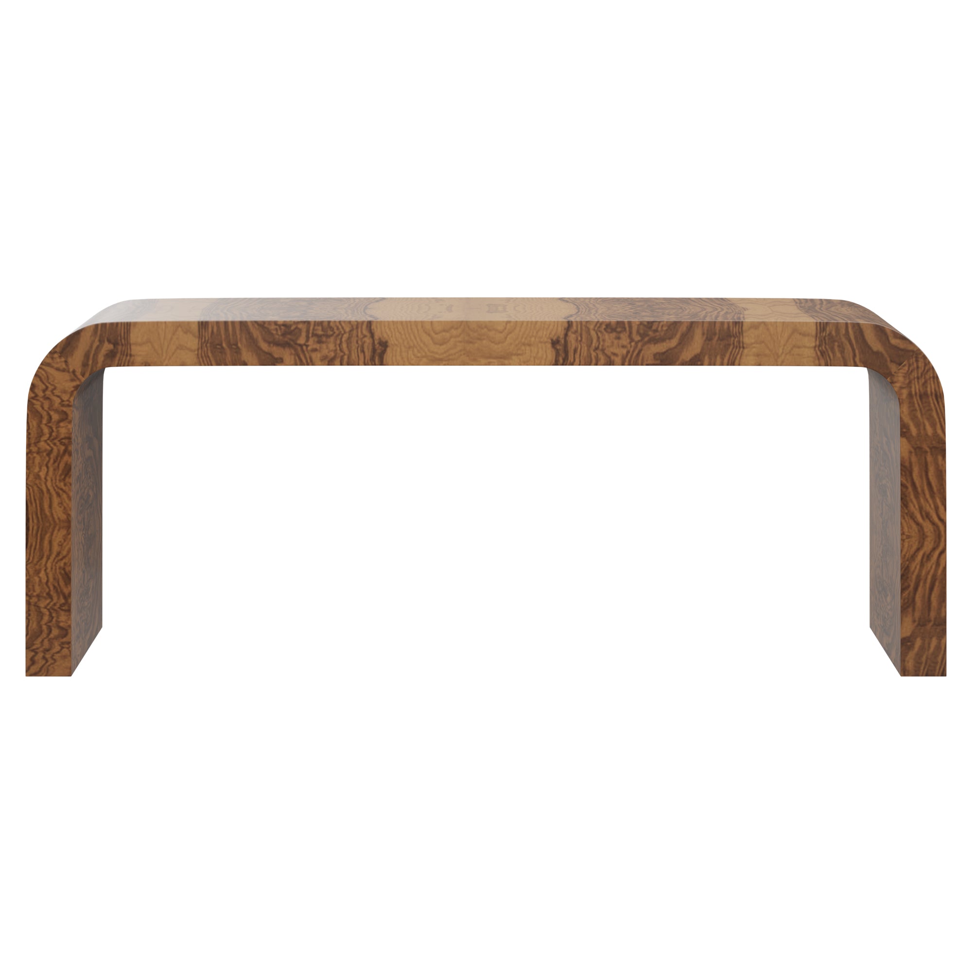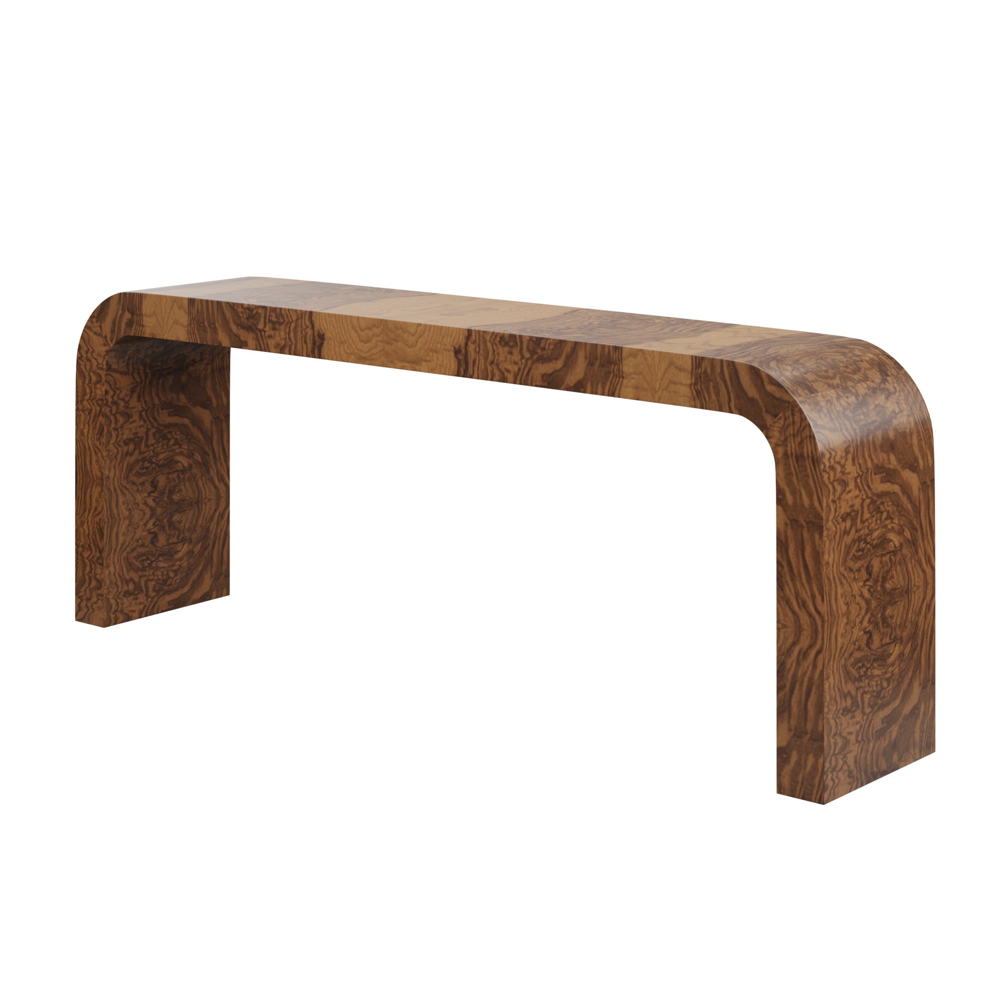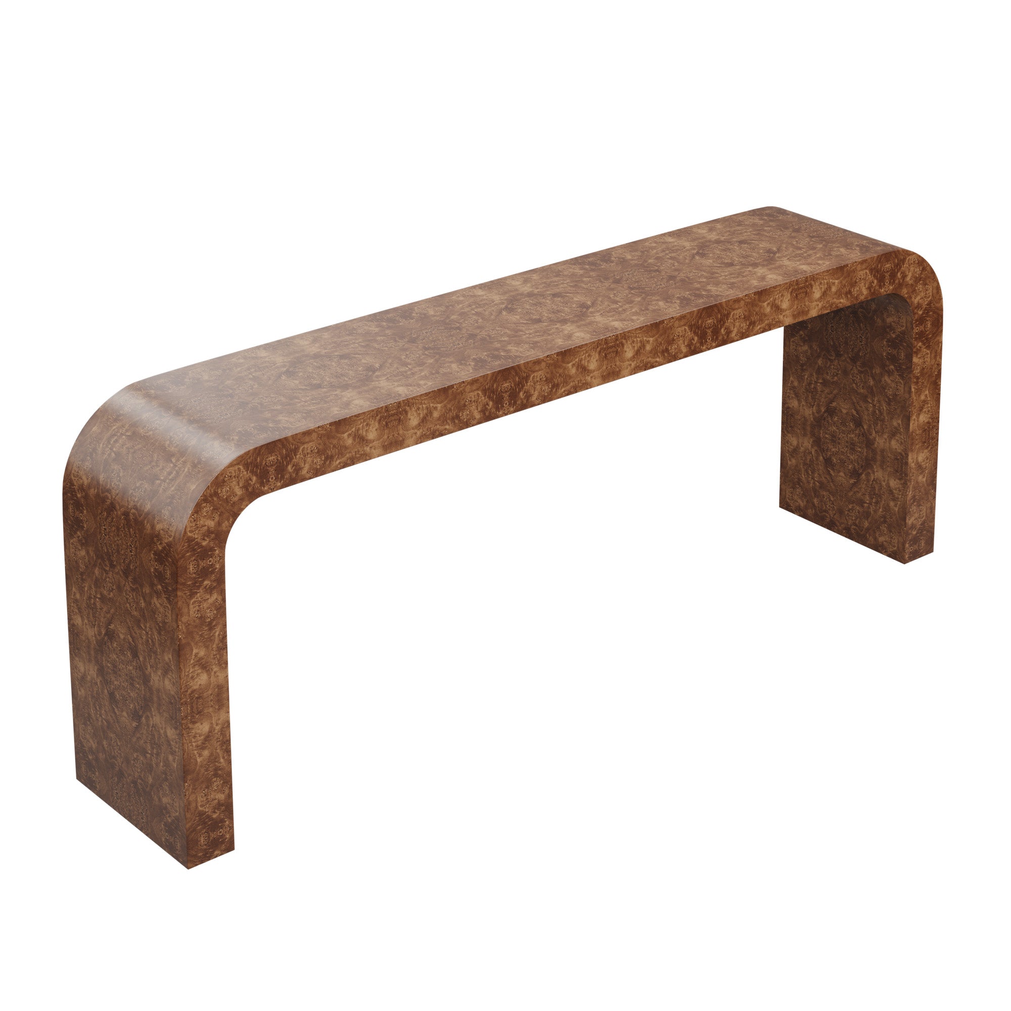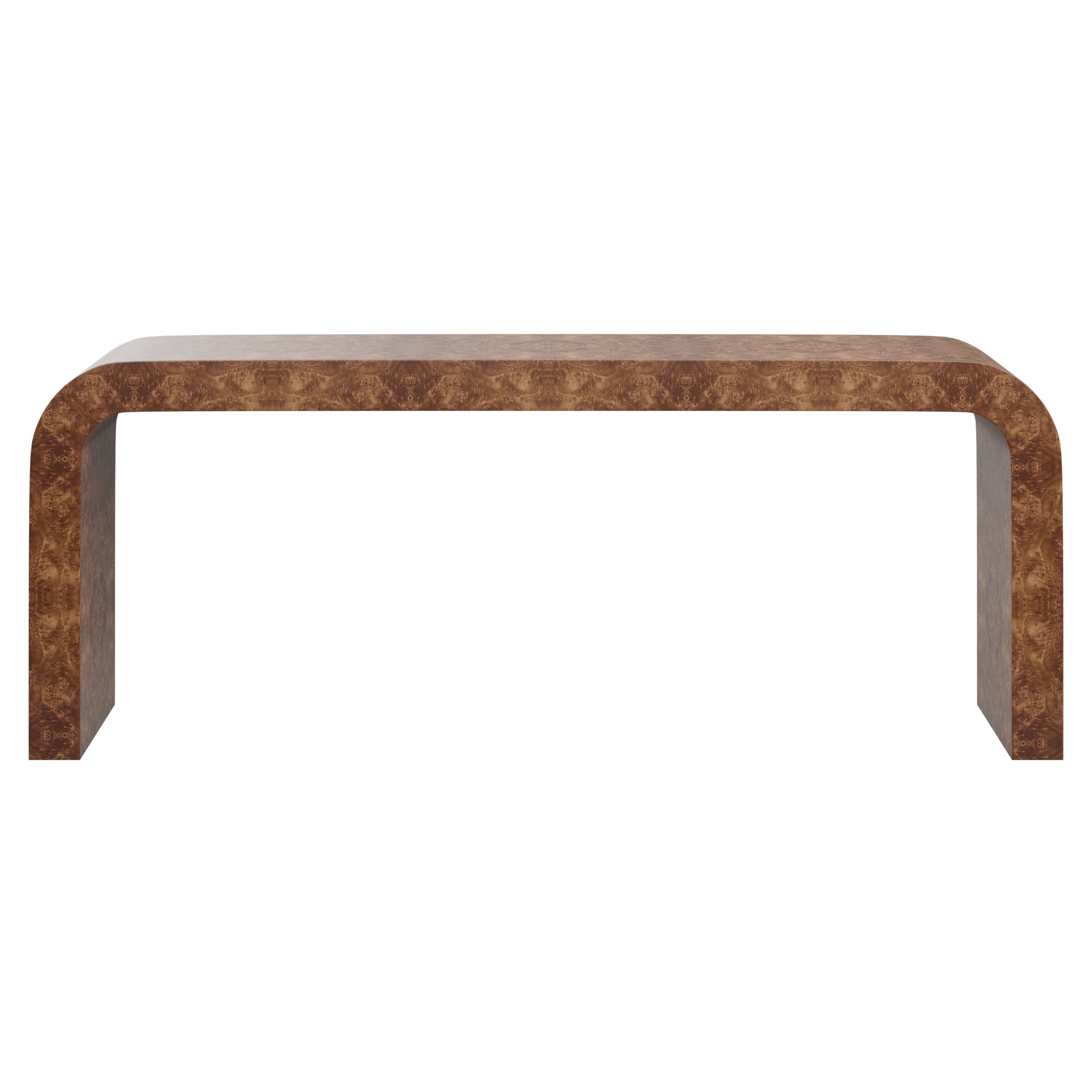 This MCM waterfall console table will steal the show with its simple shape and versatile design in timeless burl wood. Customizable with plenty of space for styling and storage underneath, this console has it all.