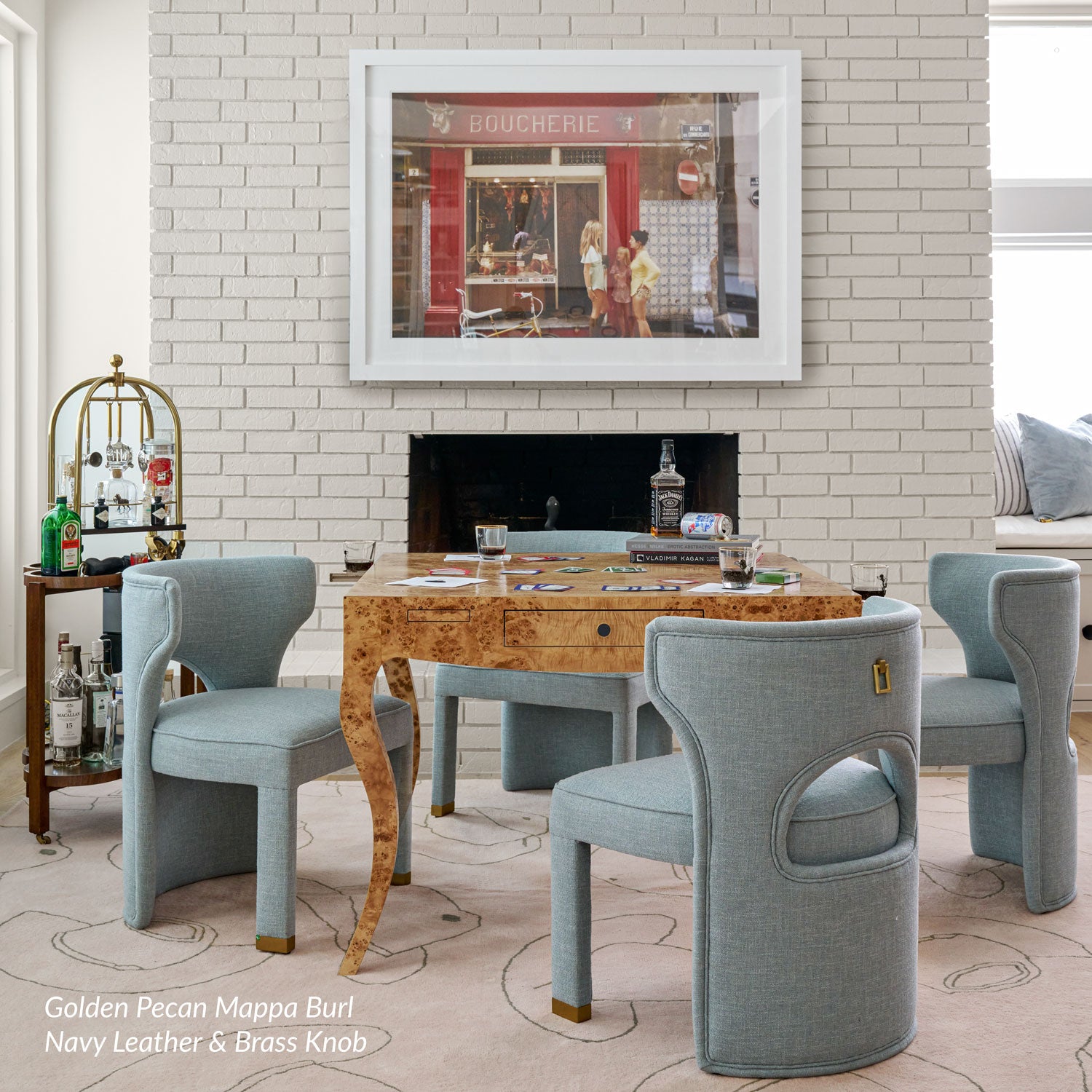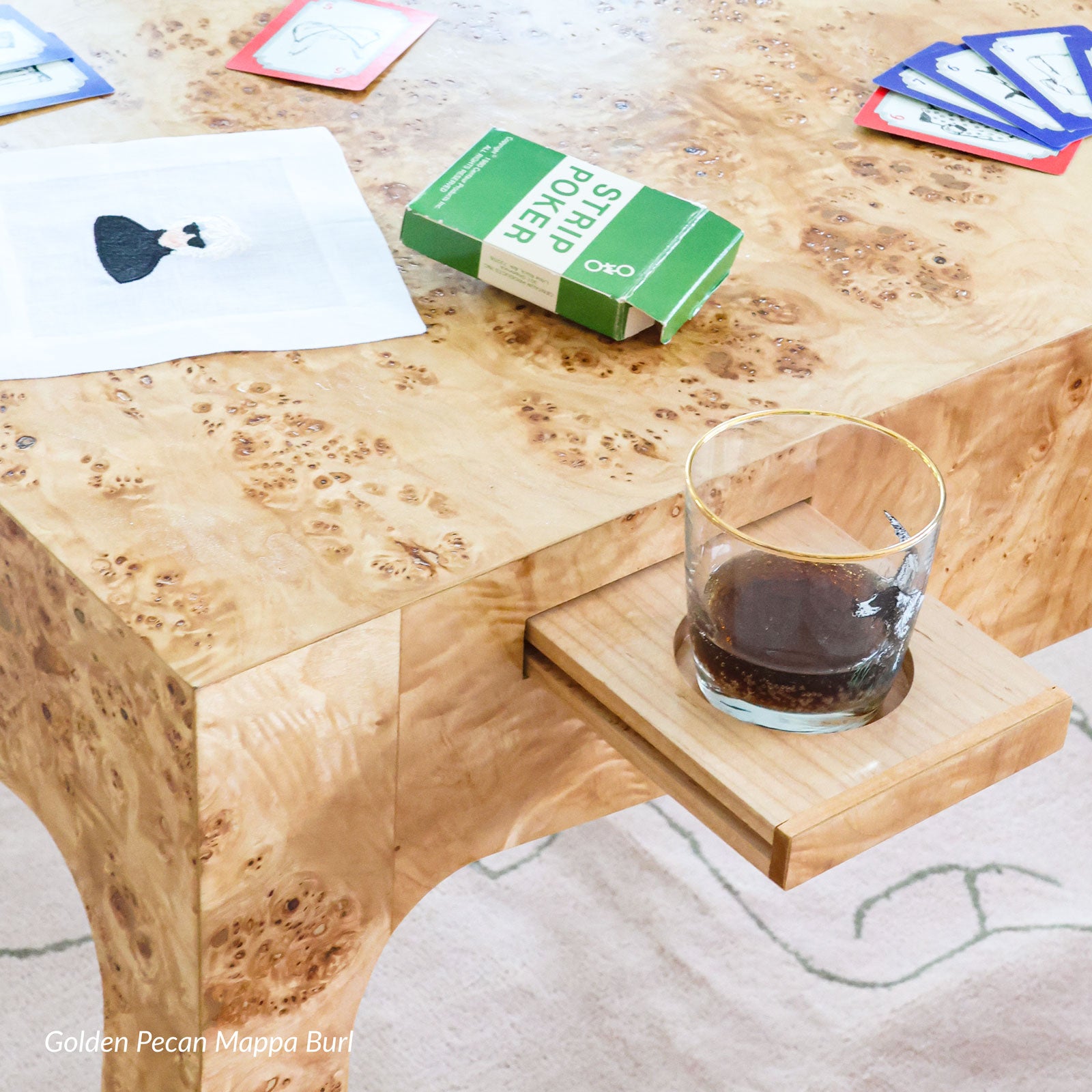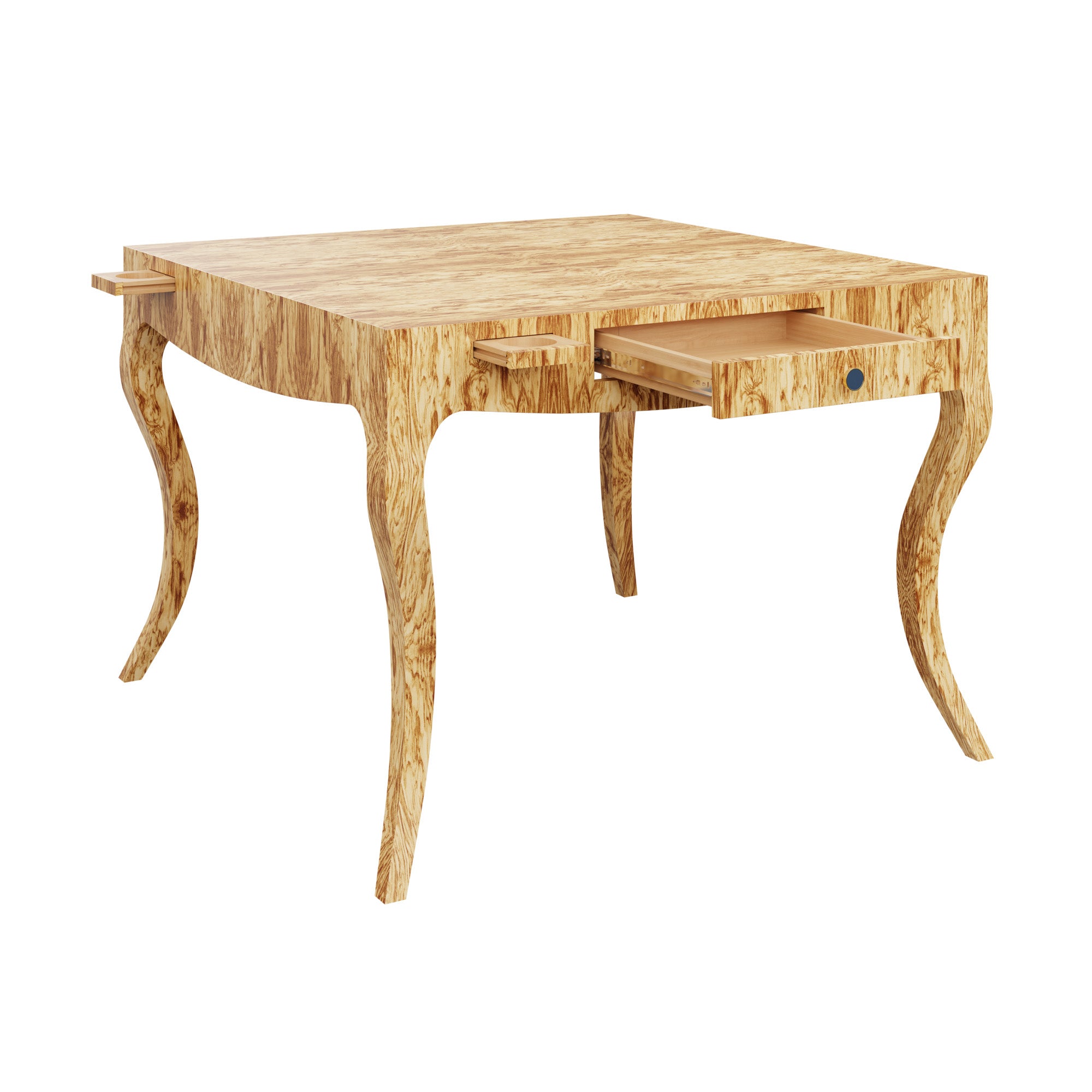 Our Champagne Problems Game Table features a subtle bowed front that gives way to stylized cabriole legs. 2 pull out drawers on opposite ends are the perfect place to store your game night essentials, while a smooth top is the ultimate throne for your favorite Mahjong set. 4 push-close cupholders to envelope your drink-of-choice ensure your place will be THE place for game night from here on out.