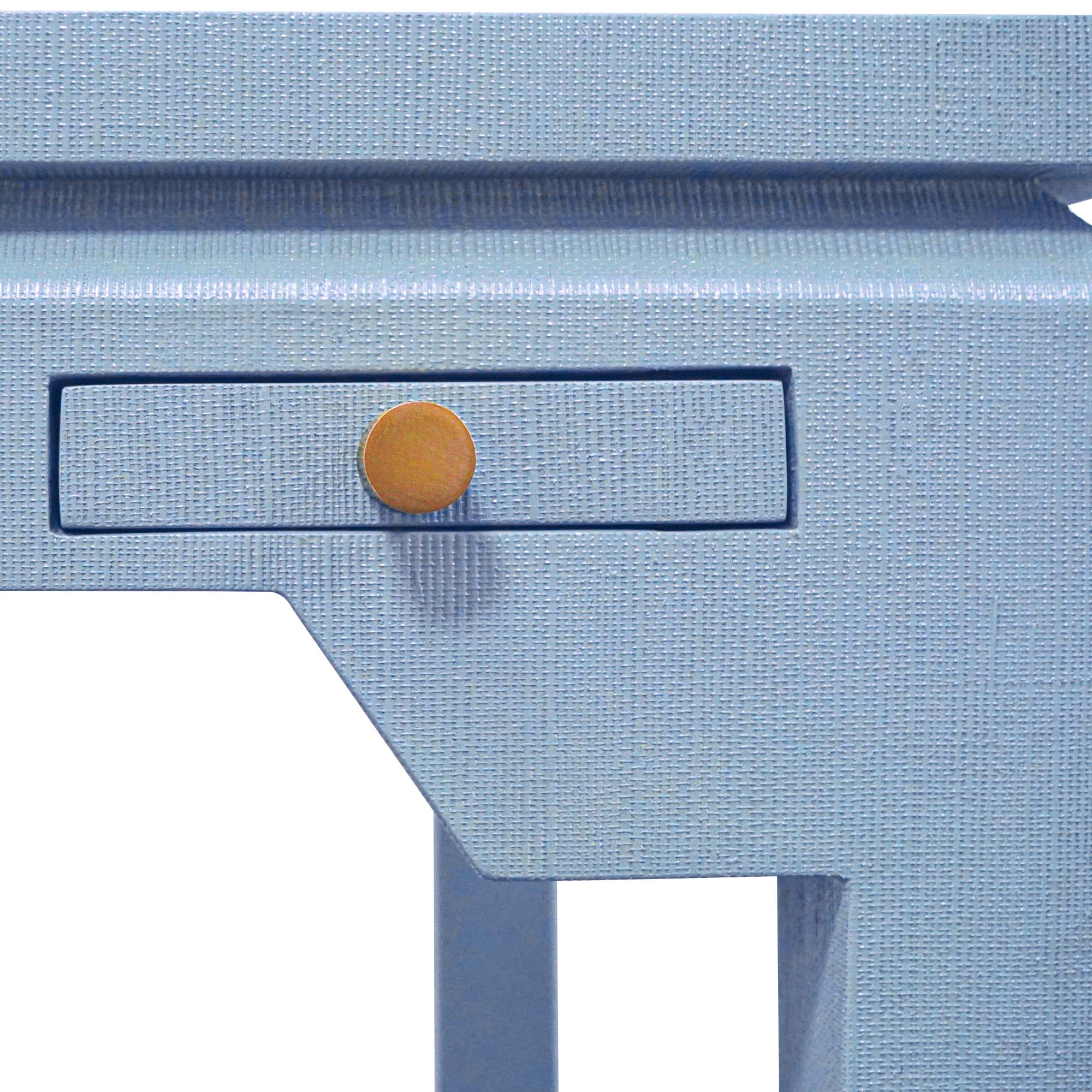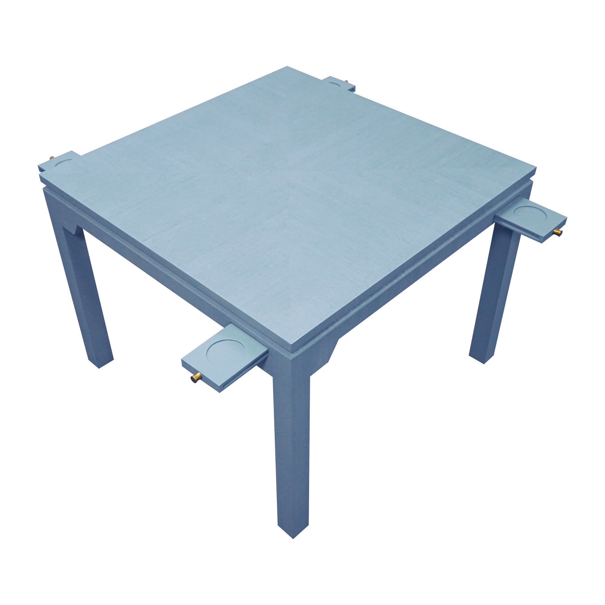 With 4 push-close coasters adorned in delicate brass pulls, our Pass the Rosé Game Table is at your service. Meanwhile, Parsons legs and unique corner details give this table major dimension and visual appeal. Featuring a stunning and durable blue faux linen, this one's got extra intrigue with the finish going in opposing directions atop.