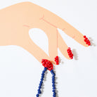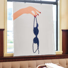 Made in the Tat Frederick studio, Somethin's Gotta Give features a printed illustration on canvas with hand-pinned blue and red buttons depicting a woman holding her bra. Framed in an acrylic shadowbox.