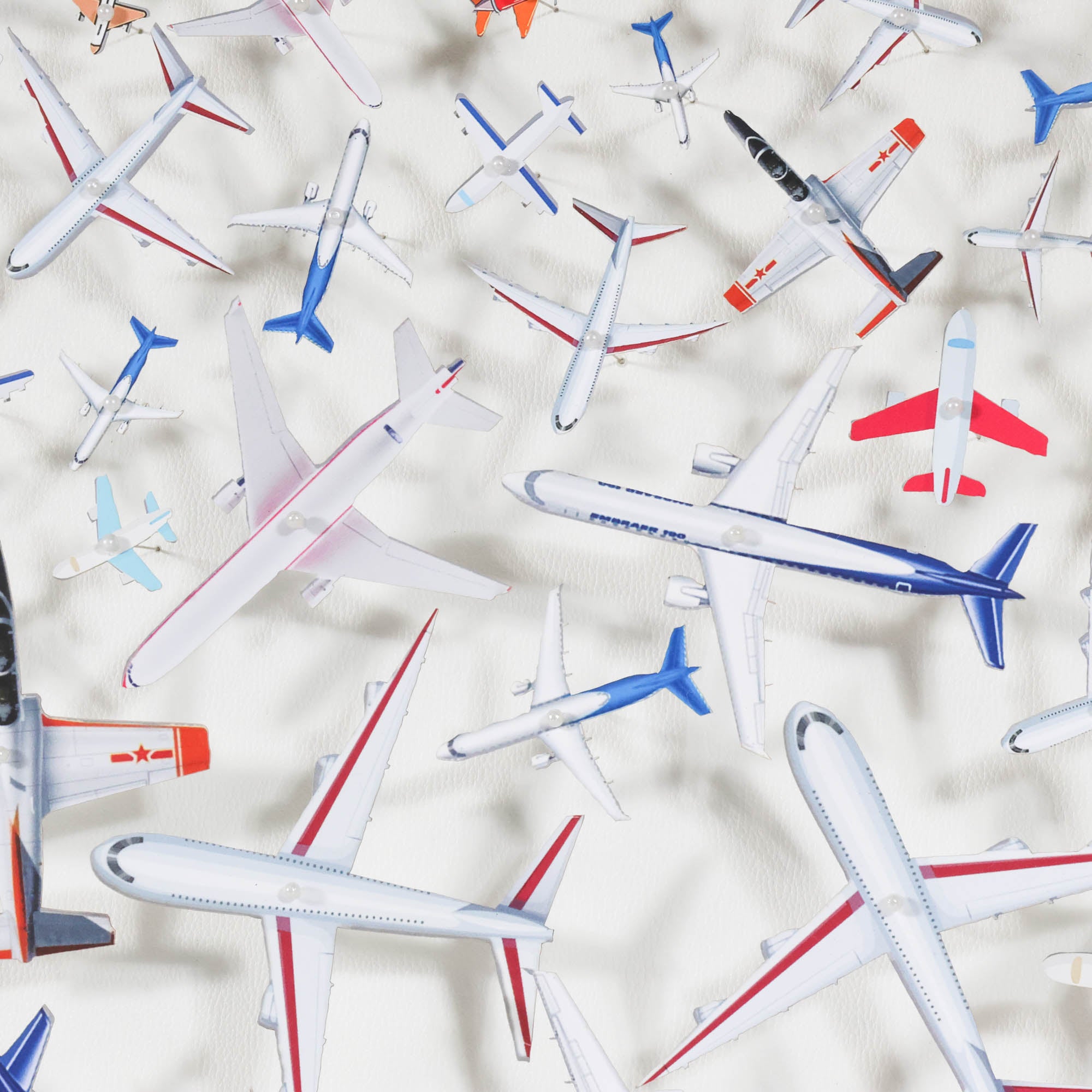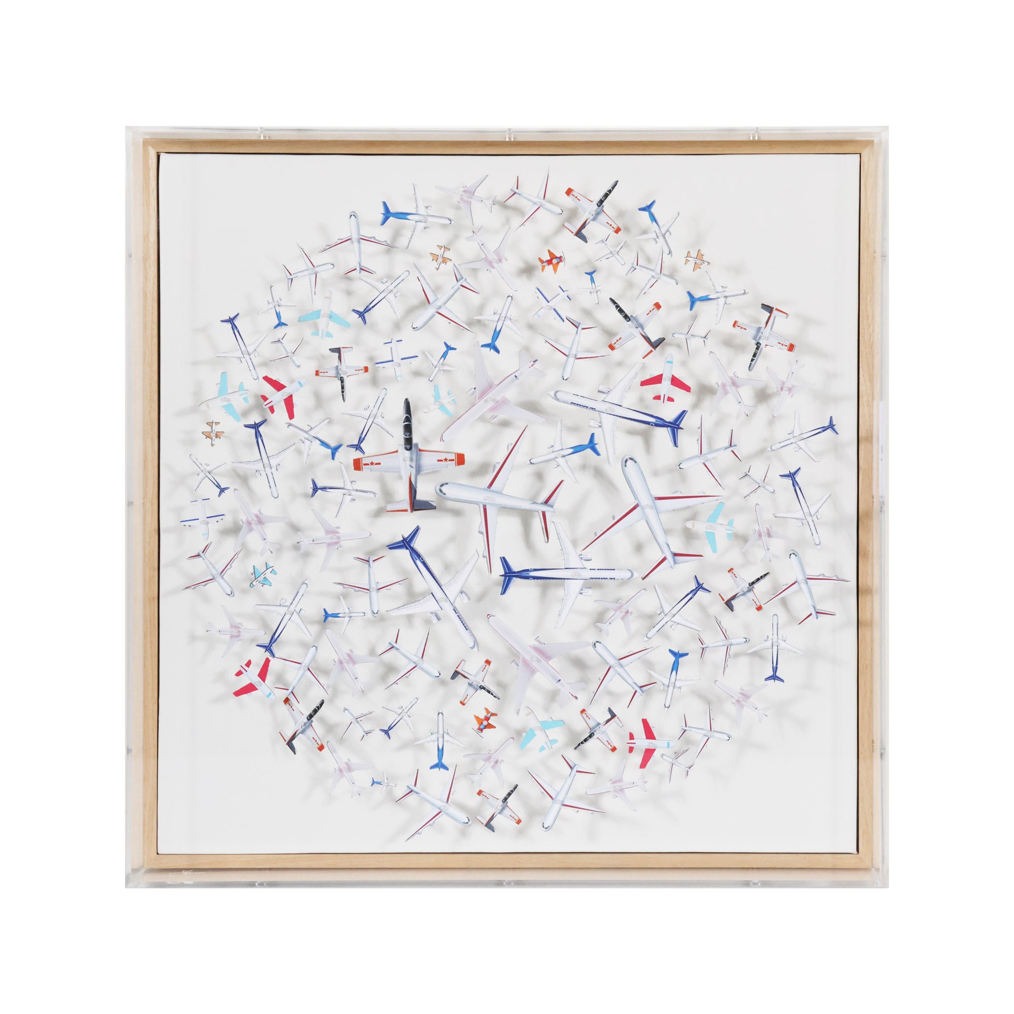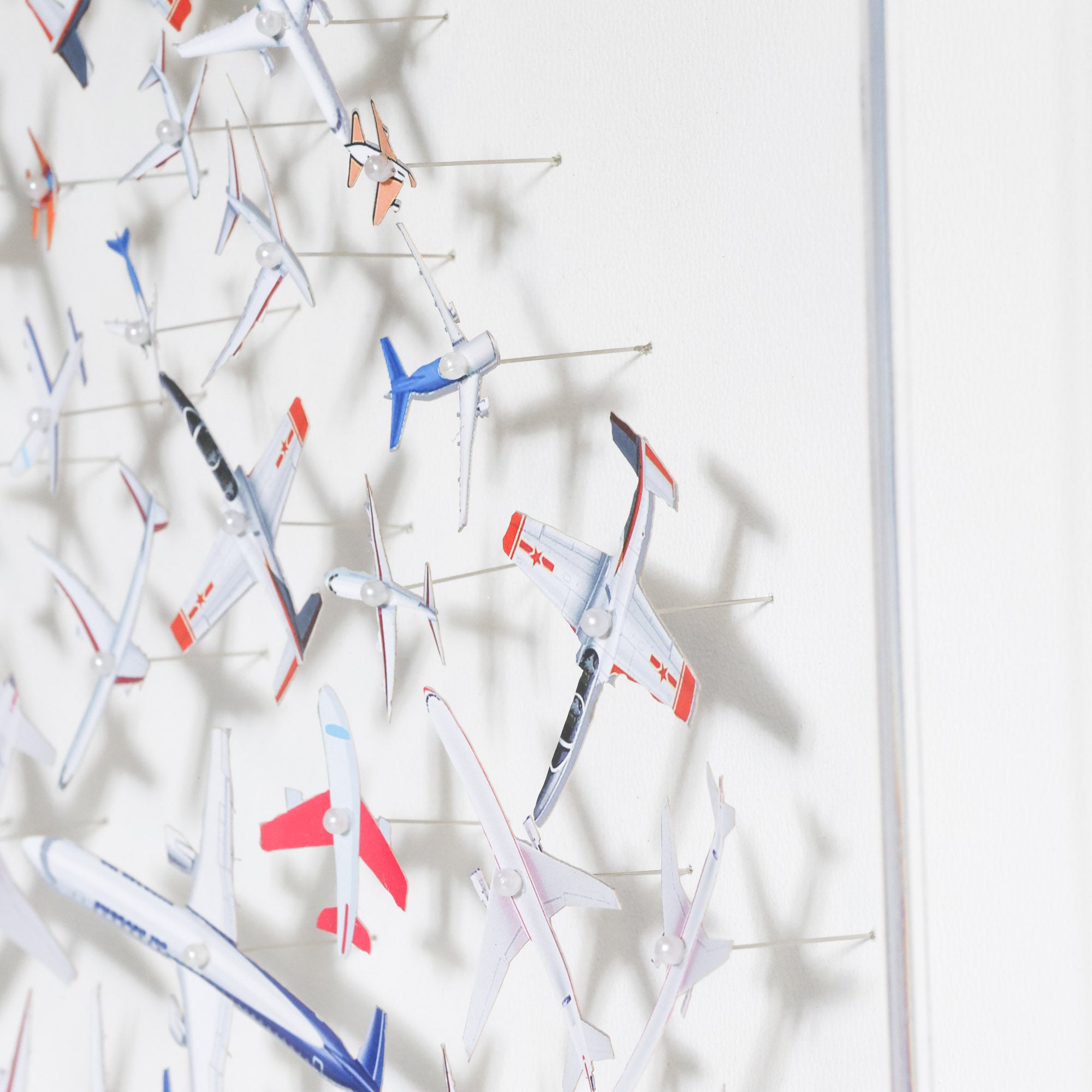 Printed airplanes are hand-cut and individually pinned to a white canvas. Each piece is handmade and will have some variations in color and finish. Framed in blonde wood with an acrylic shadowbox.