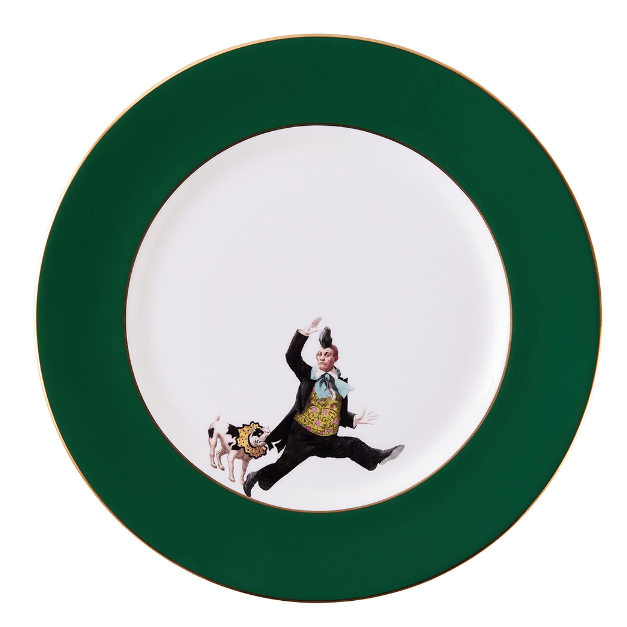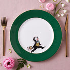 An exquisitely handcrafted fine bone china dinner plate featuring the circus inspired Alphonso design from ‘The Show Must Go On’ collection and a bold and beautiful Forest Green border.