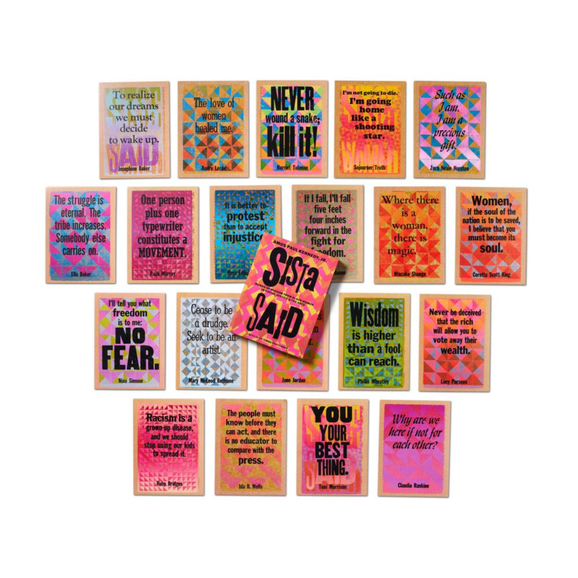 A set of vibrant postcards from letterpress printer Amos Paul Kennedy, Jr., celebrating powerful words from Black women—from Sojourner Truth to Rosa Parks, from Harriet Tubman to Nina Simone.